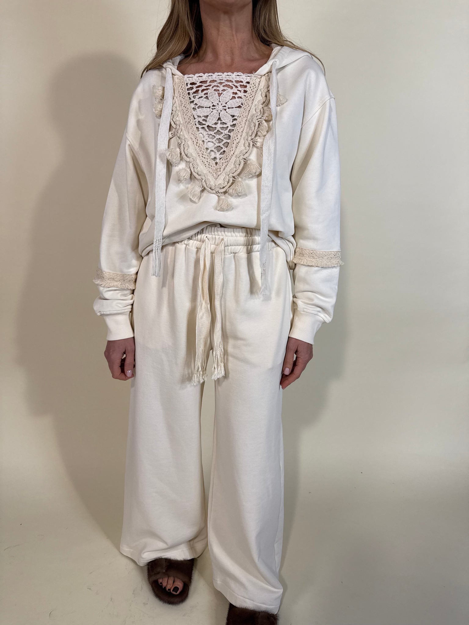 Felpa garzata modello con cappuccio disponibile nella variante colore unica crema. Modello con dettaglio ricamo frontale con nappe tono su tono. Chiusura cappuccio con coulisse. Dettaglio ricami sulla manica.