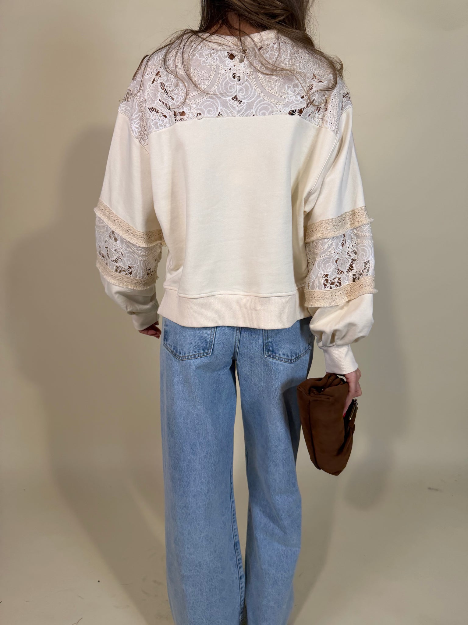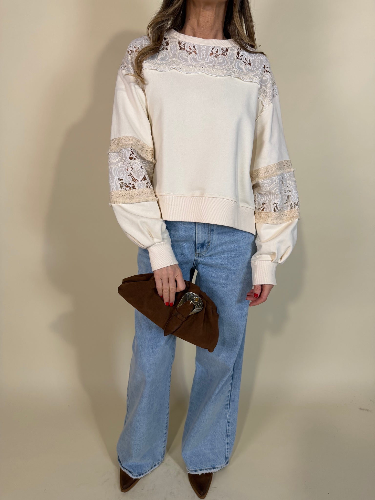 Felpa garzata disponibile nella variante colore unica crema modello girocollo. Modello con inserto in pizzo tono su tono. Manica con inserto in pizzo e nappe sfrangiate.