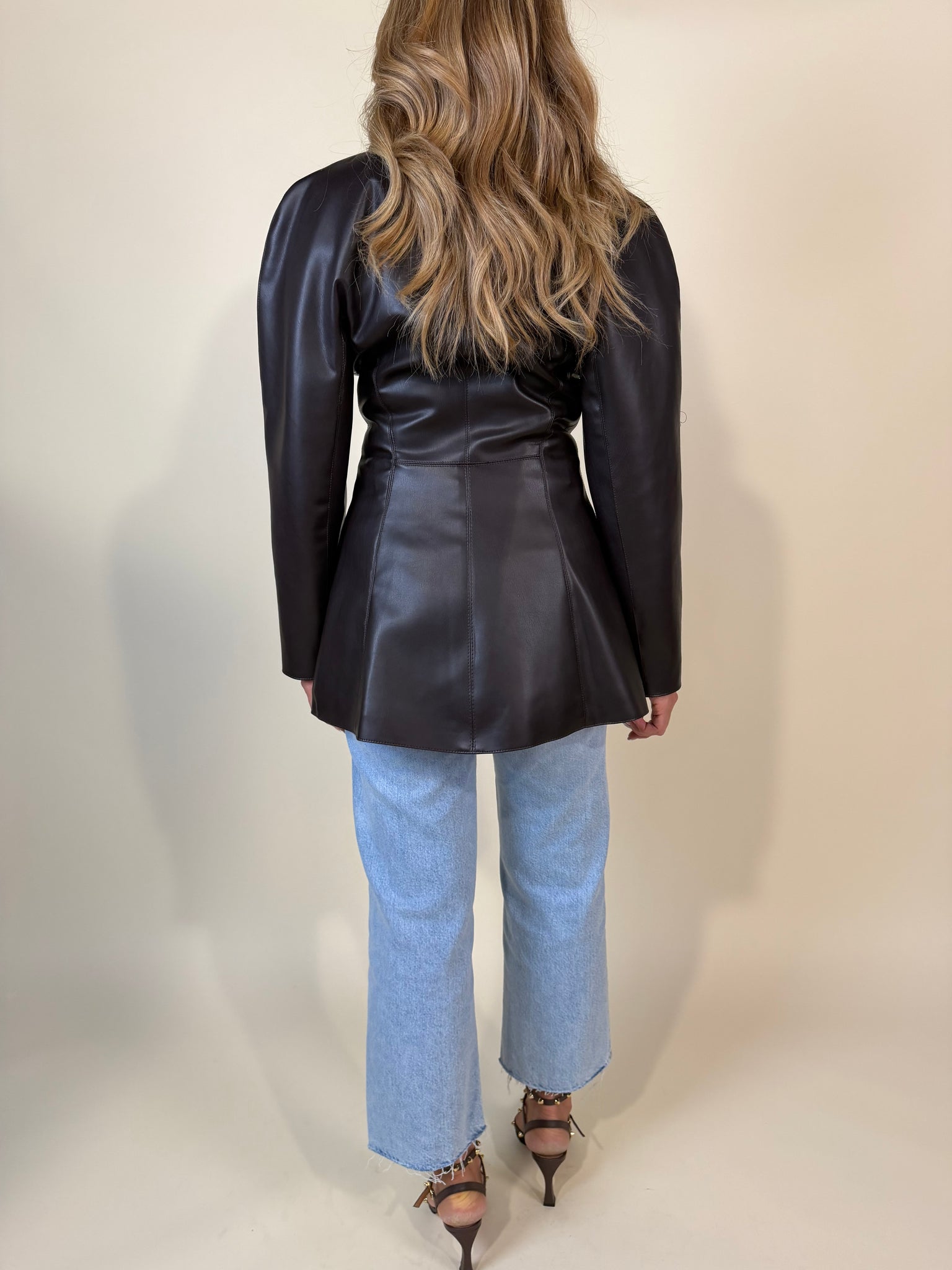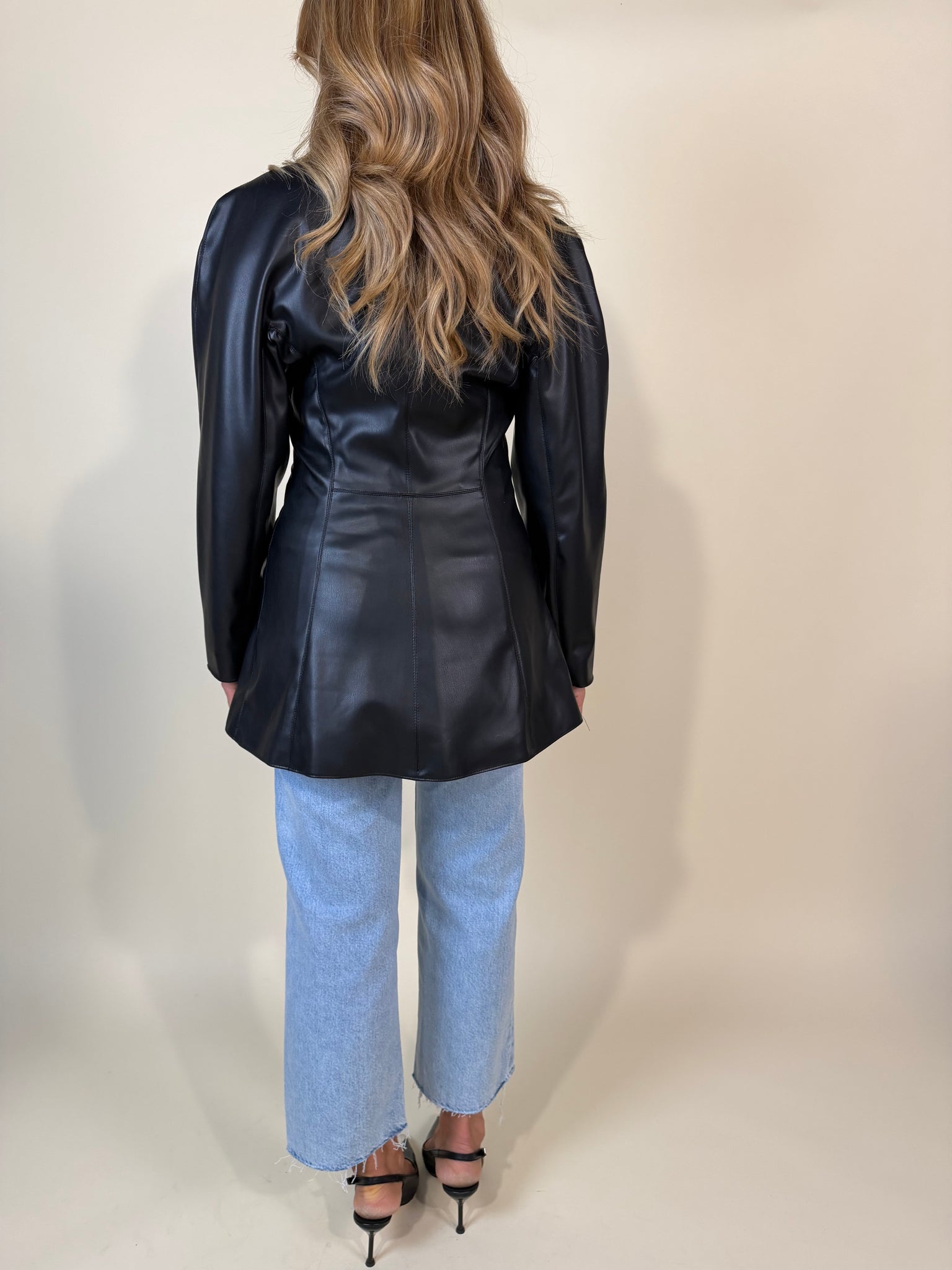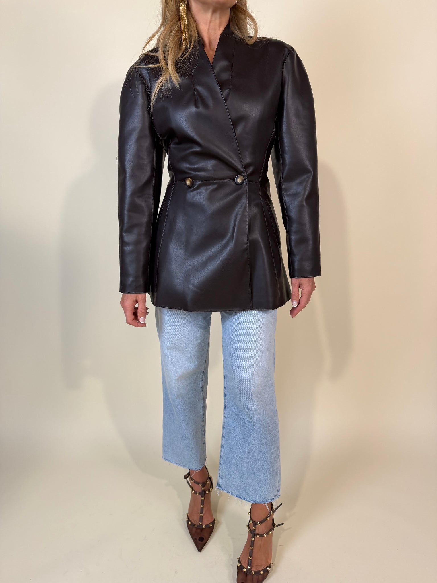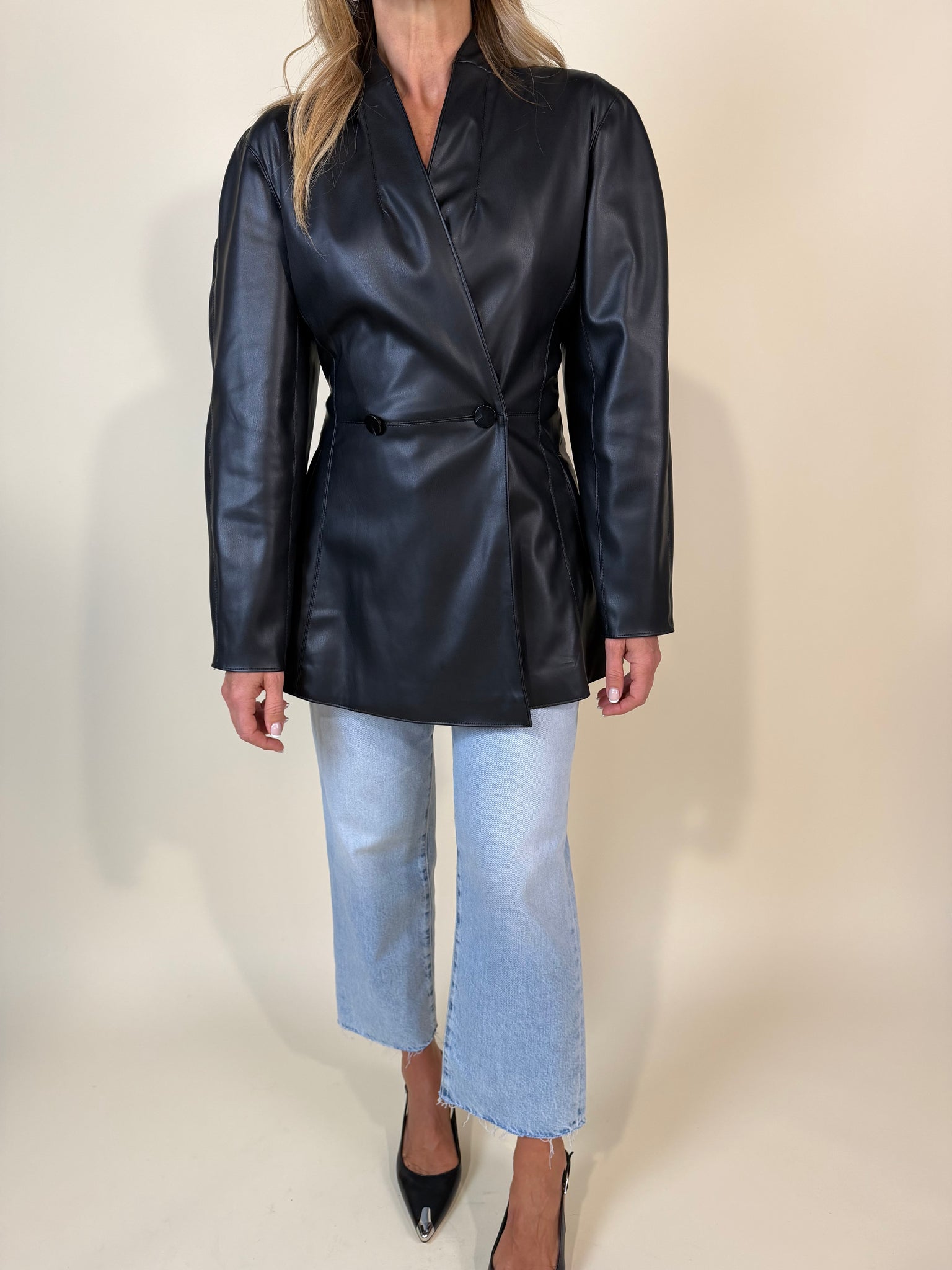Giacca modello lungo disponibile nelle varianti in ecopelle moro e nero. Modello con doppia chiusura a bottone laterale. Rever liscio e scollo liscio. Fodera interna. Dettaglio tasche applicate laterali.