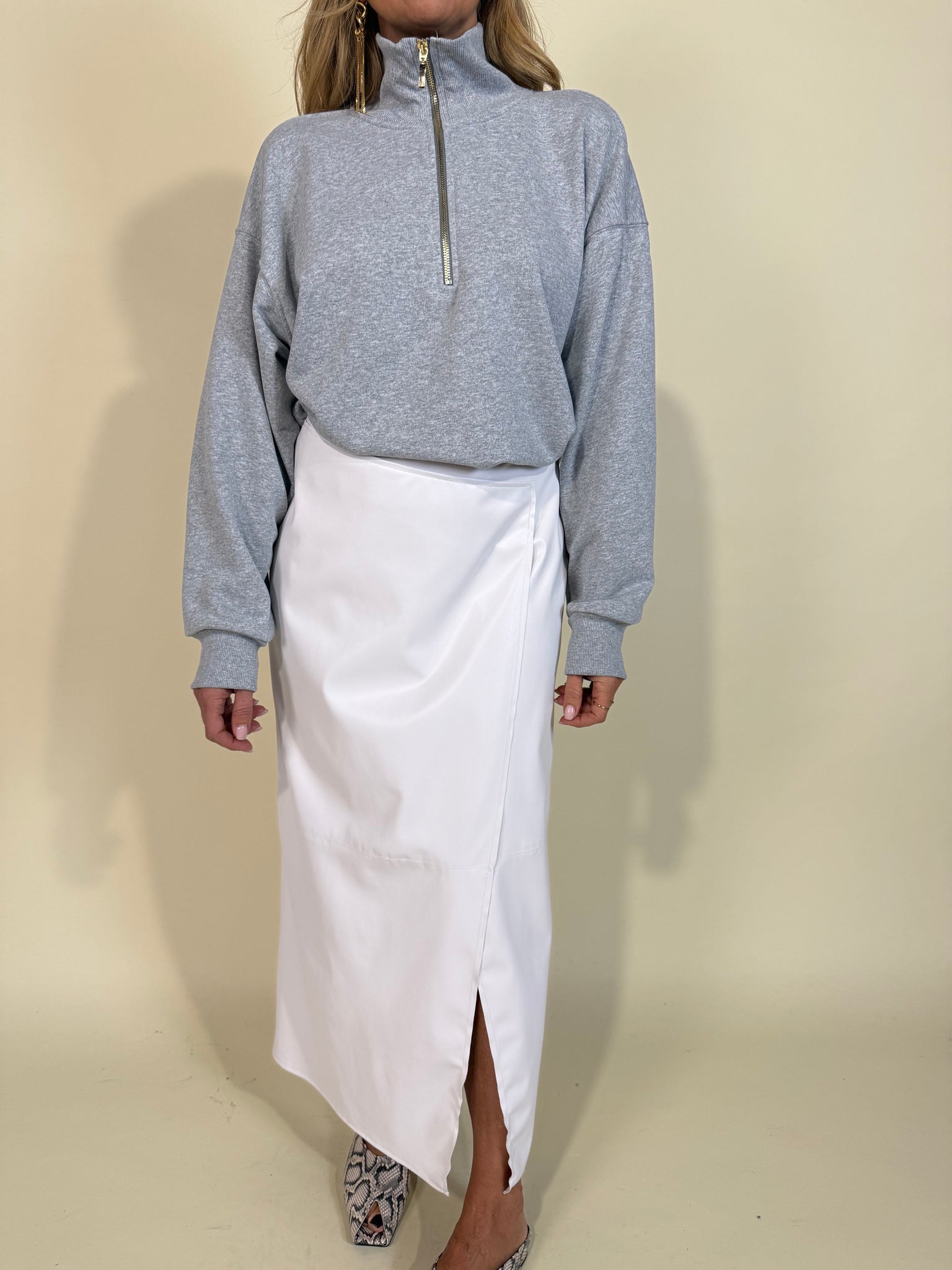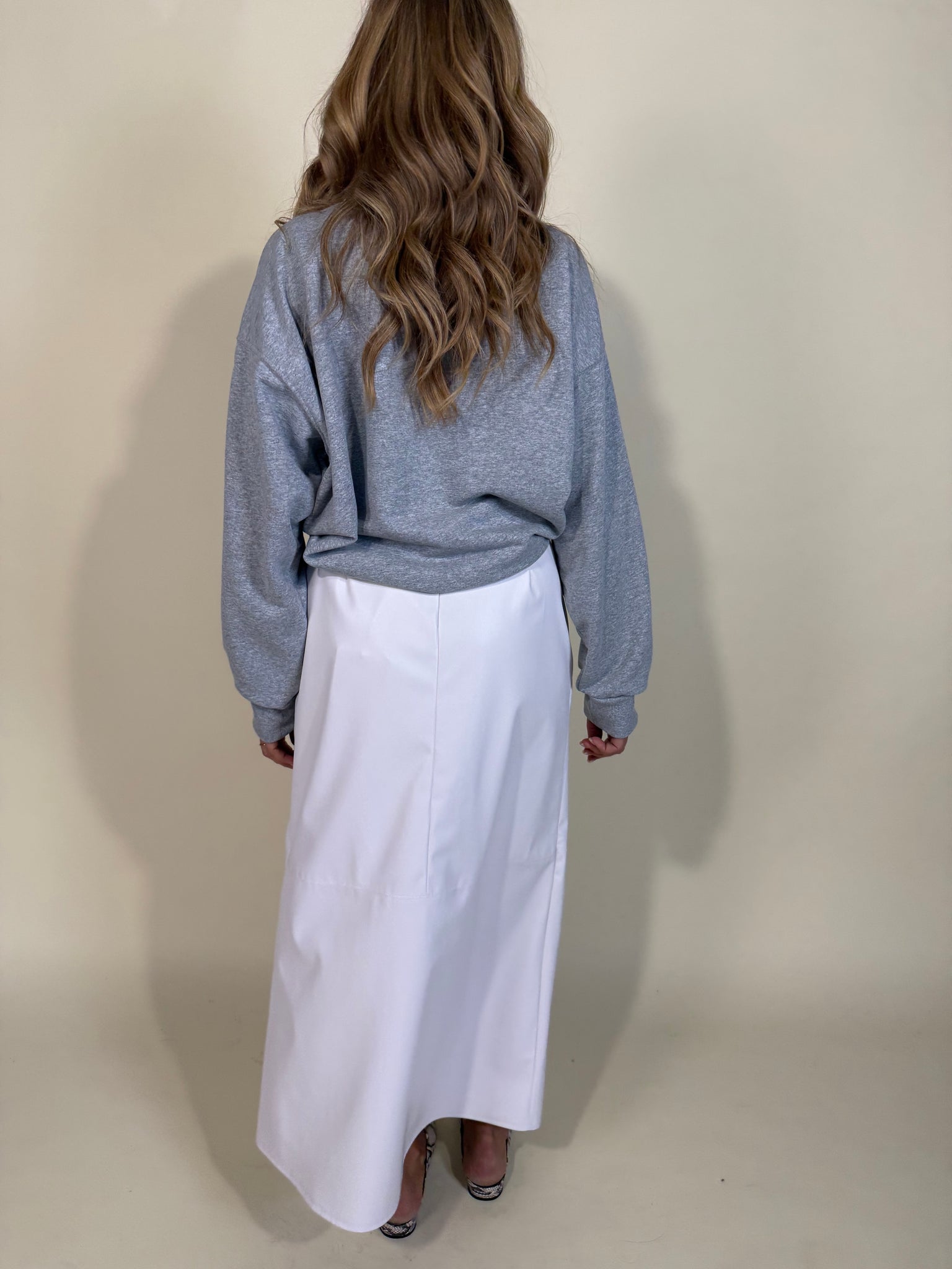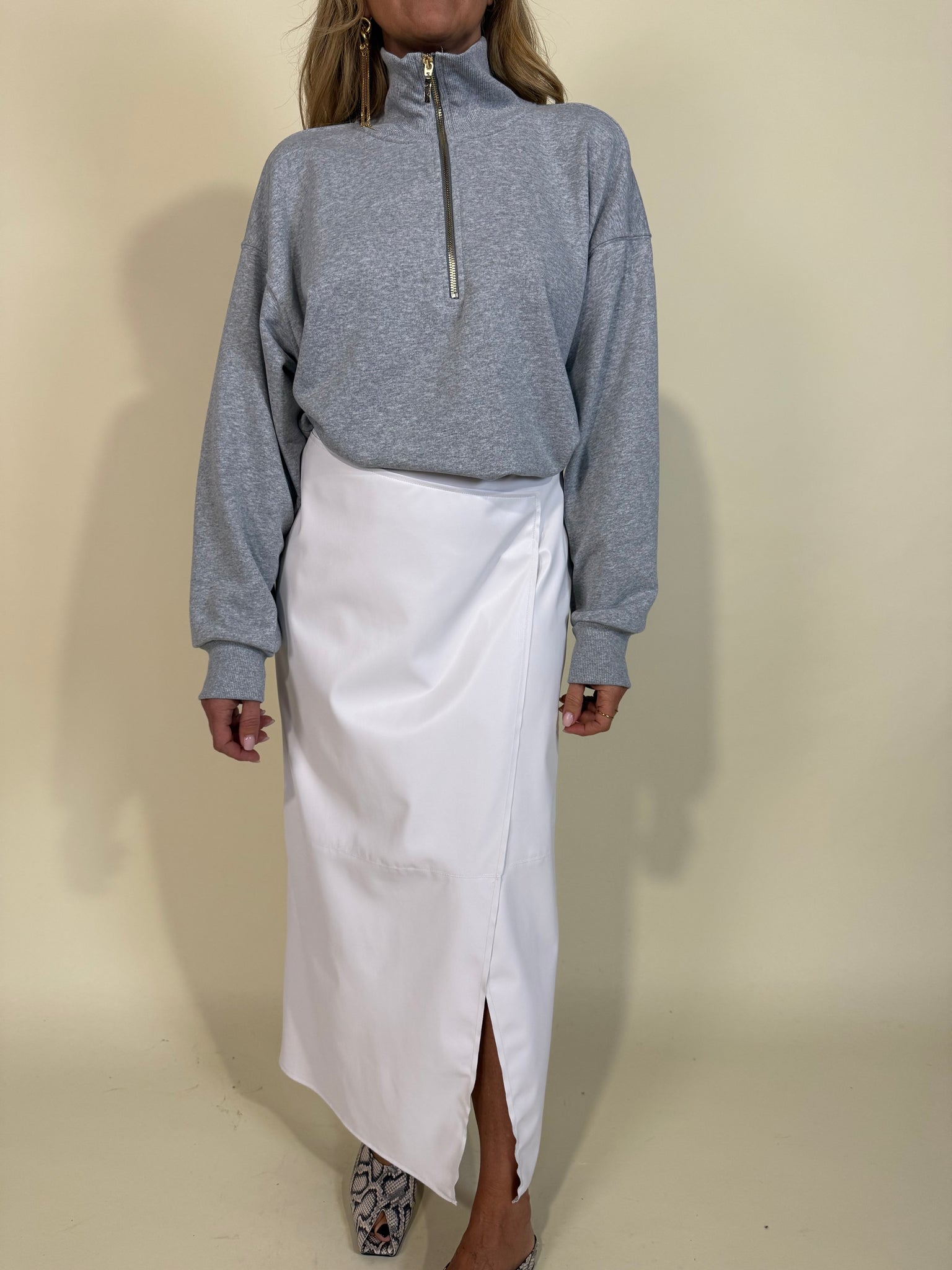 Gonna modello longuette in ecopelle nella variante colore unica bianca con dettaglio cuciture a vista tono su tono. Modello con spacco laterale a portafoglio con cucitura. Modello con chiusura a zip sul retro gonna.