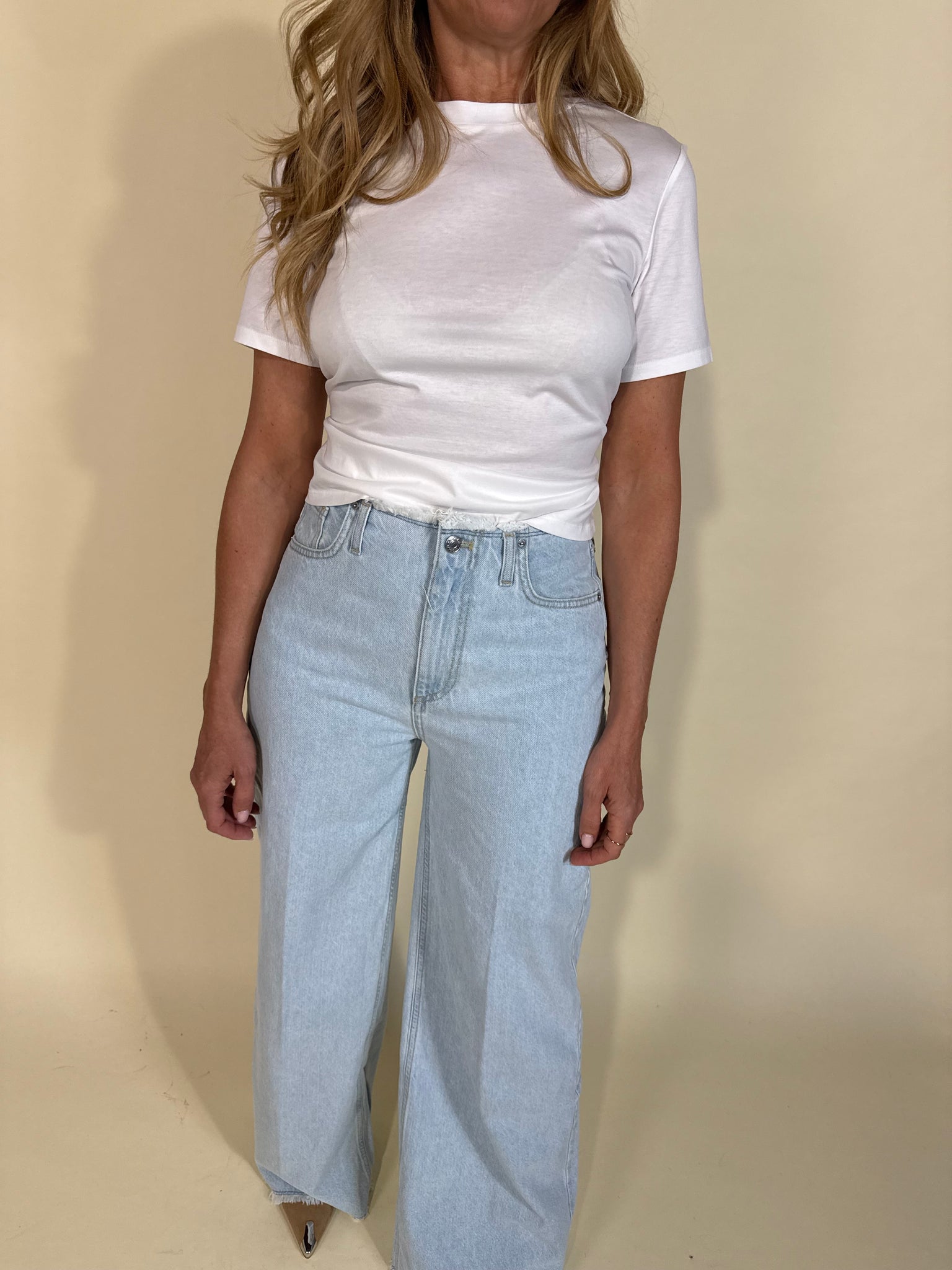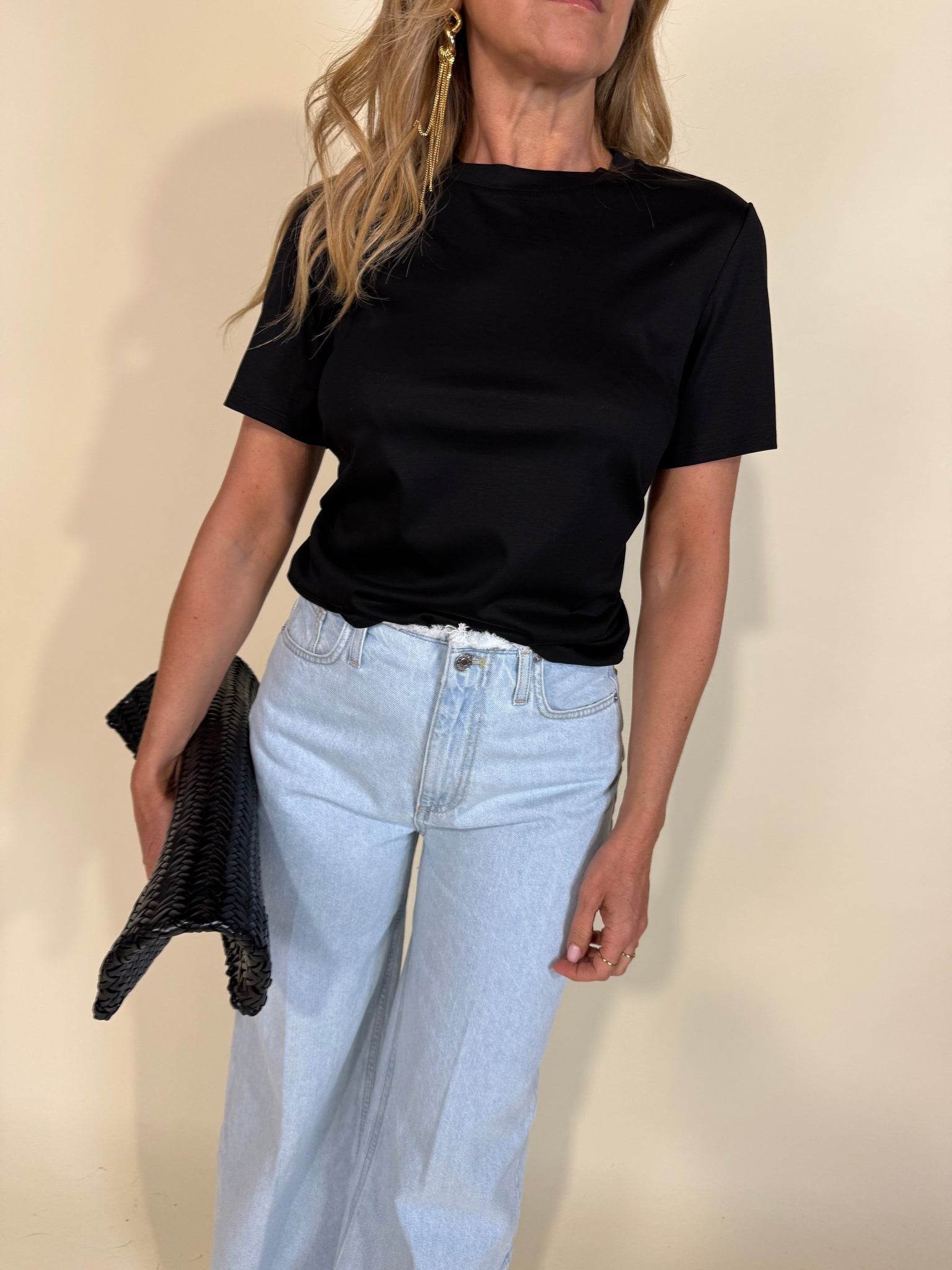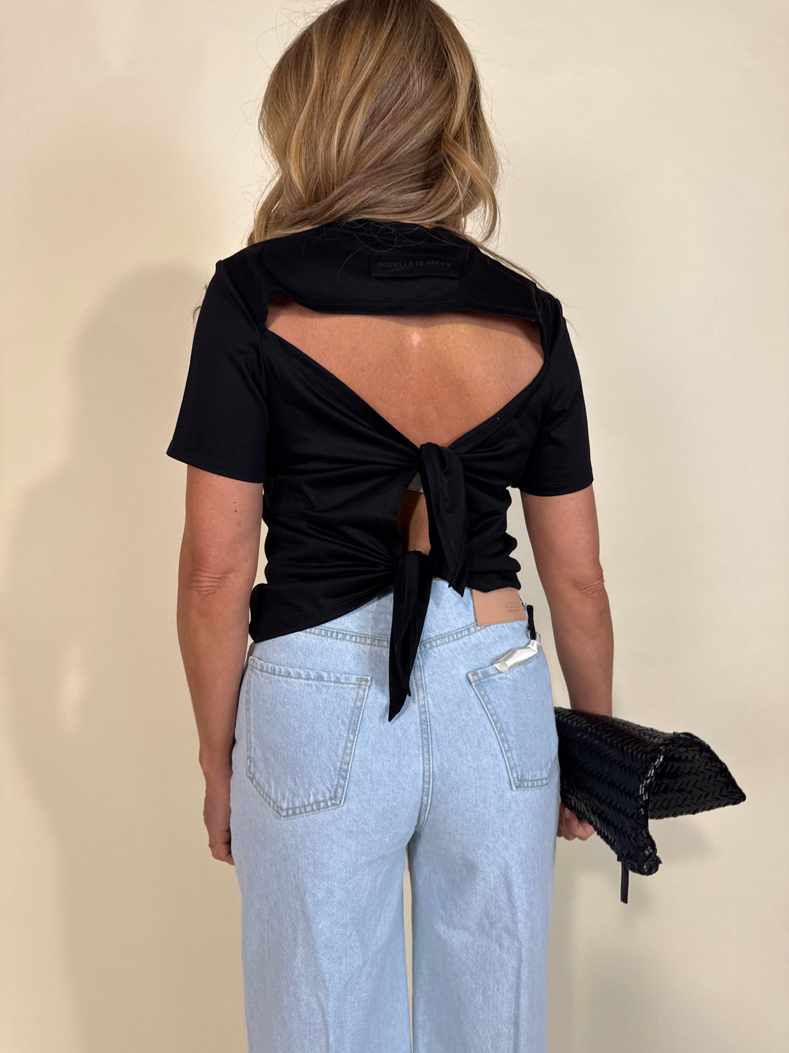 T-shirt in misto cotone disponibile nella variante colore nera o bianca gesso. Modello con dettaglio nodo da allacciare sul retro maglia. Modello oversize.