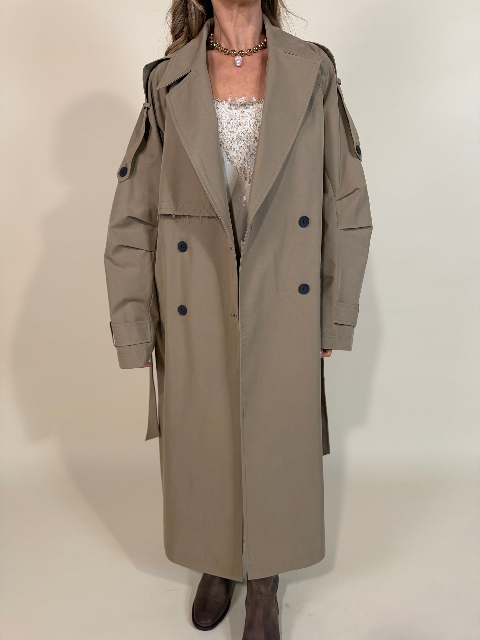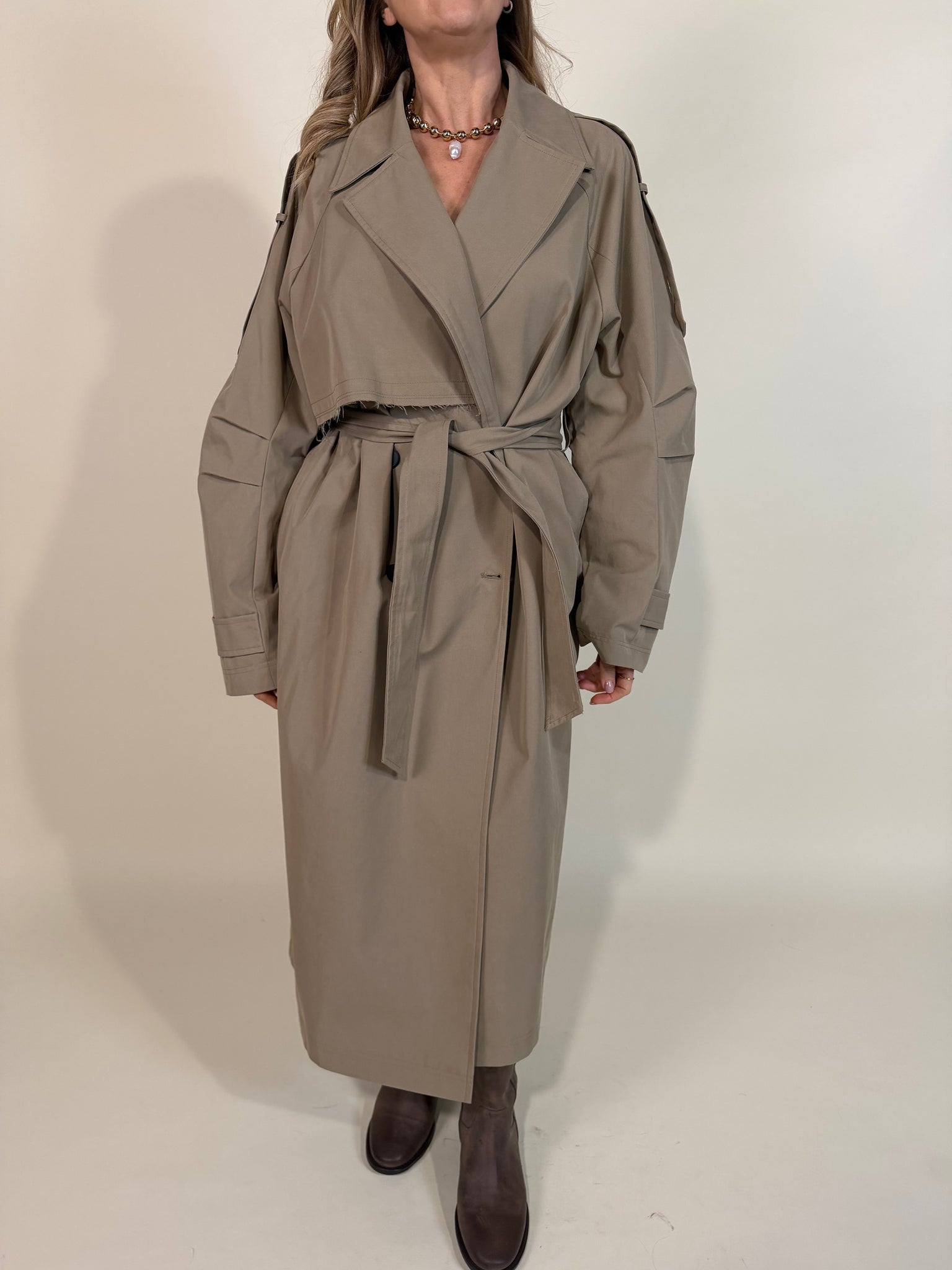 Trench lungo modello doppiopetto disponibile nella variante colore unica cammello. Dettaglio rever morbido ampio. Modello ampio modulabile con la cintura tono su tono a passanti da stringere in vita. Dettagli trench applicati frontali e sulle spalle. Maxi dettaglio sul retro con patta tagliata a vivo sul profilo. Fodera interna tono su tono.