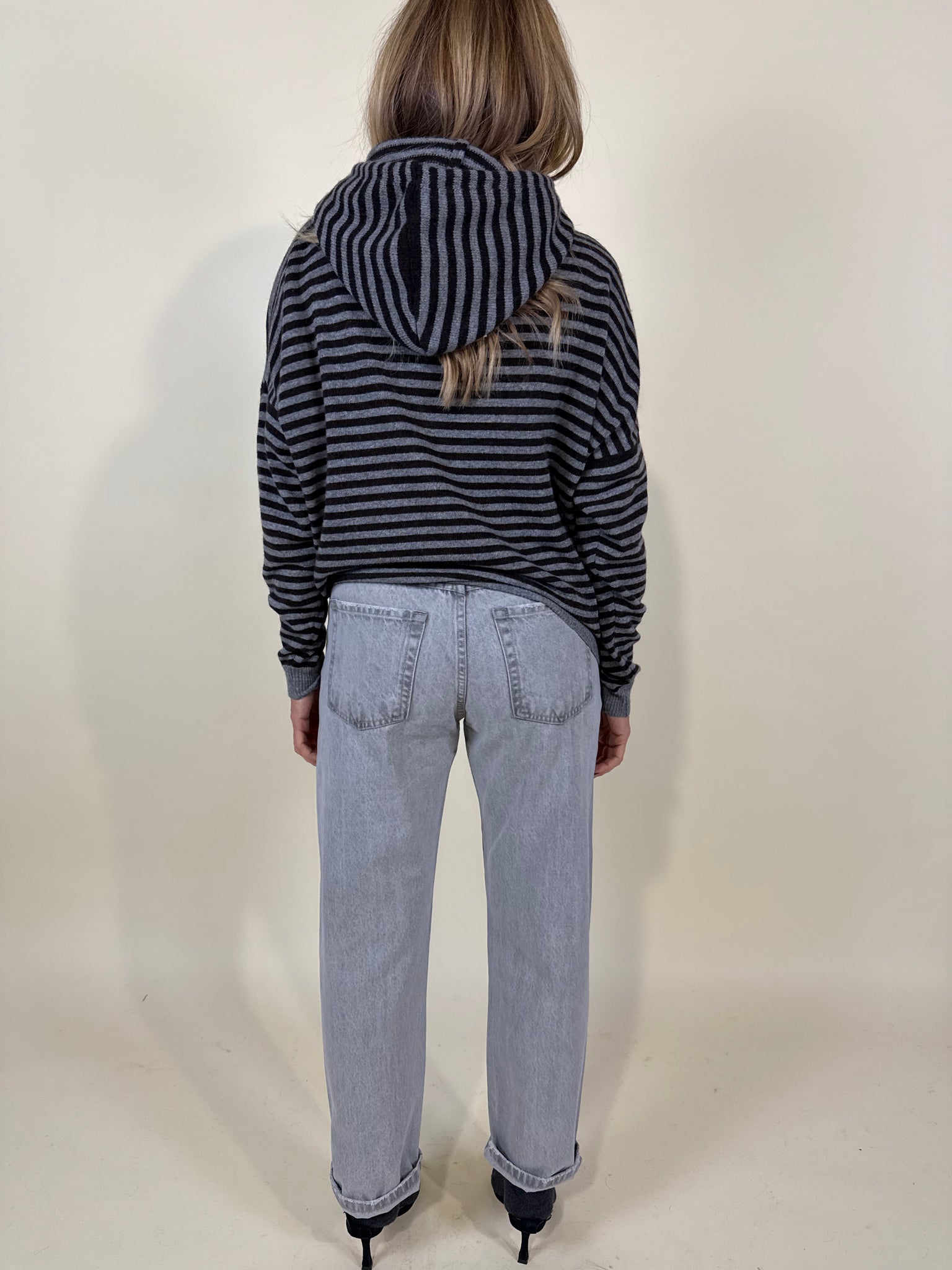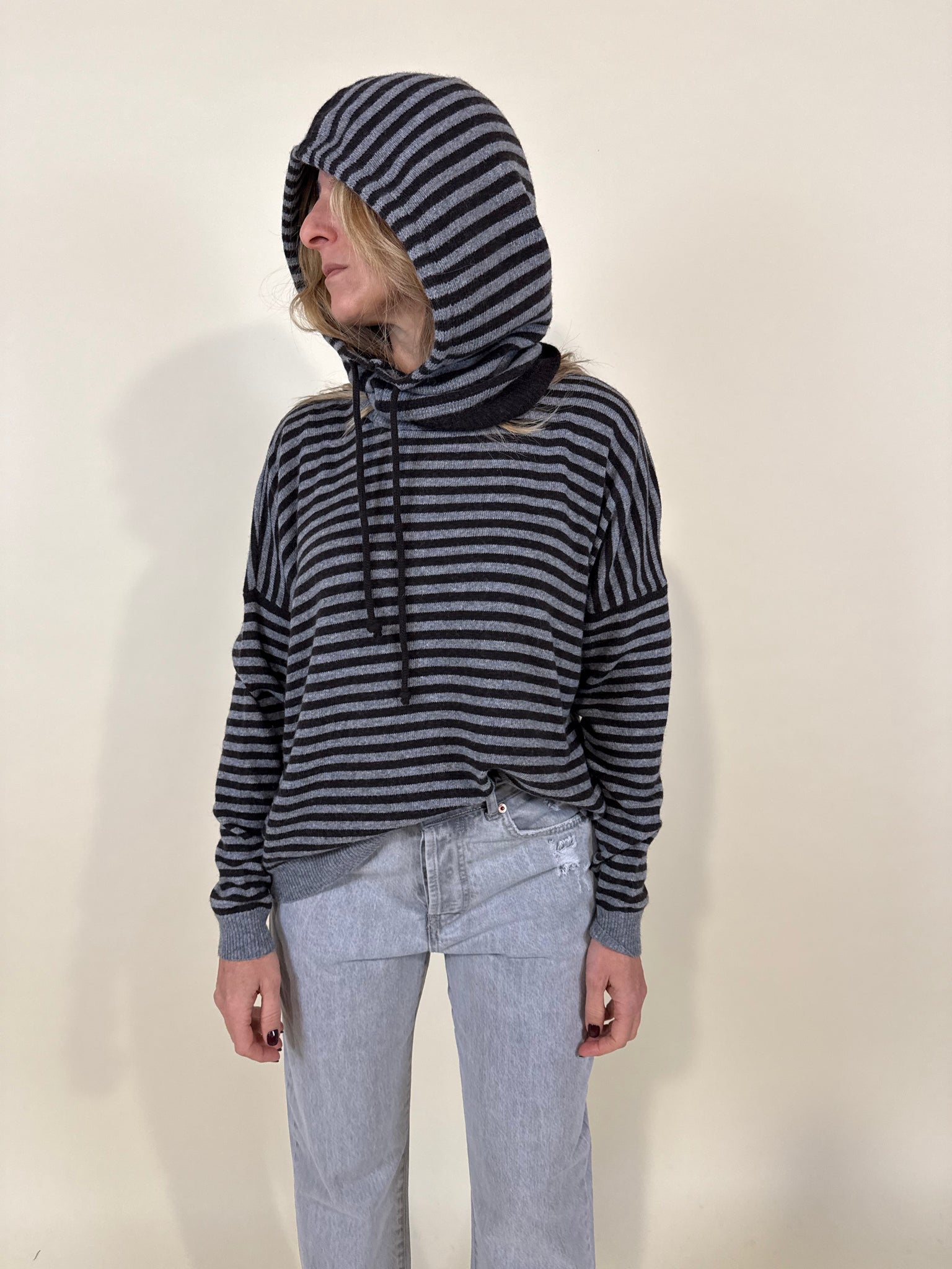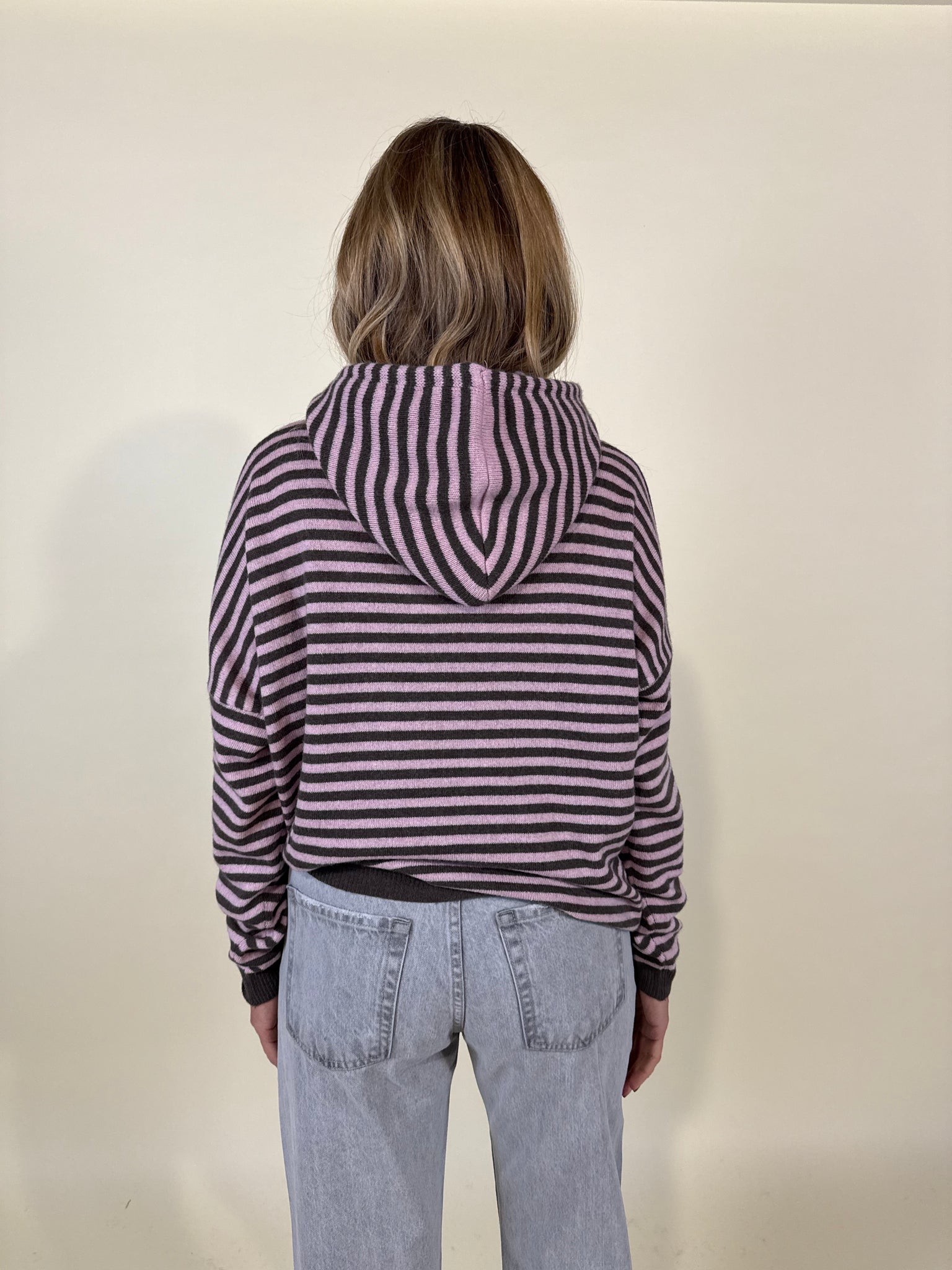 Balaclava copricapo in misto lana e cashmere disponibile nelle varianti a righe sul panna e beige, grigio e moro, rosa e moro oppure bordeaux e blu notte. Modello con fondo ad elastico e arricciatura con laccetti.