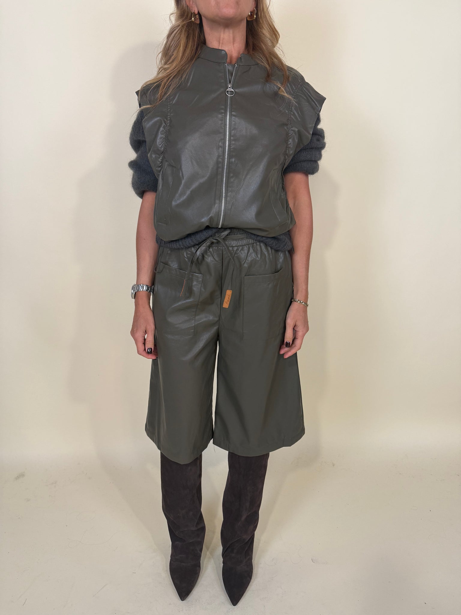 Gilet modello in ecopelle nella variante colore kaki. Modello girocollo con mezza manica a sbuffetto arricciato. Chiusura con zip centrale in metallo. Fodera interna.