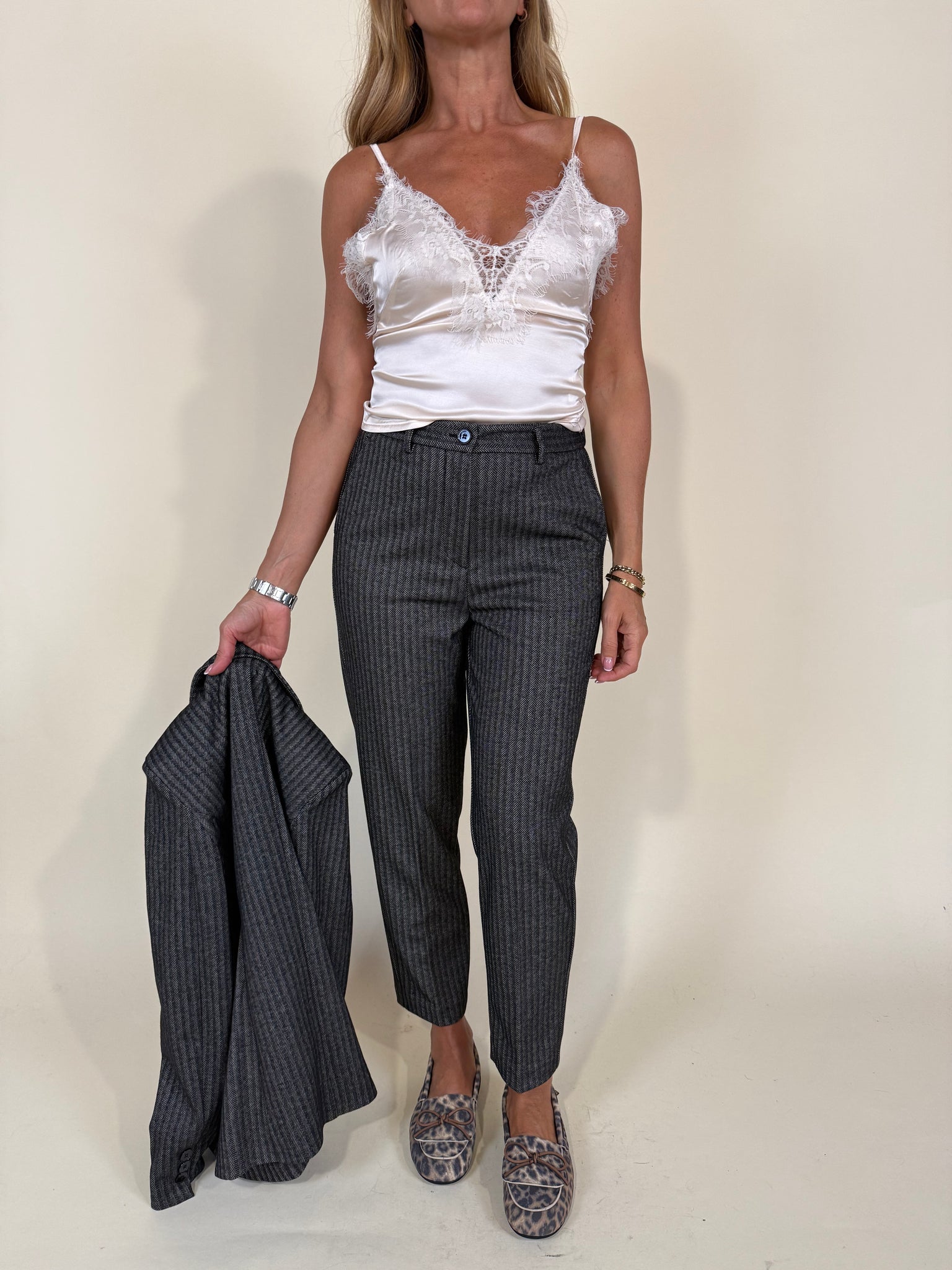 Pantalone modello sartoriale nei toni del grigio scuro in trama spinata piccola. Chiusura con bottone centrale tono su tono. Elastico sul retro pantalone. Tasche taglio classico applicate.