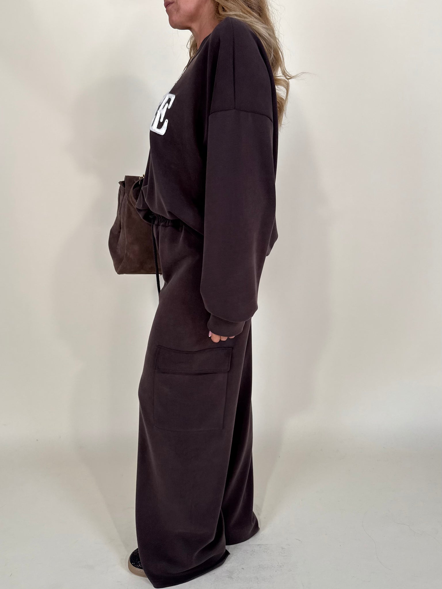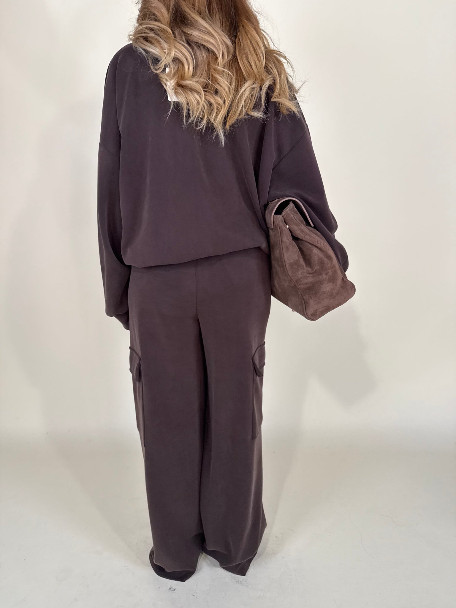 Pantalone modello jogger disponibile nella variante colore moro. Modello con gamba ampia ed elastico in vita con coulisse tono su tono. Dettaglio maxi tasca sulla lunghezza gamba. Tessuto simil modal spalmato.