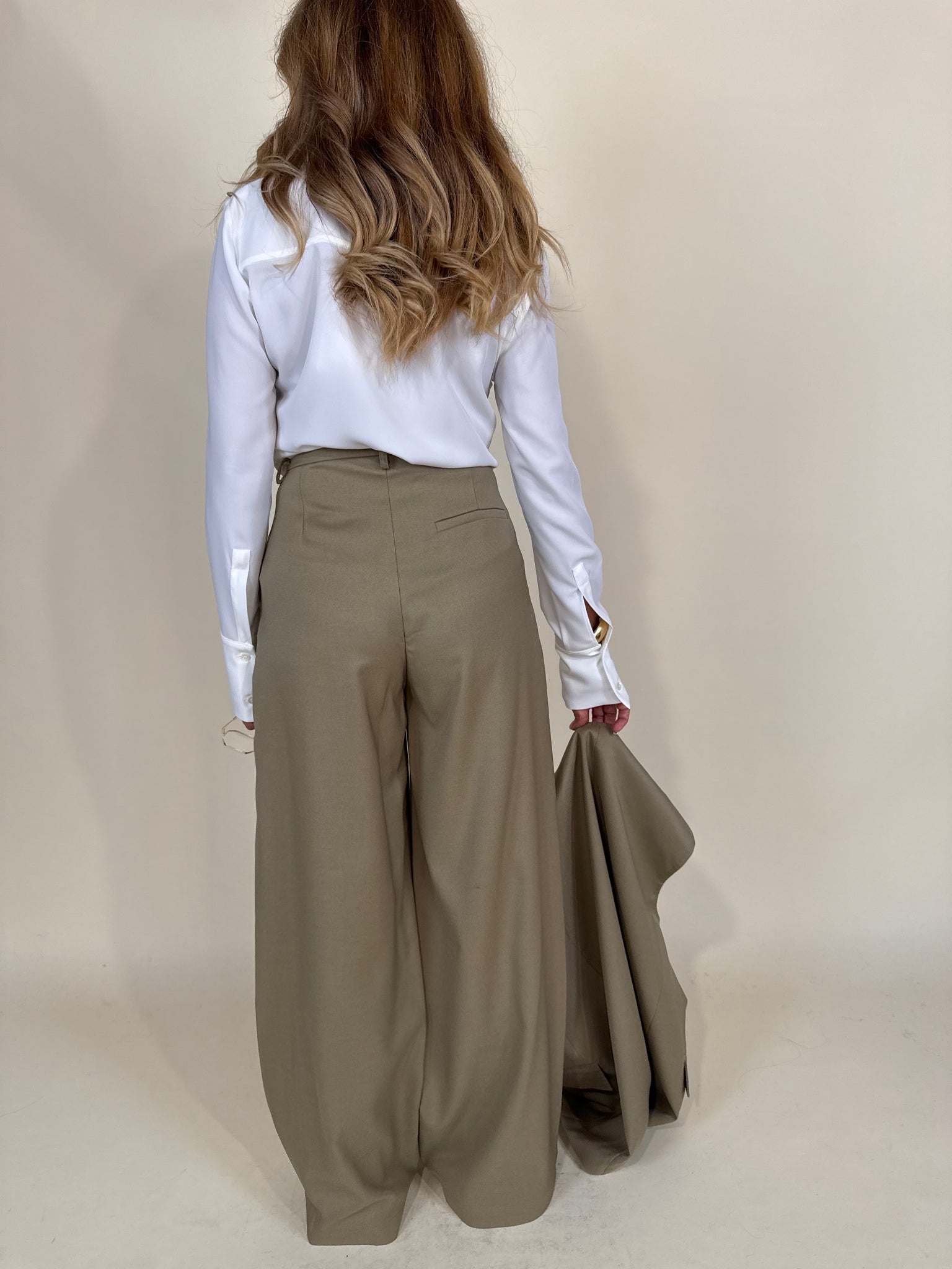 Pantalone modello gamba ampia disponibile nella variante colore verde oliva. Modello taglio classico con dettaglio pences frontali. Tasche applicate laterali a cucitura. Chiusura con zip centrale e bottone unico a contrasto. Passanti tono su tono.