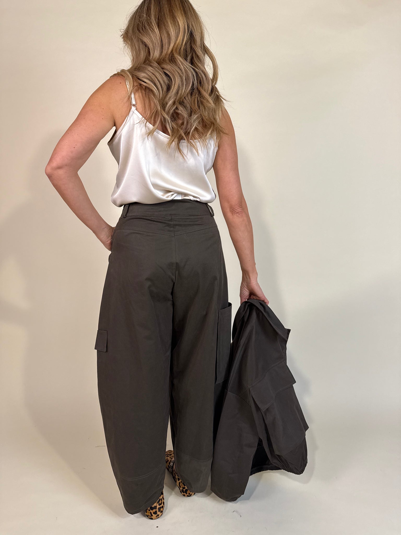 Pantalone in cotone modello balloon gamba ampia disponibile nella variante colore unica moro. Modello in tessuto simil spalmato. Modello con dettagli cargo tasconati sulla gamba e cuciture a vista. Modello con chiusura con zip centrale e bottone unico nascosti.
