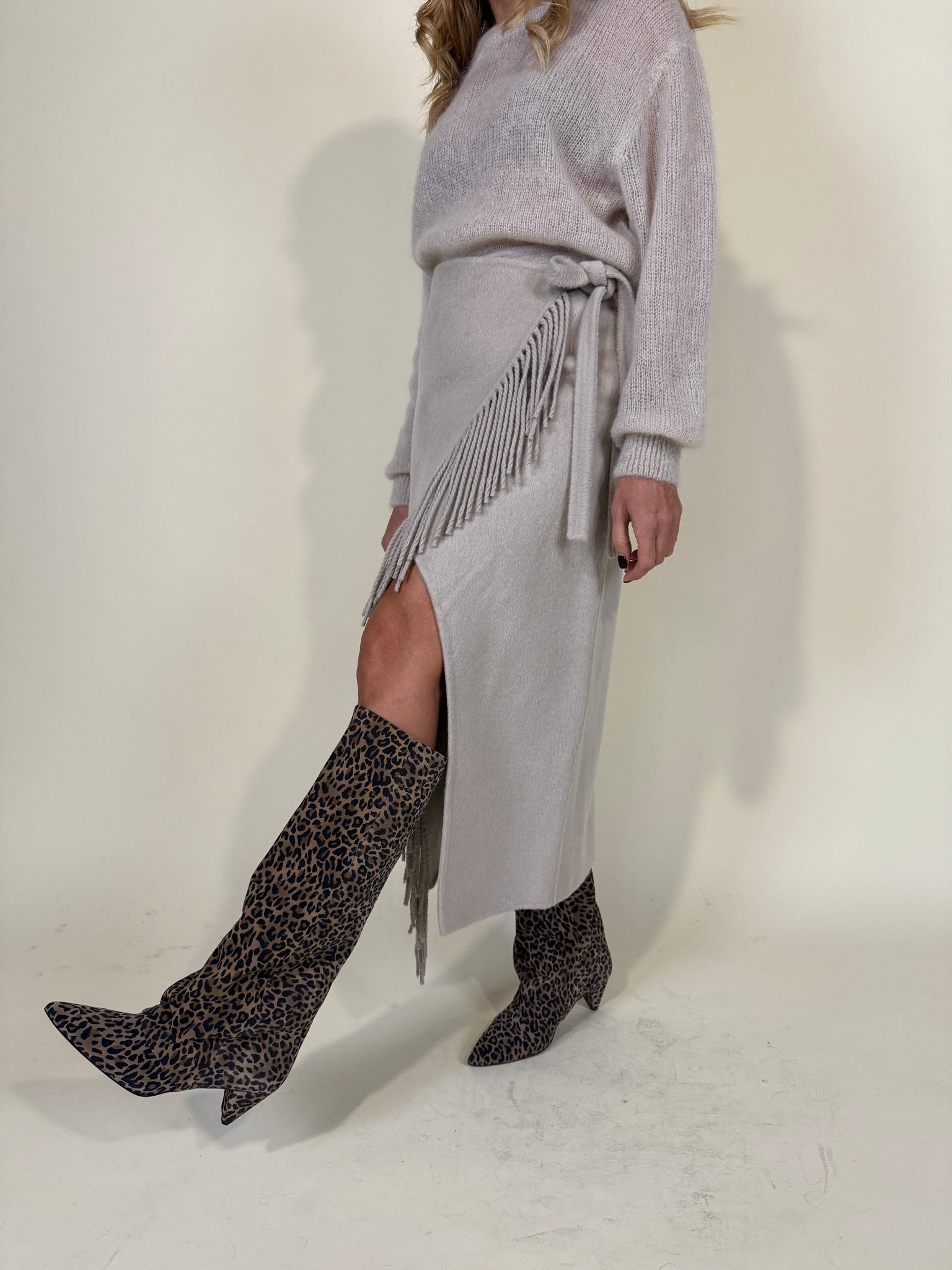 Stivale gambale alto in tessuto scamosciato in stampa animalier micro sui toni del cammello e nero. Modello tubolare morbido con tacco asimmetrico.