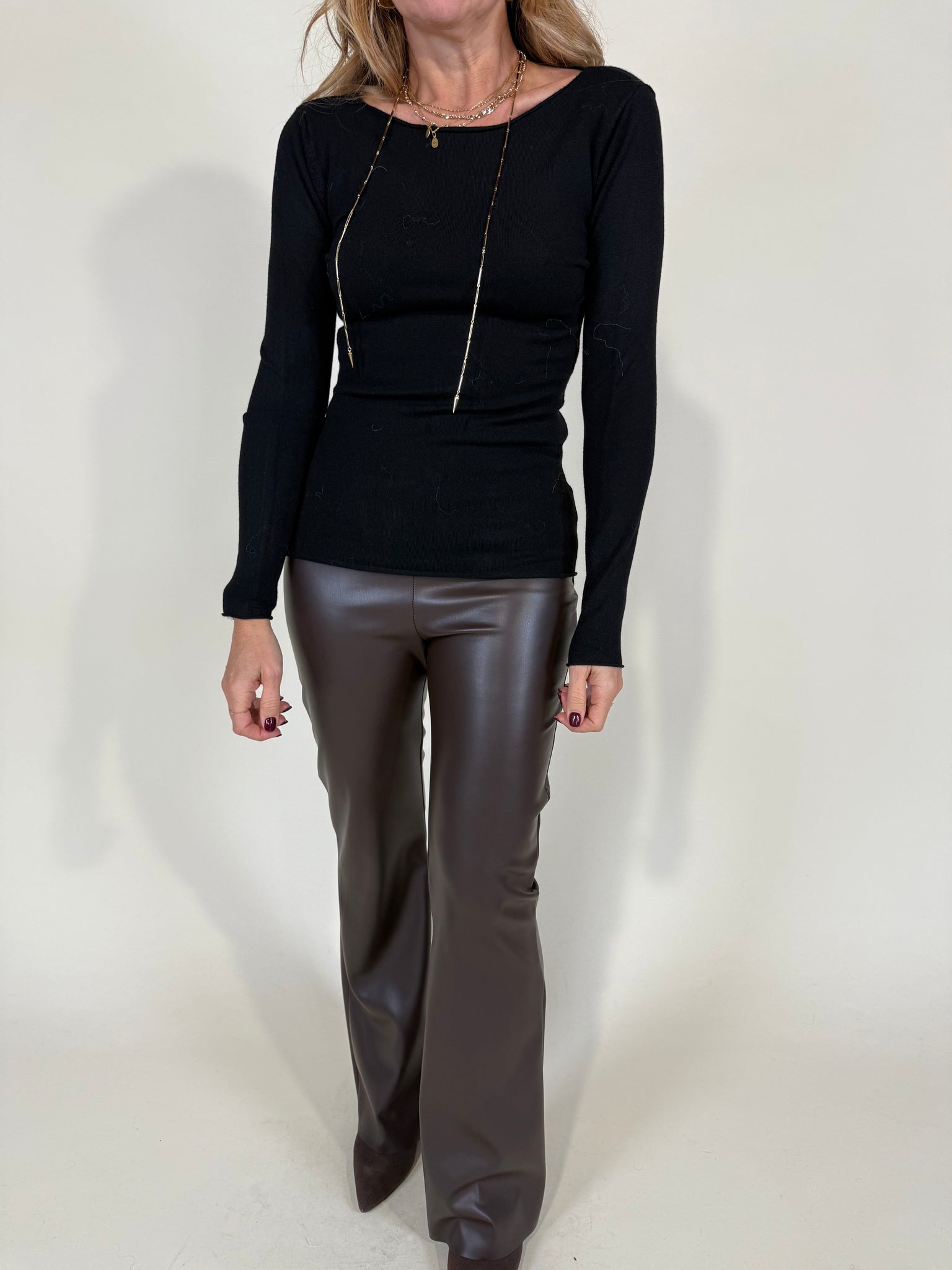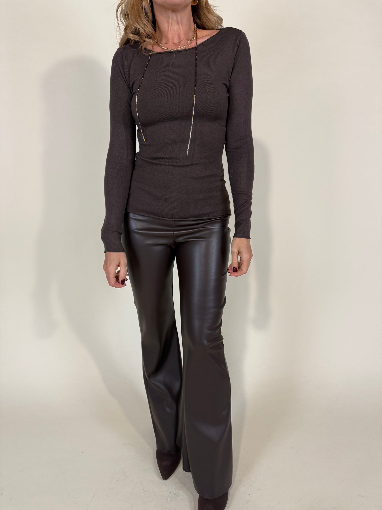 Maglia manica lunga basica disponibile nelle varianti colore panna, nero e moro. Modello con scollo a barchetta. Filato sottile morbidissimo e caldissimo. Profili a taglio a vivo.