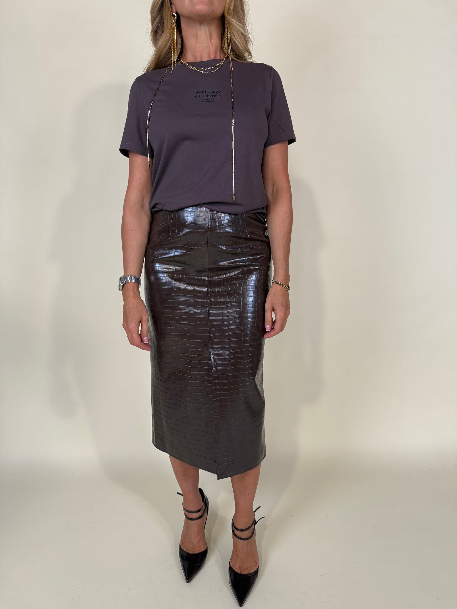 T-shirt modello regolare disponibile nelle varianti colore moro e rosa antico. Modello girocollo con dettaglio scritta a stampa tono su tono centrale frontale 'I Am Crazy For Love'.