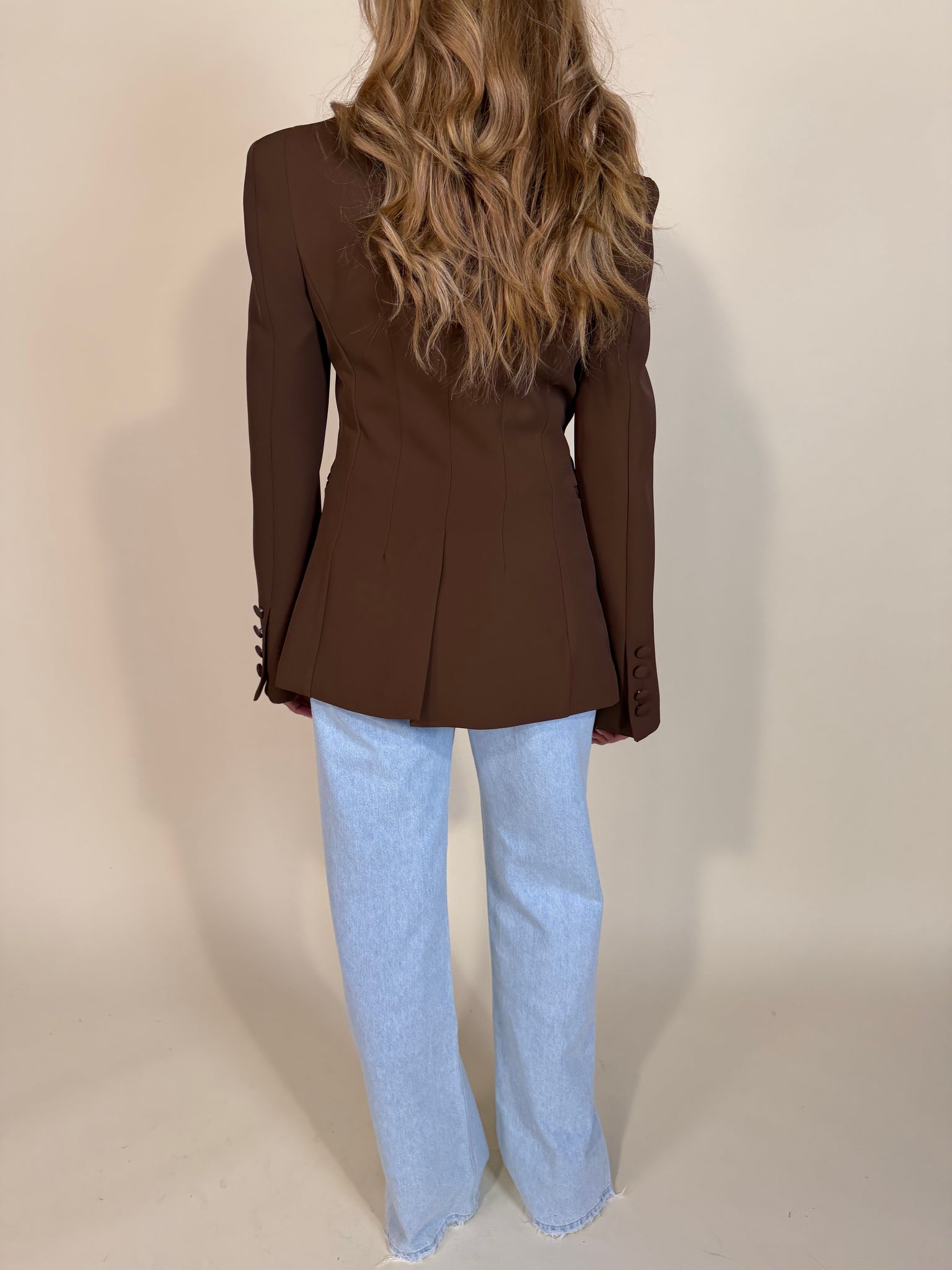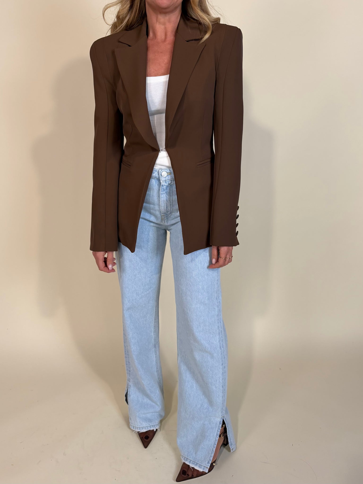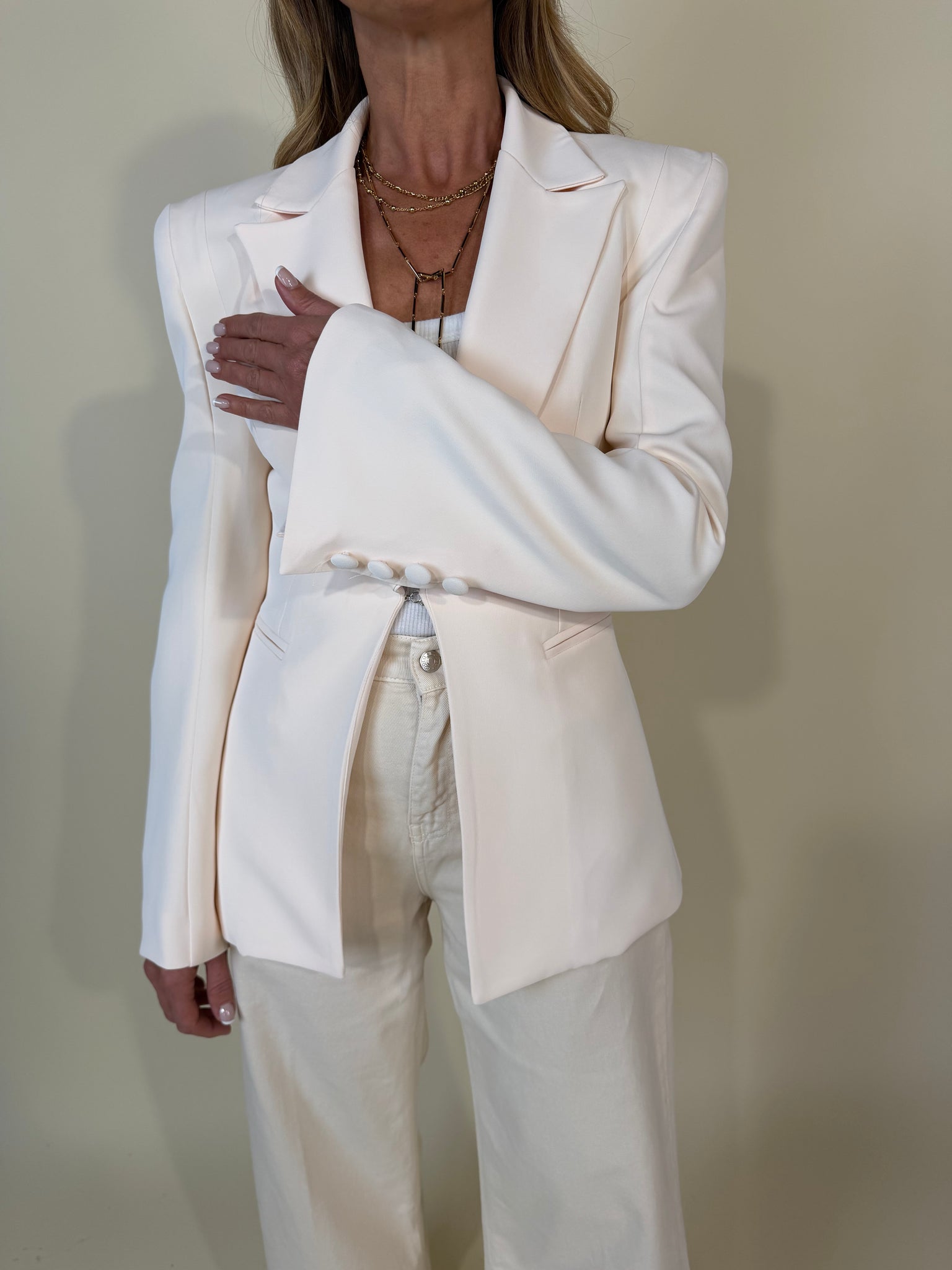 Giacca modello super slim femminile sul punto vita disponibile nelle variante colore crema, bianco, nero e moro. Modello con chiusura frontale a gancetto. Manica con dettaglio bottoni. Tasche laterali a ricamo.
