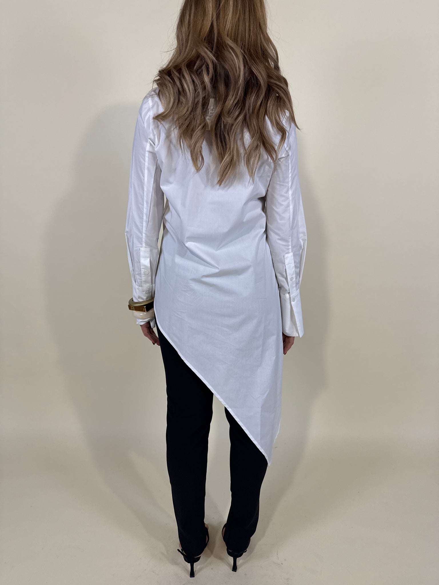 Camicia classica in cotone disponibile nella variante colore unica bianco gesso. Modello con chiusura a bottoncini frontale e dettaglio maxi polso. Modello assimetrico sulla lunghezza.