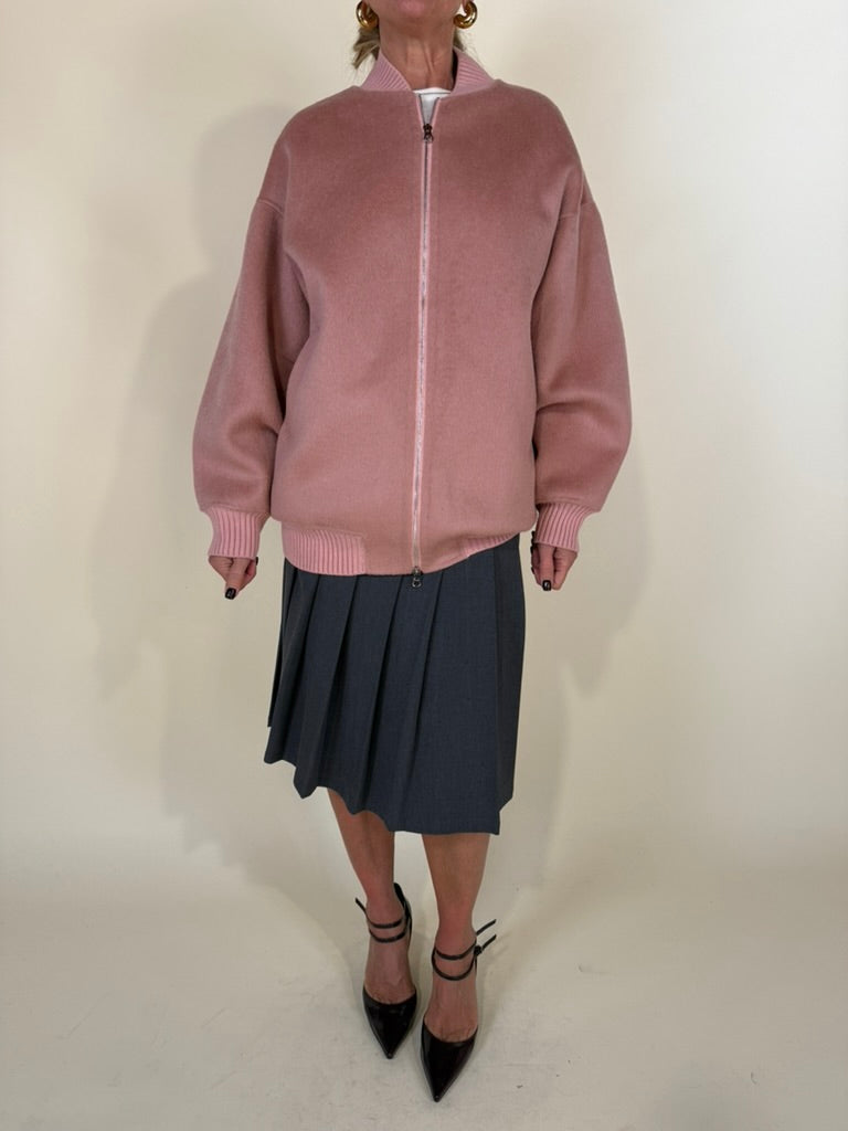 Bomber in lana disponibile nella variante colore rosa bubble-gum. Modello oversize in tessuto double con dettaglio profilo ad elastico a maxi costina. Manica ampia morbida. Chiusura con zip centrale in metallo a contrasto. Tasche laterali.
