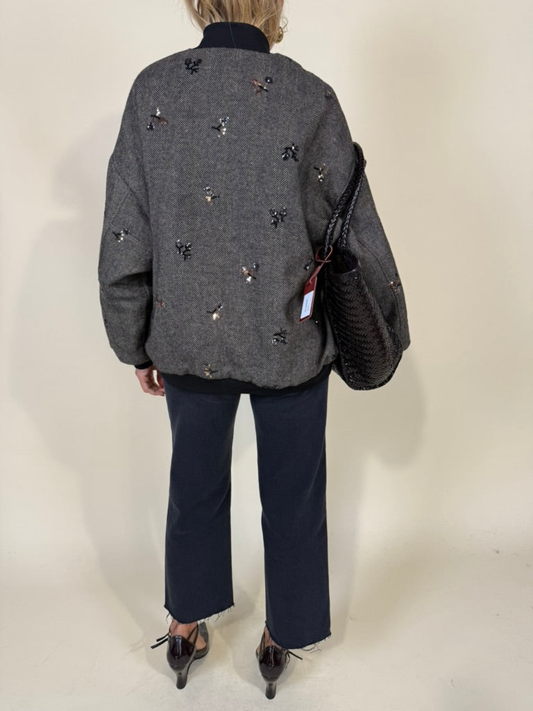 Bomber trapuntato ricamato sui toni del moro e nero. Modello spinato con dettaglio applicazioni a ricamo luminose con paillettes tono su tono. Chiusura con zip centrale in metallo.