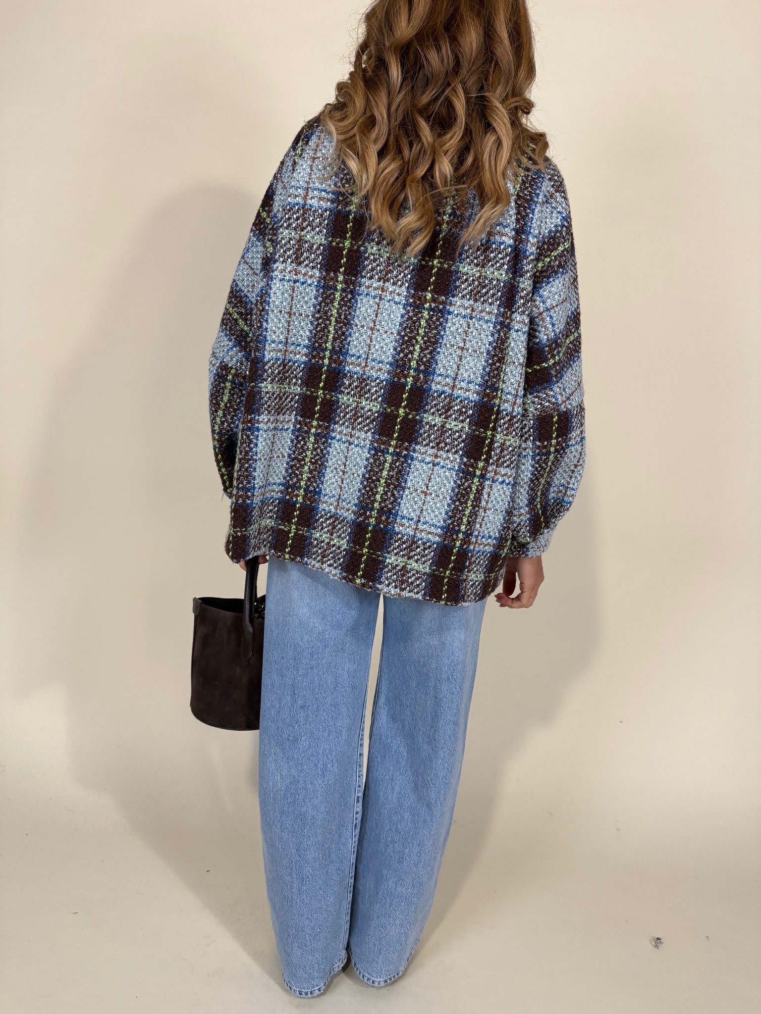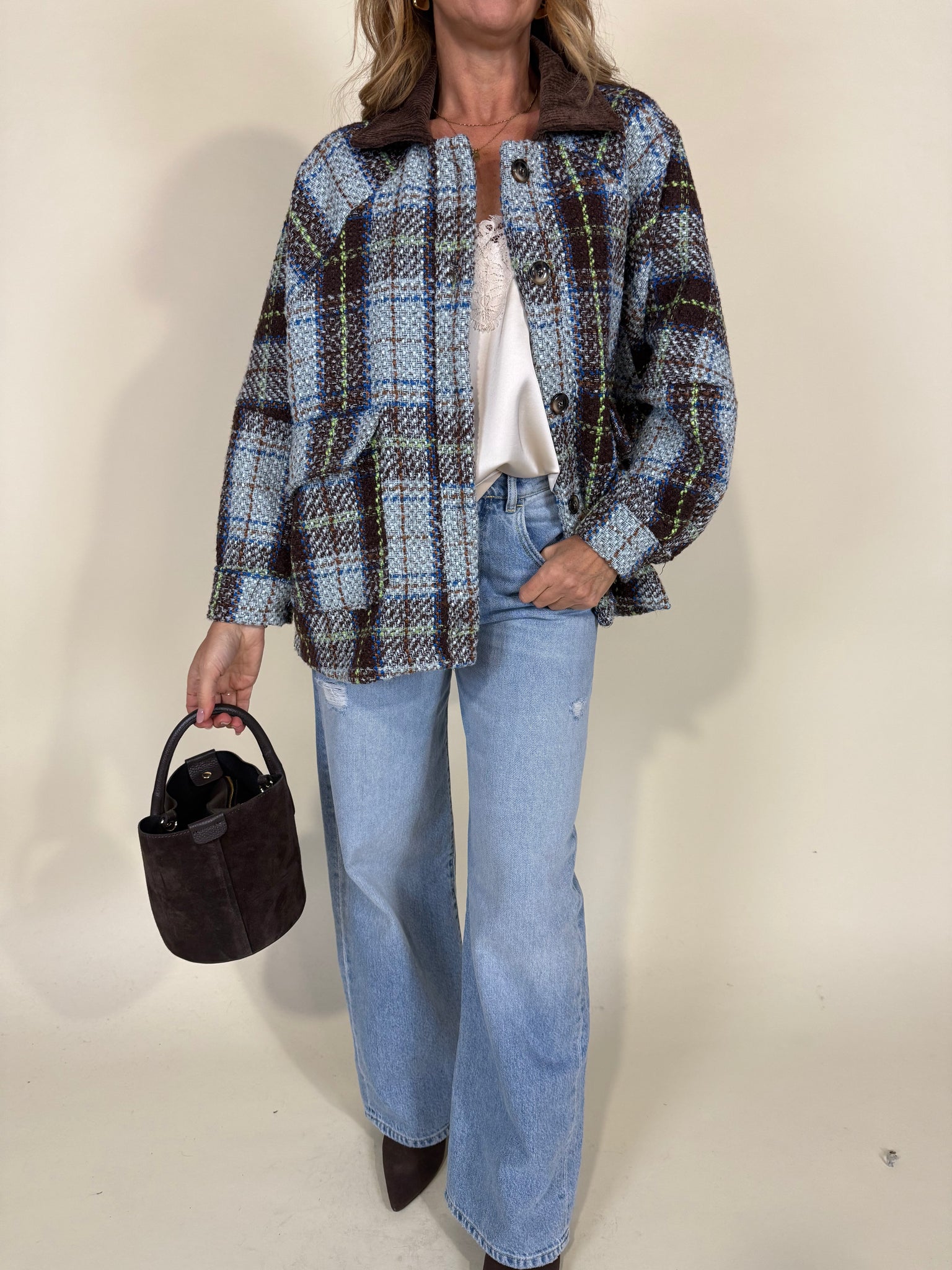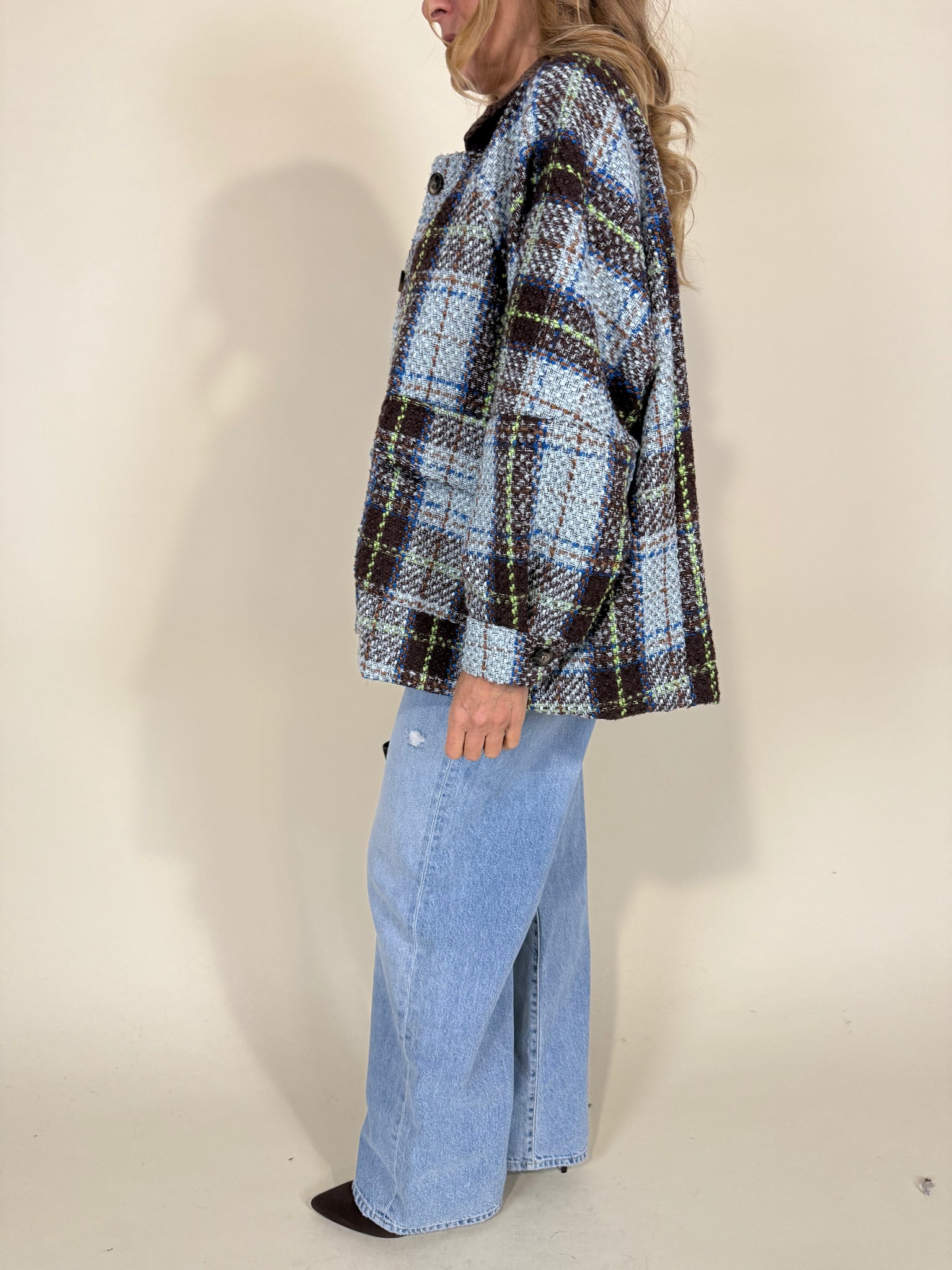 Giacca modello cappottino primo peso in trama tessuto check sui toni del moro e del lime a contrasto. Modello trench con colletto in velluto a costina micro sui toni del moro. Chiusura con bottoni frontali a contrasto. Tasche applicate frontali.