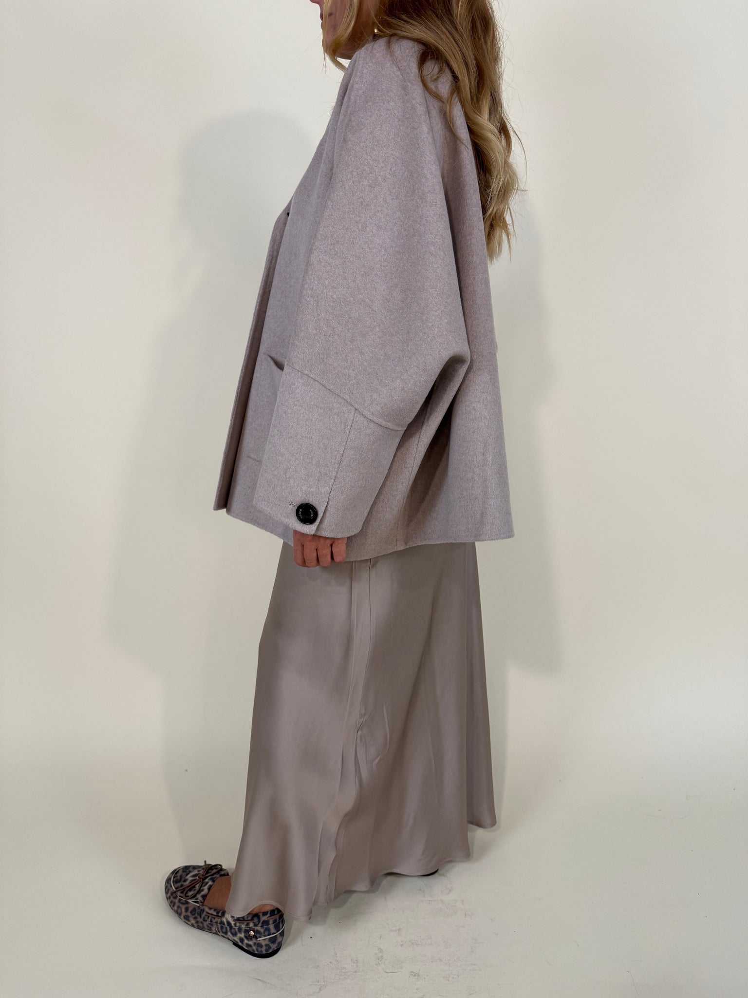Cappotto modello oversize nella variante colore unica écru. Dettaglio rever ampio e manica over simil cappa. Chiusura frontale nascosta dalle cuciture. Maxi tasche applicate frontalmente.