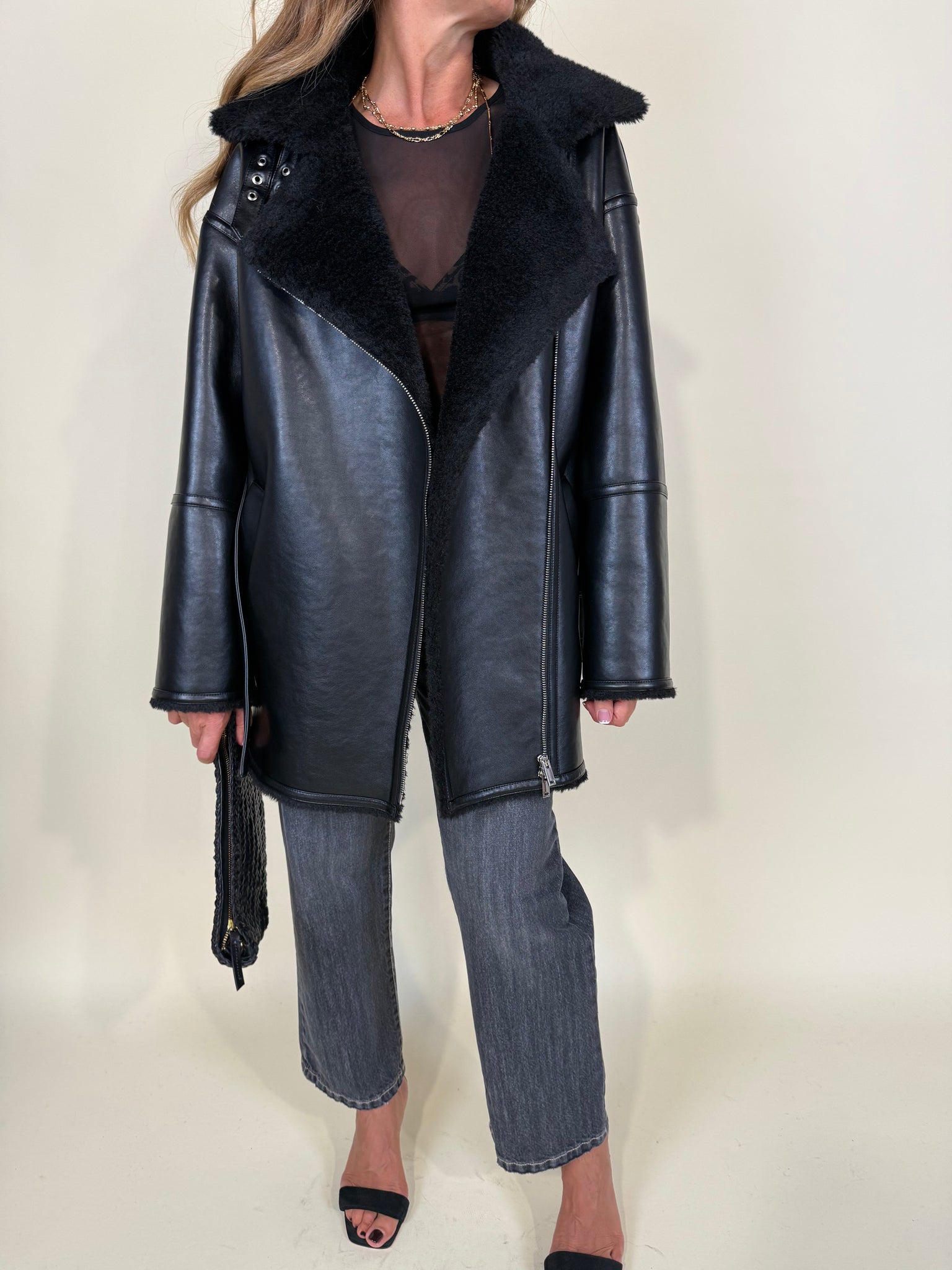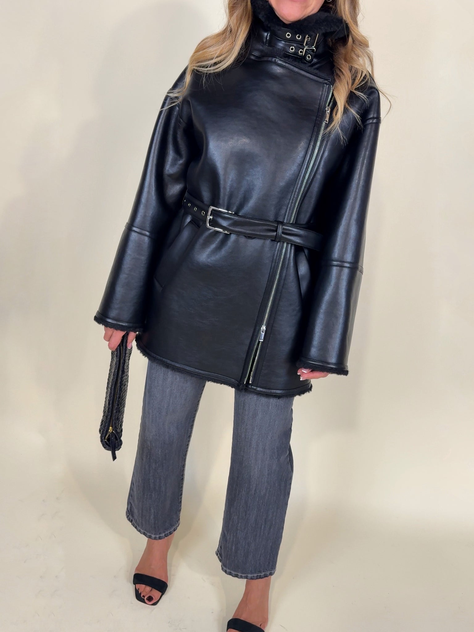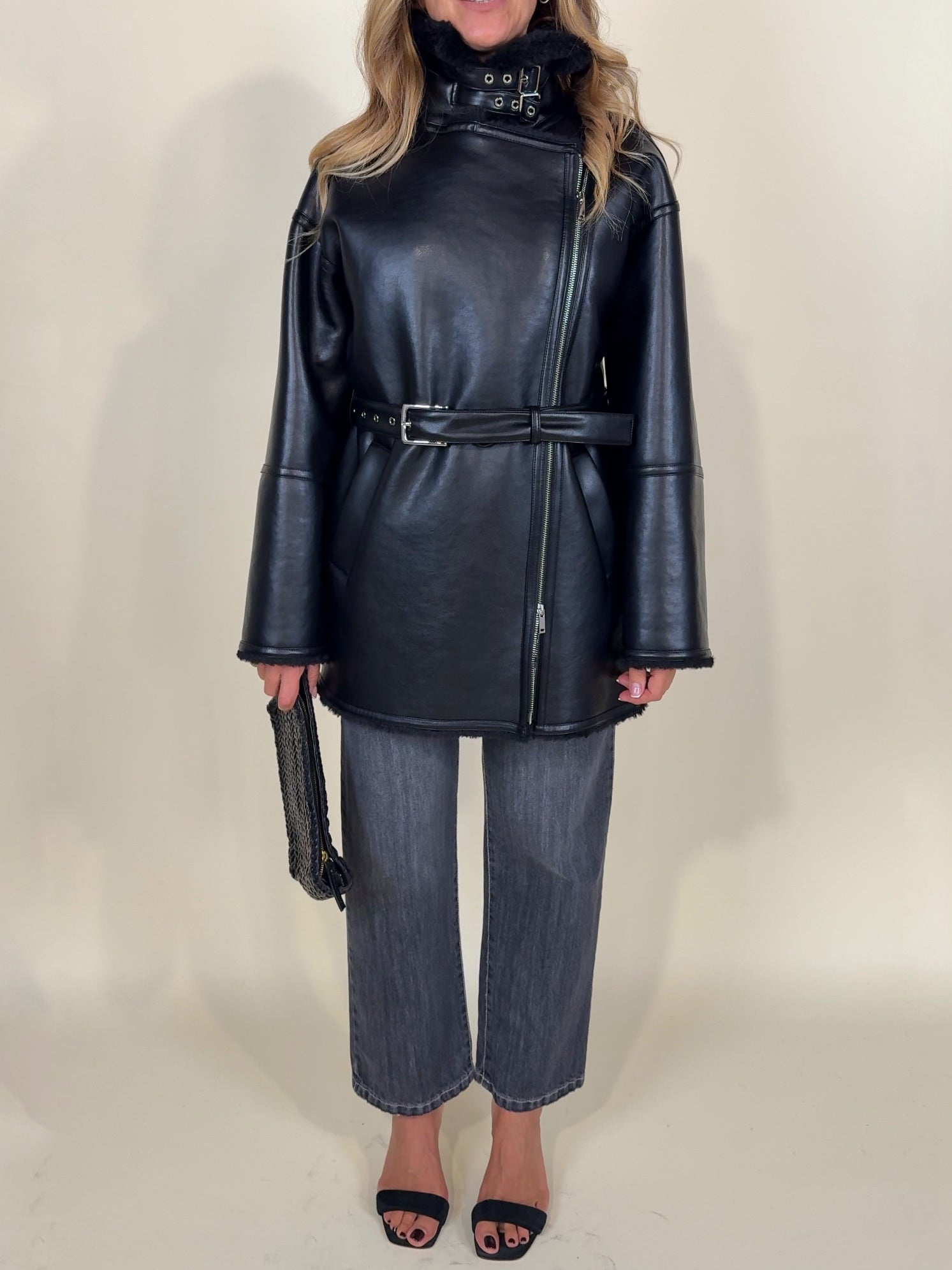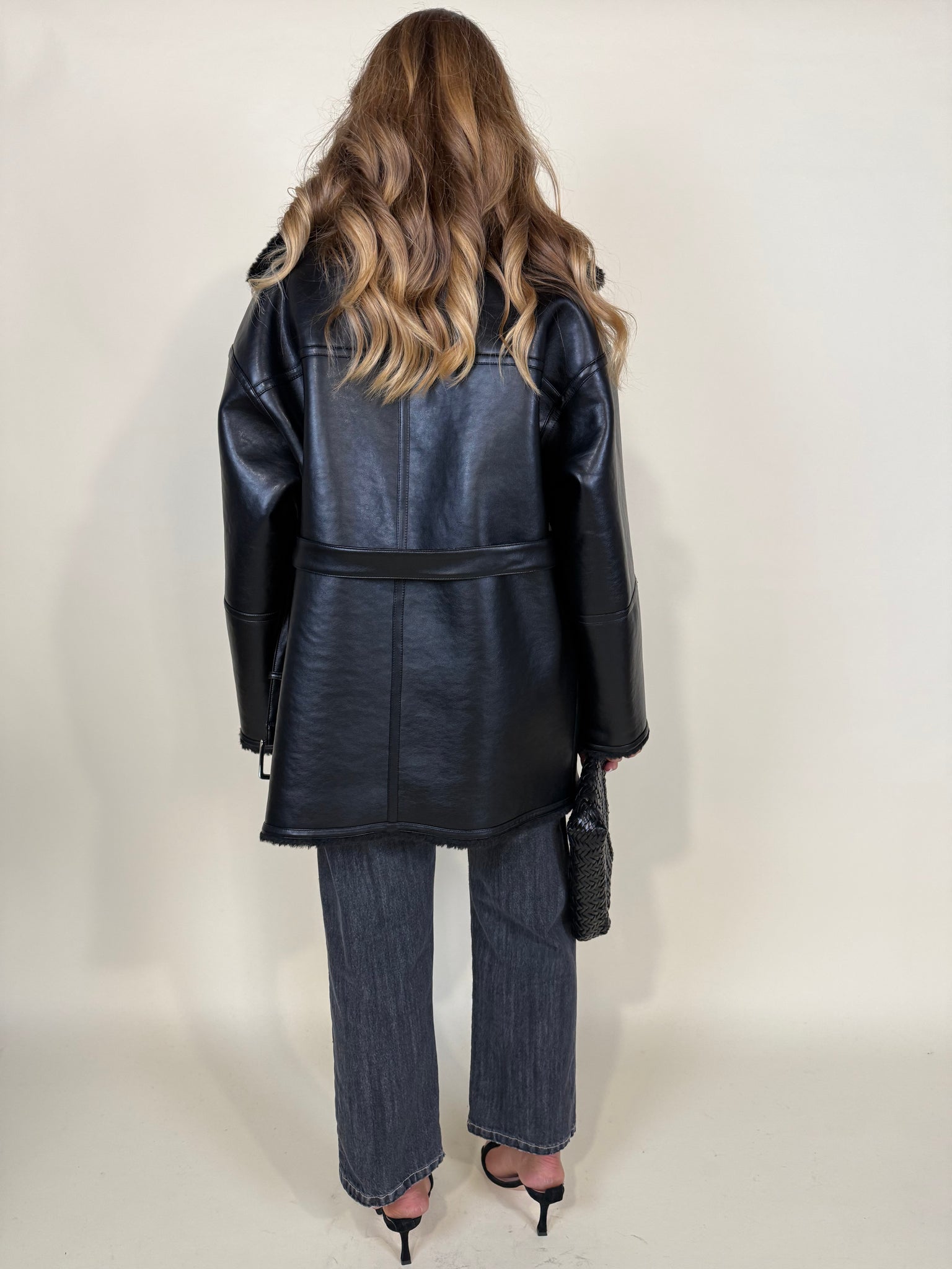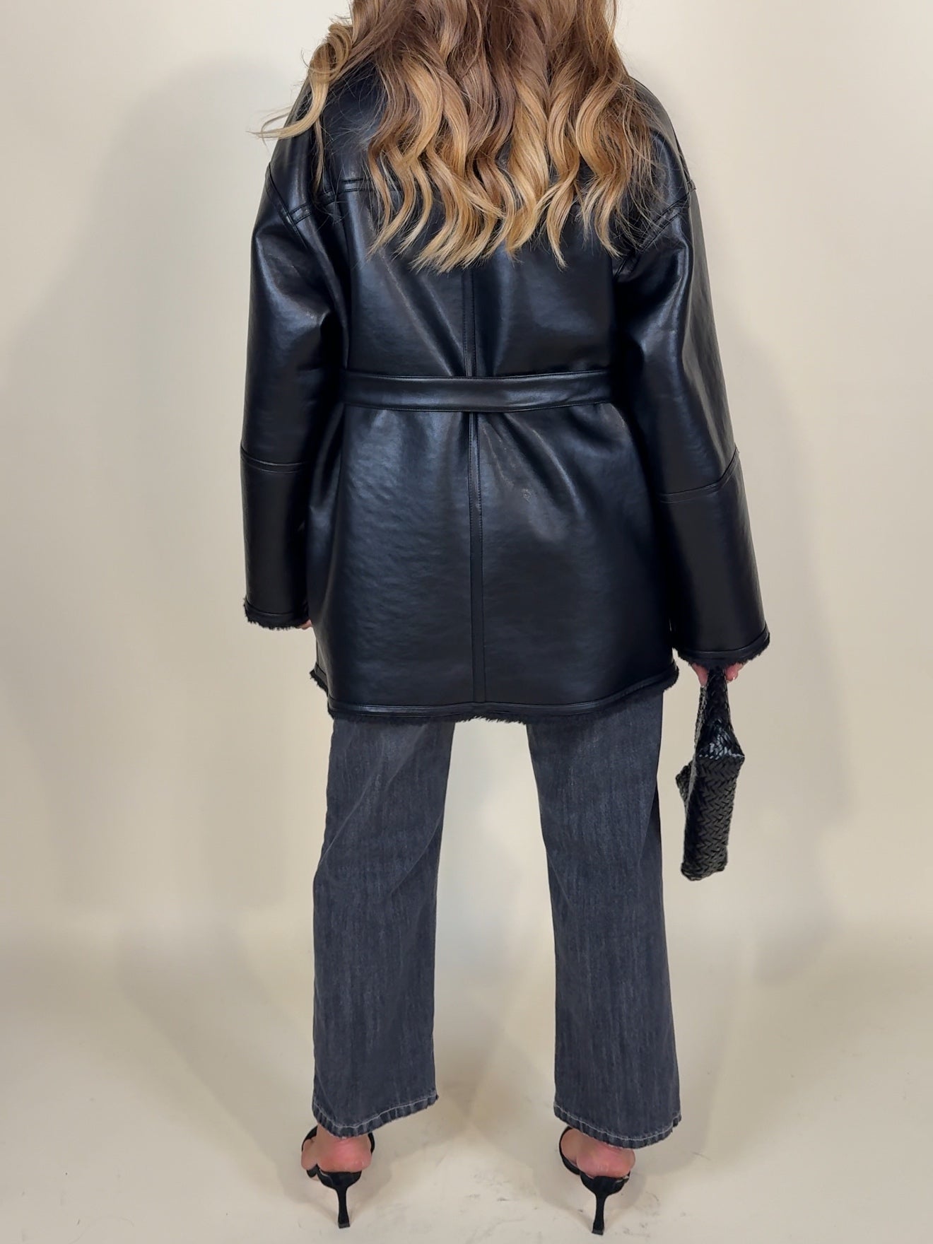 Ecomontone sartoriale disponibile nella variante colore unica nera lucida. Dettaglio ecopelliccia interna tono su tono e sui rever ampi. Chiusura con zip in metallo laterale a contrasto. Tasche applicate laterali a cucitura. Dettaglio cinturina tono su tono in vita con passanti. Fodera interna tono su tono.