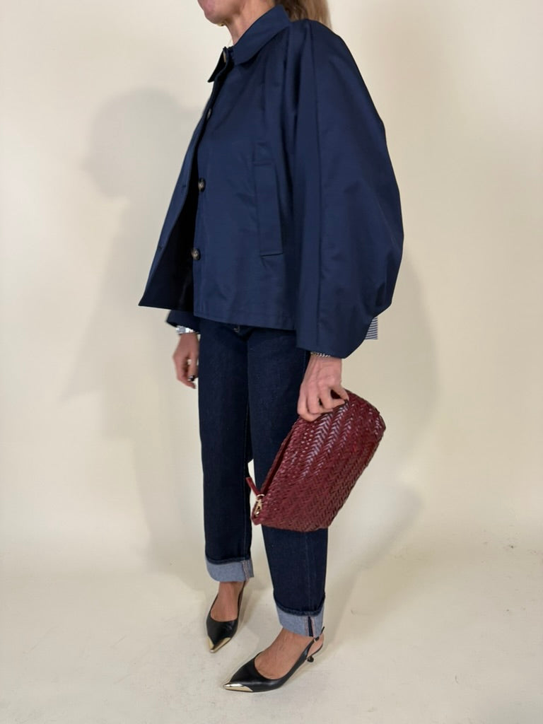 Giacchetto simil tessuto trench disponibile nella variante colore blu notte. Dettaglio maniche ampia a cappotta. Chiusura doppiopetto a bottoni tono su tono. Dettaglio fondo capo in stampa fantasia check sui toni del blu. Fodera interna tono su tono.