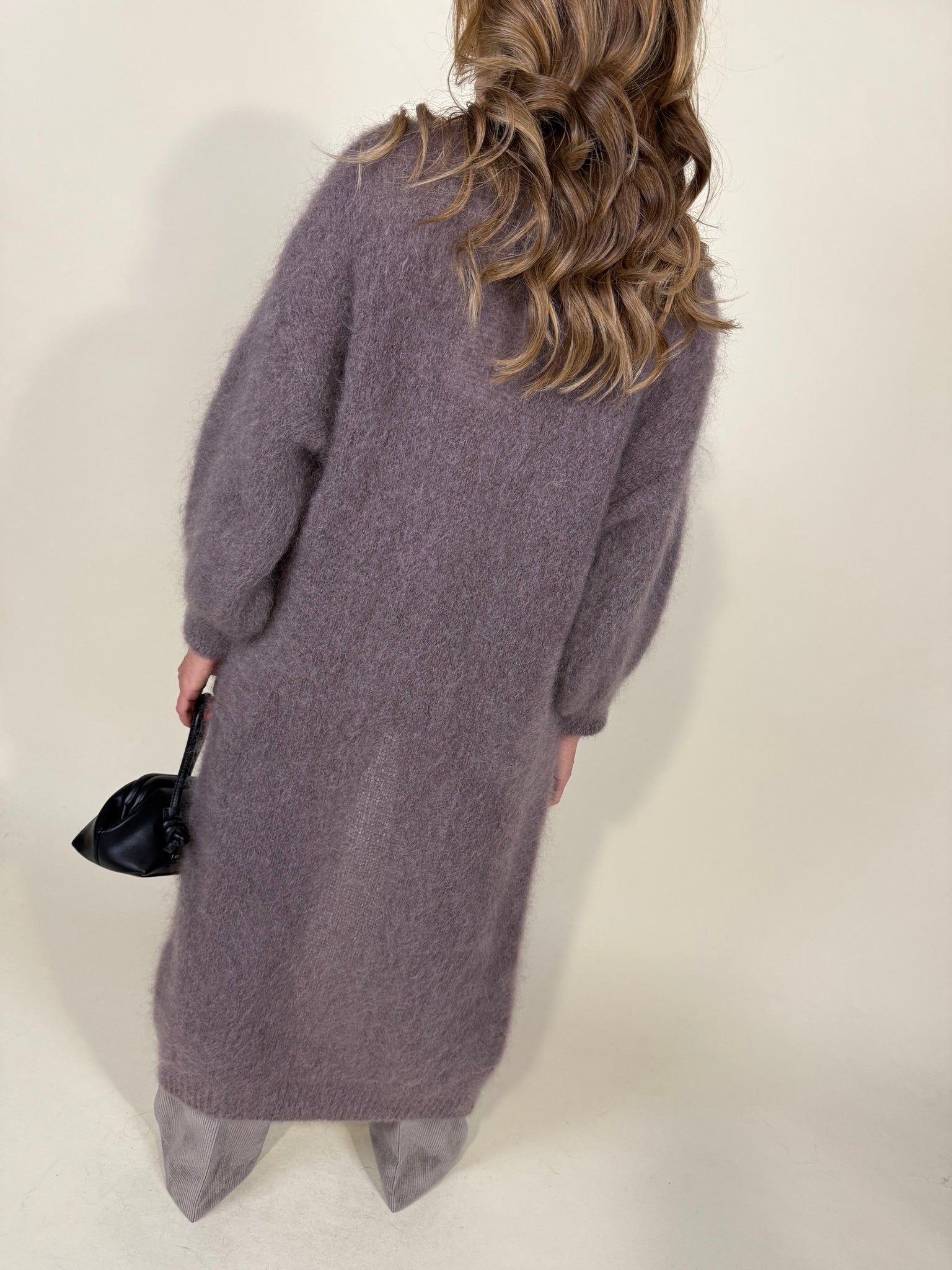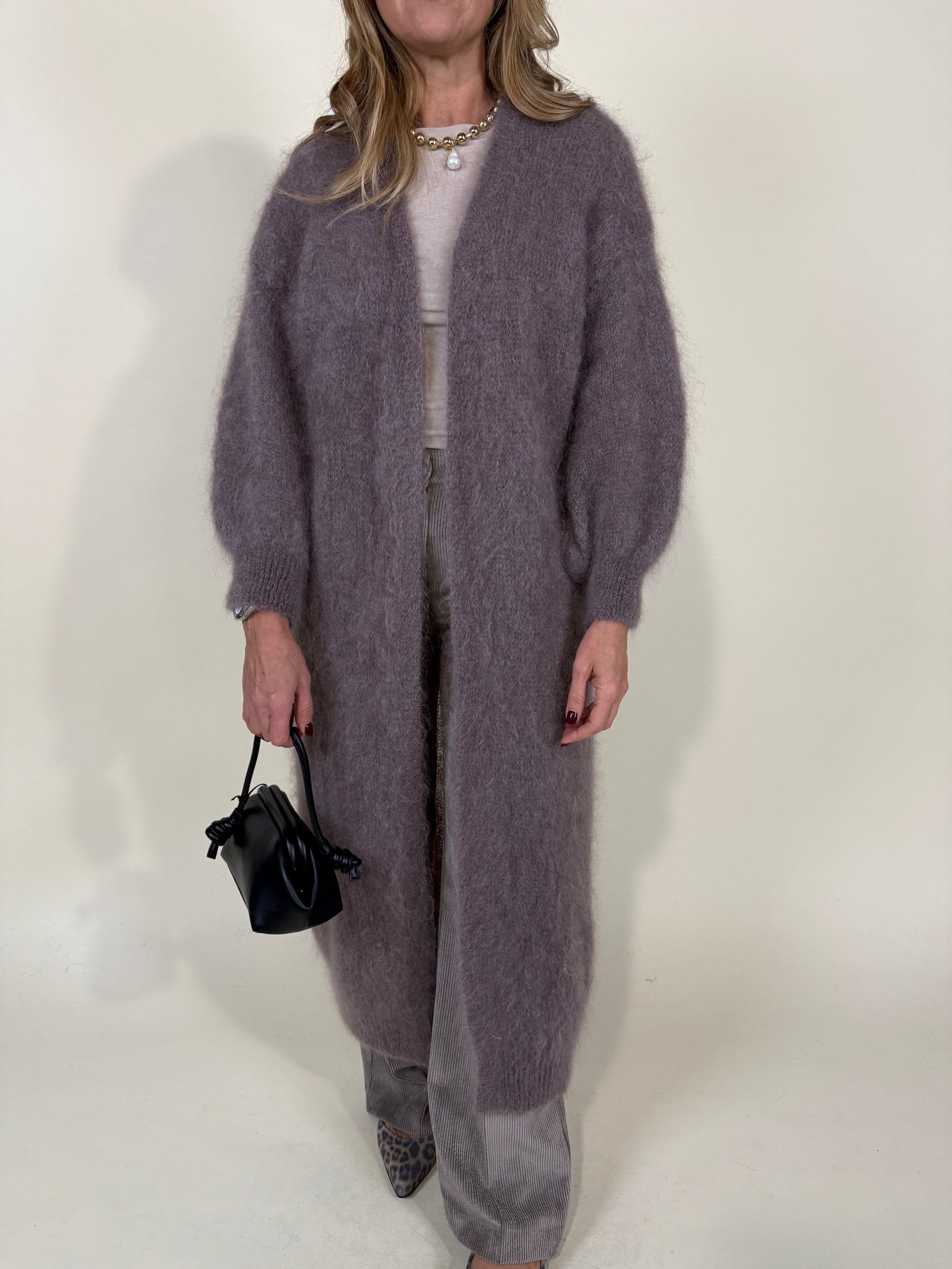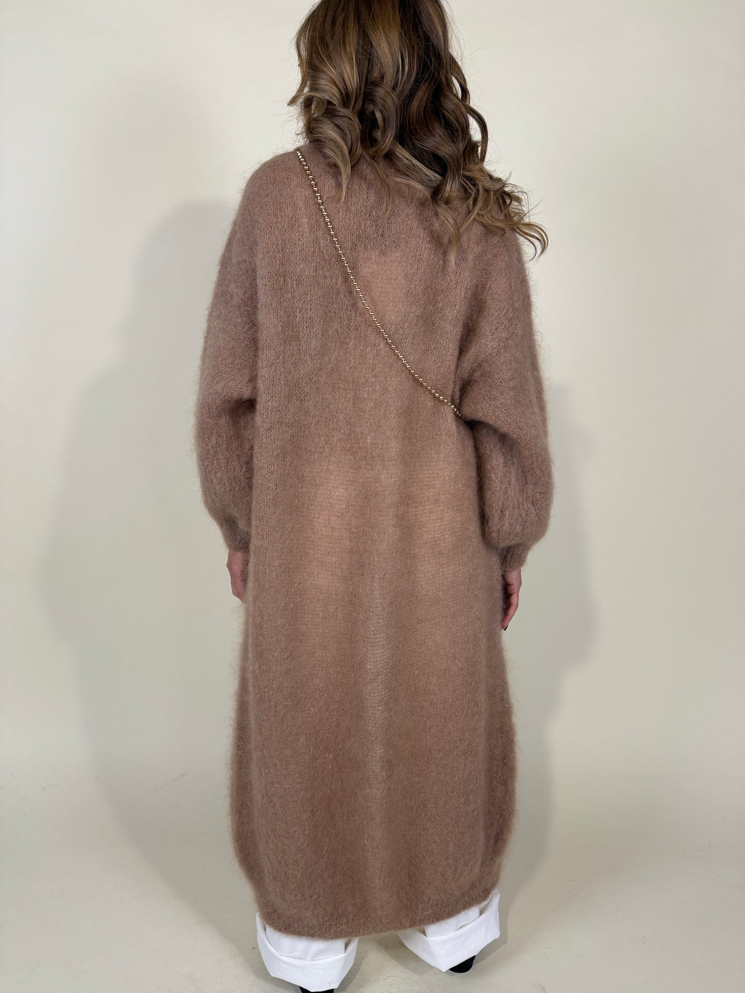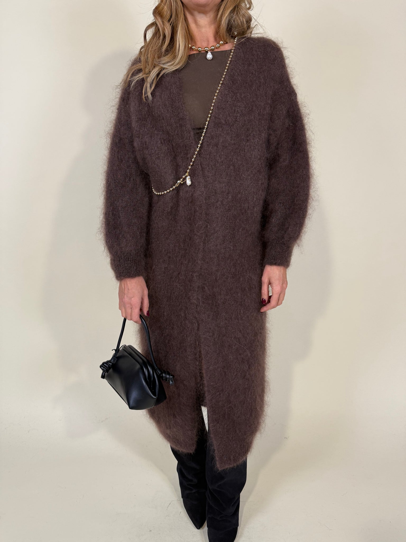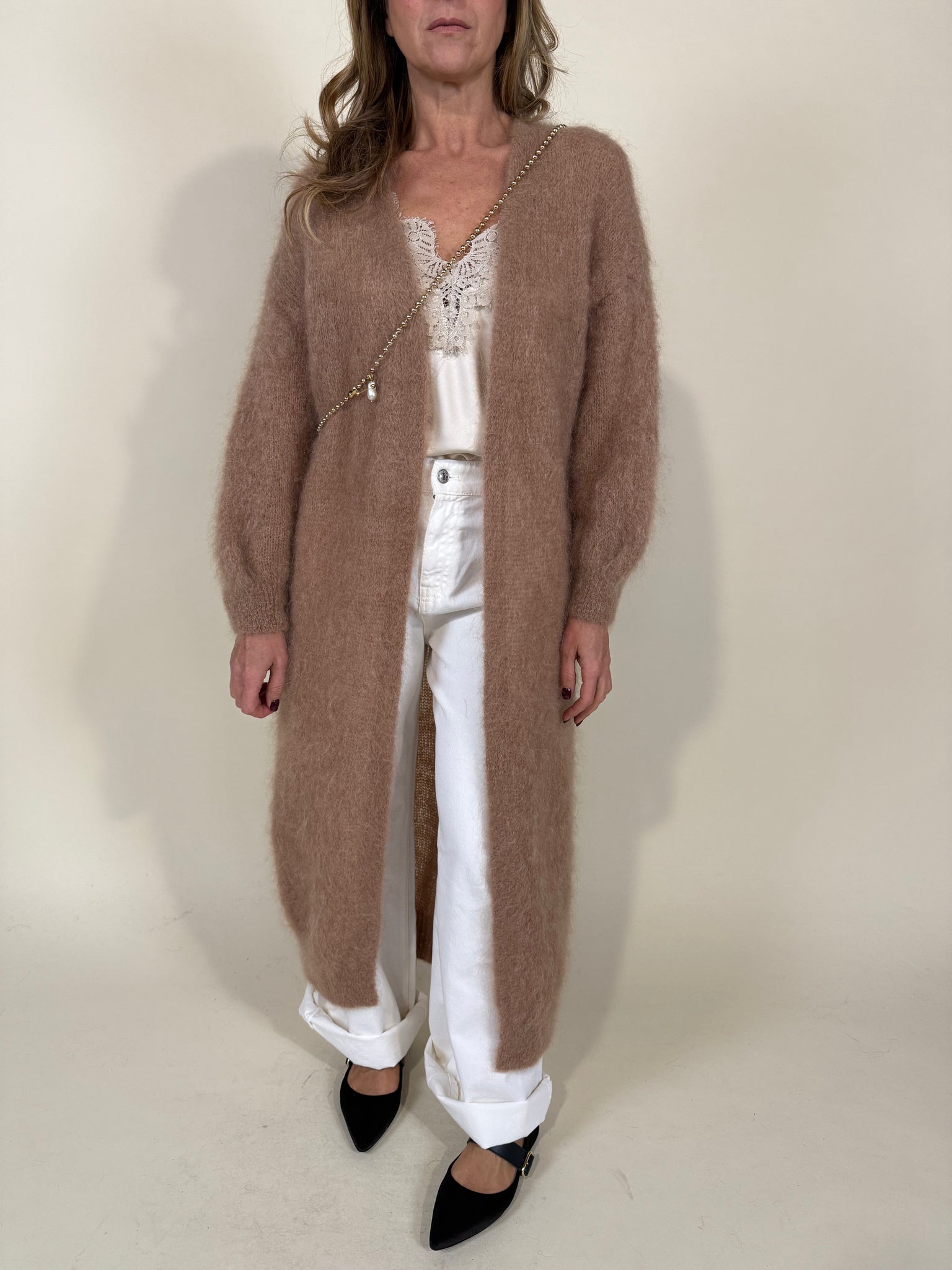 Cardigan modello lungo in 80% mohair disponibile nelle varianti colore moro, camel e tortora. Modello morbidissimo e senza chiusura. Modello manica lunga.