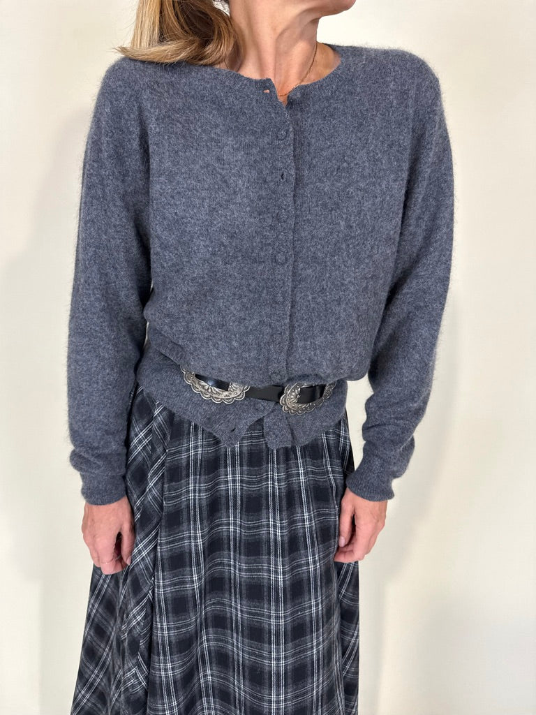 Maglia modello piccolo cardigan morbidissimo nella variante grigia antracite con chiusura a piccoli bottoncini frontali tono su tono in tessuto. Modello girocollo morbido.