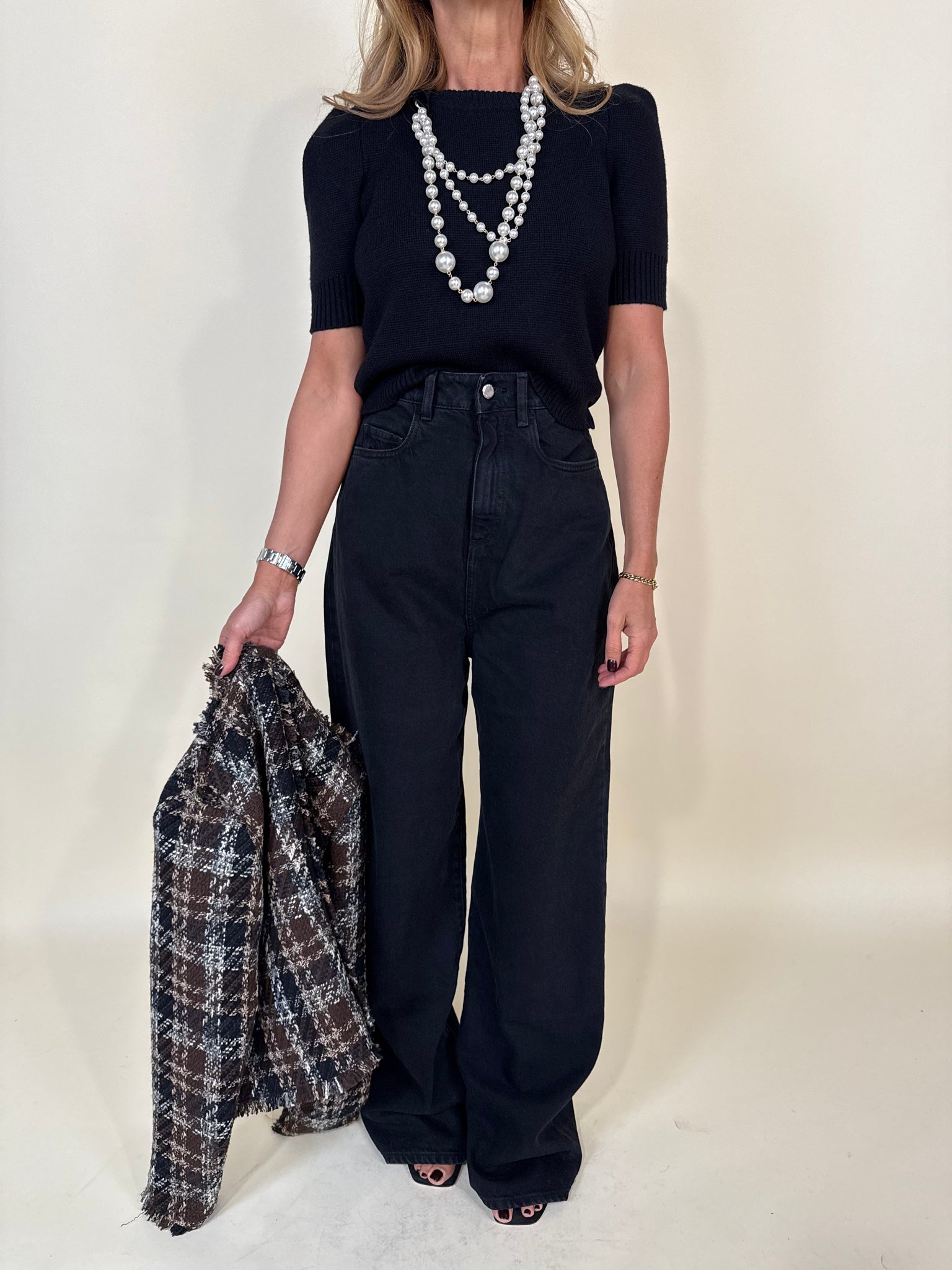 Denim modello Coco disponibile nel lavaggio scuro black. Denim modello vita alta e gamba ampia. Modello cinque tasche. Chiusura con zip centrale e bottone unico.