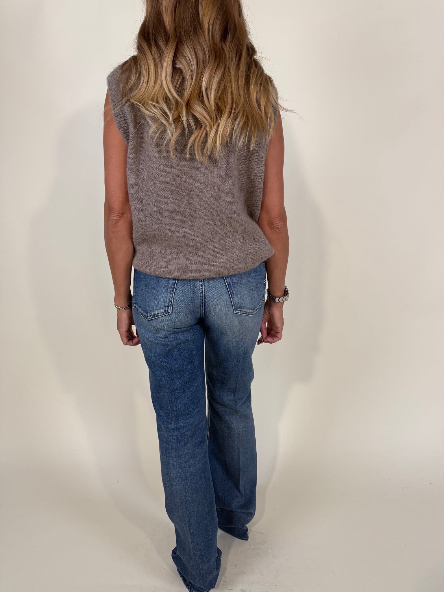 Denim dal lavaggio chiaro slavato sabbiato modello straight con fondo dritto e lungo. Leggermente elasticizzato. Dettaglio rottura sul fondo gamba. Chiusura con zip e bottone unico centrale.