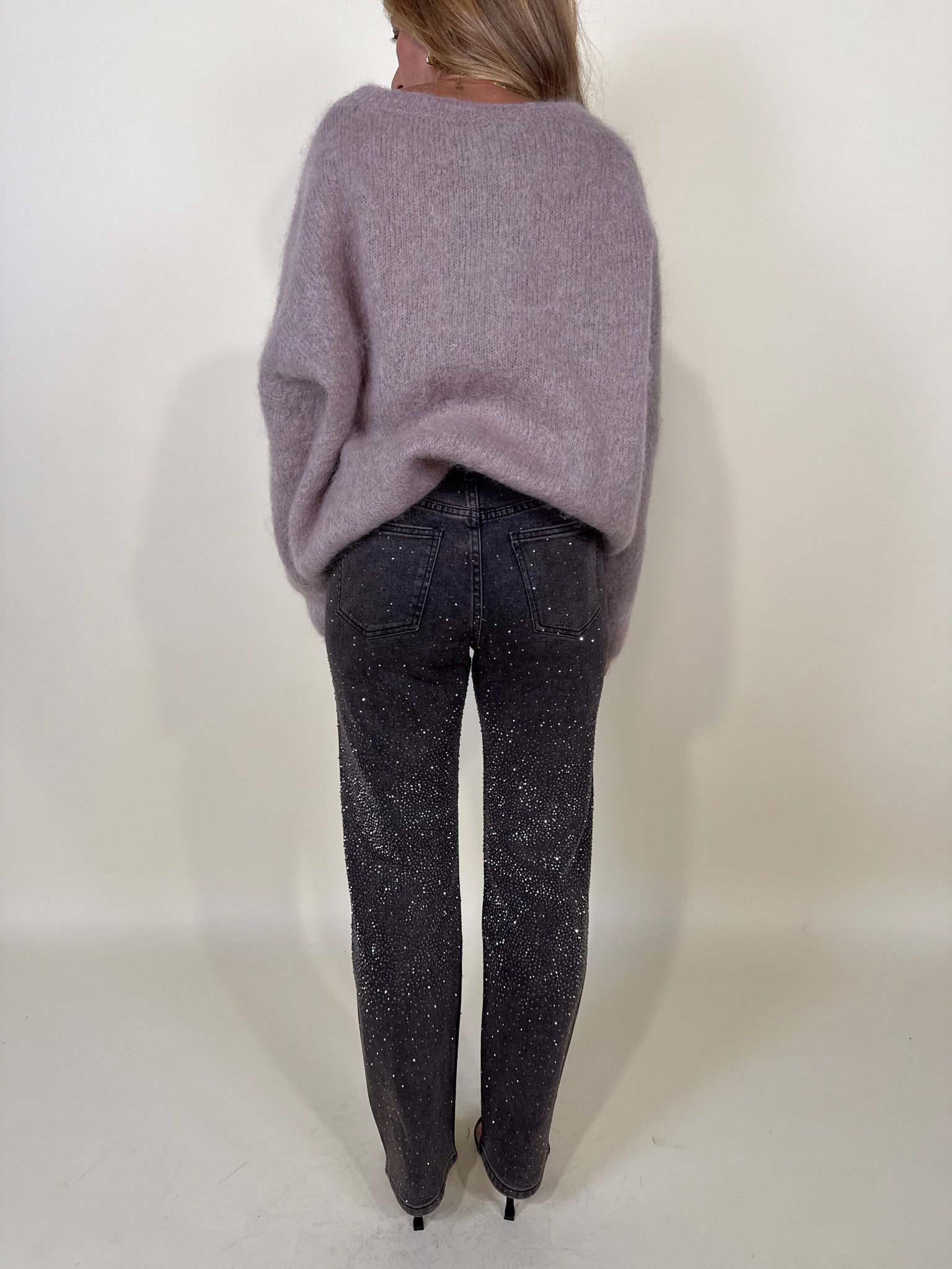 Denim modello lavaggio scuro con gamba tubolare regolare lunga. Dettaglio applicazioni strass su tutta la lunghezza gamba e vita frontale. Modello cinque tasche. Chiusura con zip centrale e bottone unico.