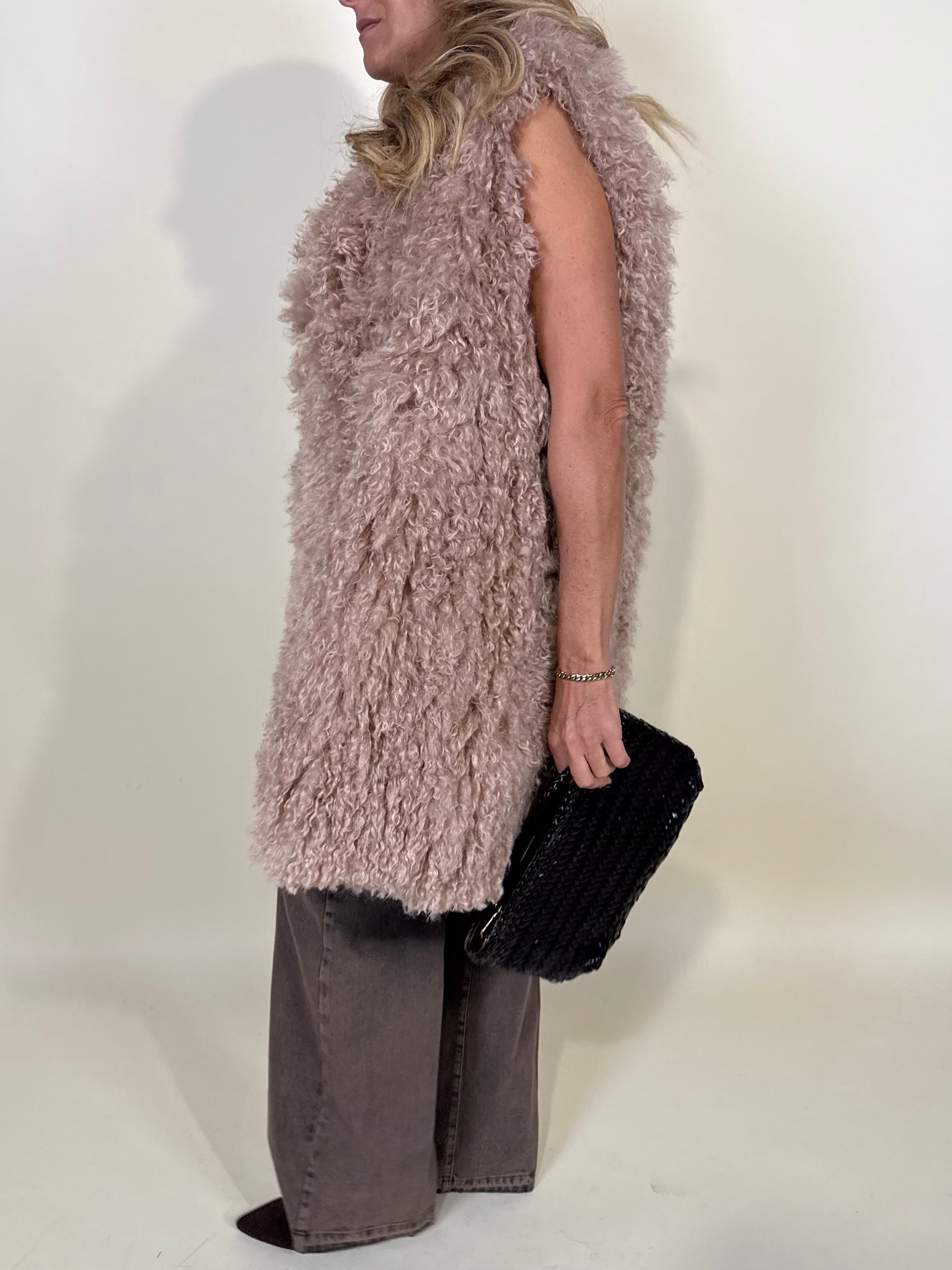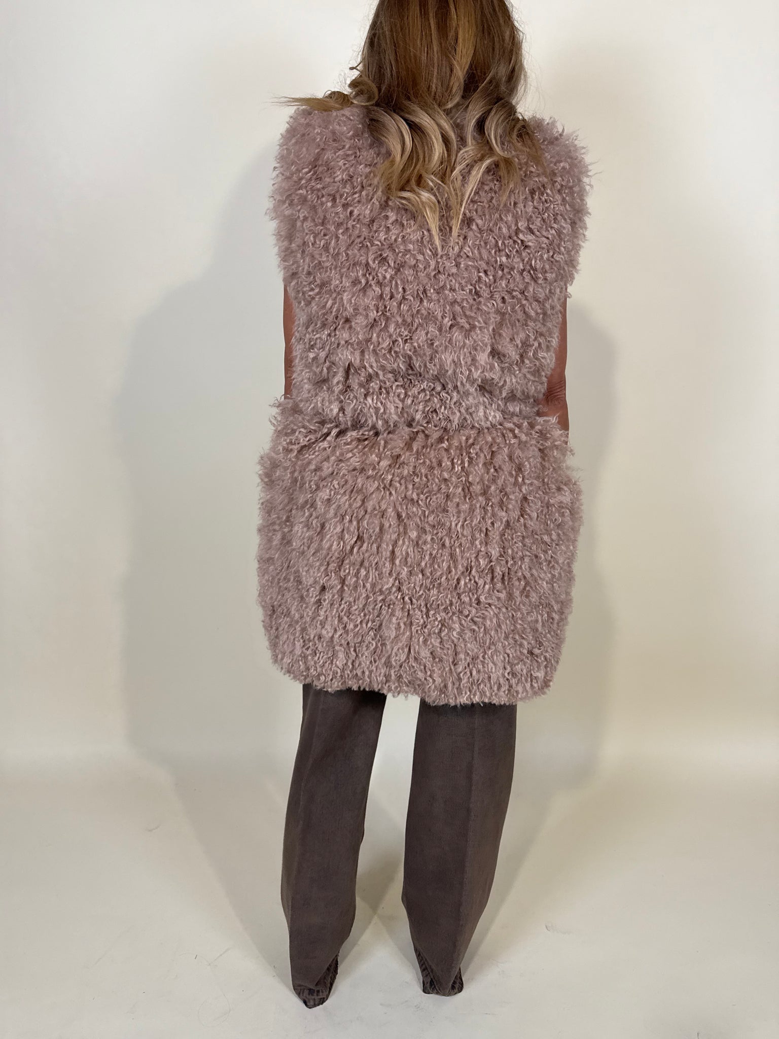 Ecopelliccia smanicata nella variante colore beige cipriata. Dettaglio pelliccia in tessuto bouclé morbidissimo. Cinturina annessa in vita da stringere il punto vita. Fodera interna tono su tono.