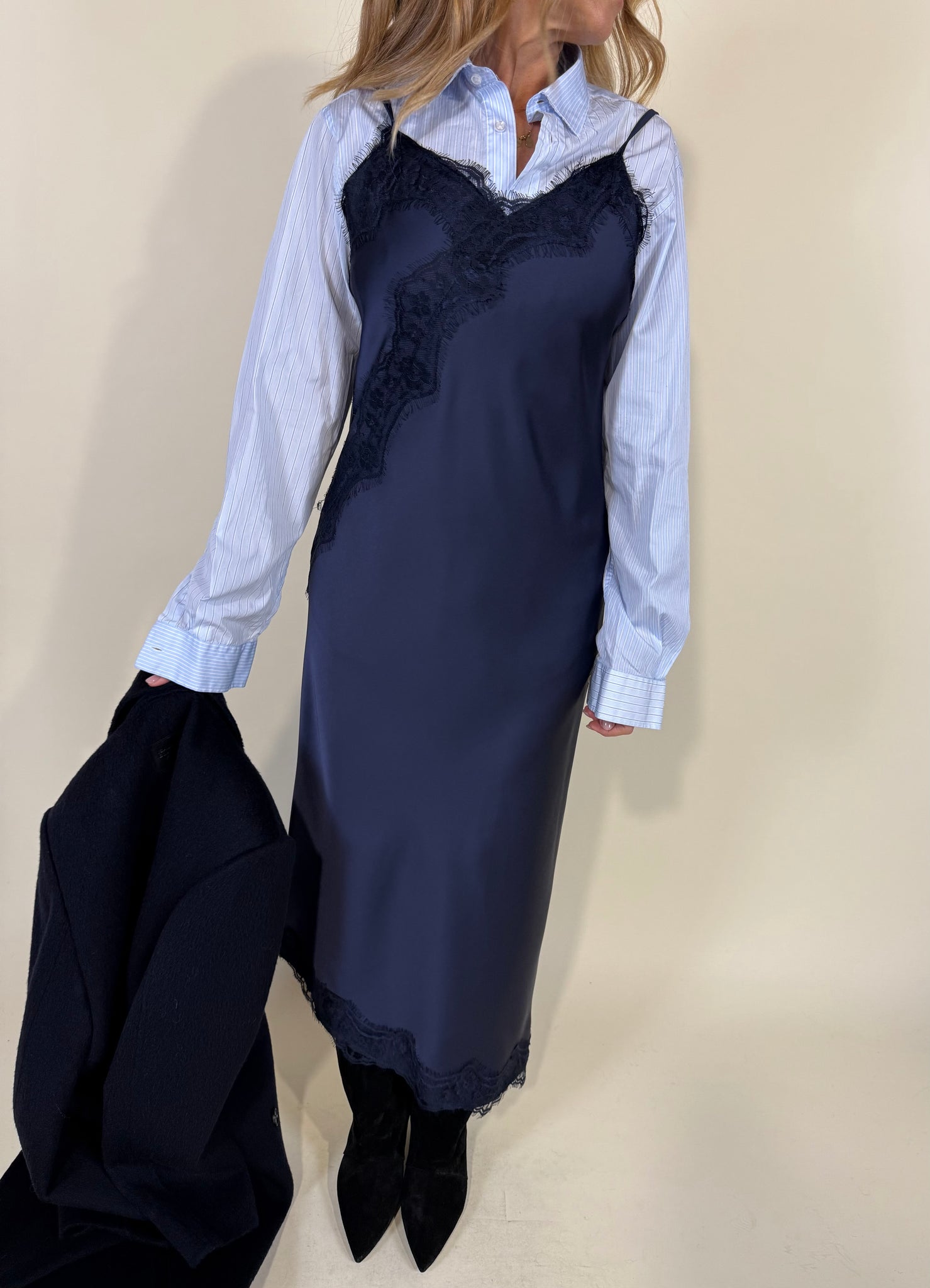 Abito lungo modello sottoveste nella variante colore unica moro. Dettaglio profili con inserti in pizzo tono su tono. Spallina sottile regolabile. Sfoderato.