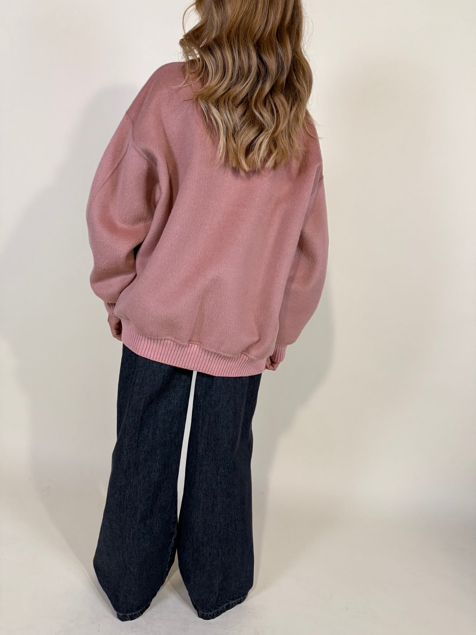 Bomber in lana disponibile nella variante colore rosa bubble-gum. Modello oversize in tessuto double con dettaglio profilo ad elastico a maxi costina. Manica ampia morbida. Chiusura con zip centrale in metallo a contrasto. Tasche laterali.