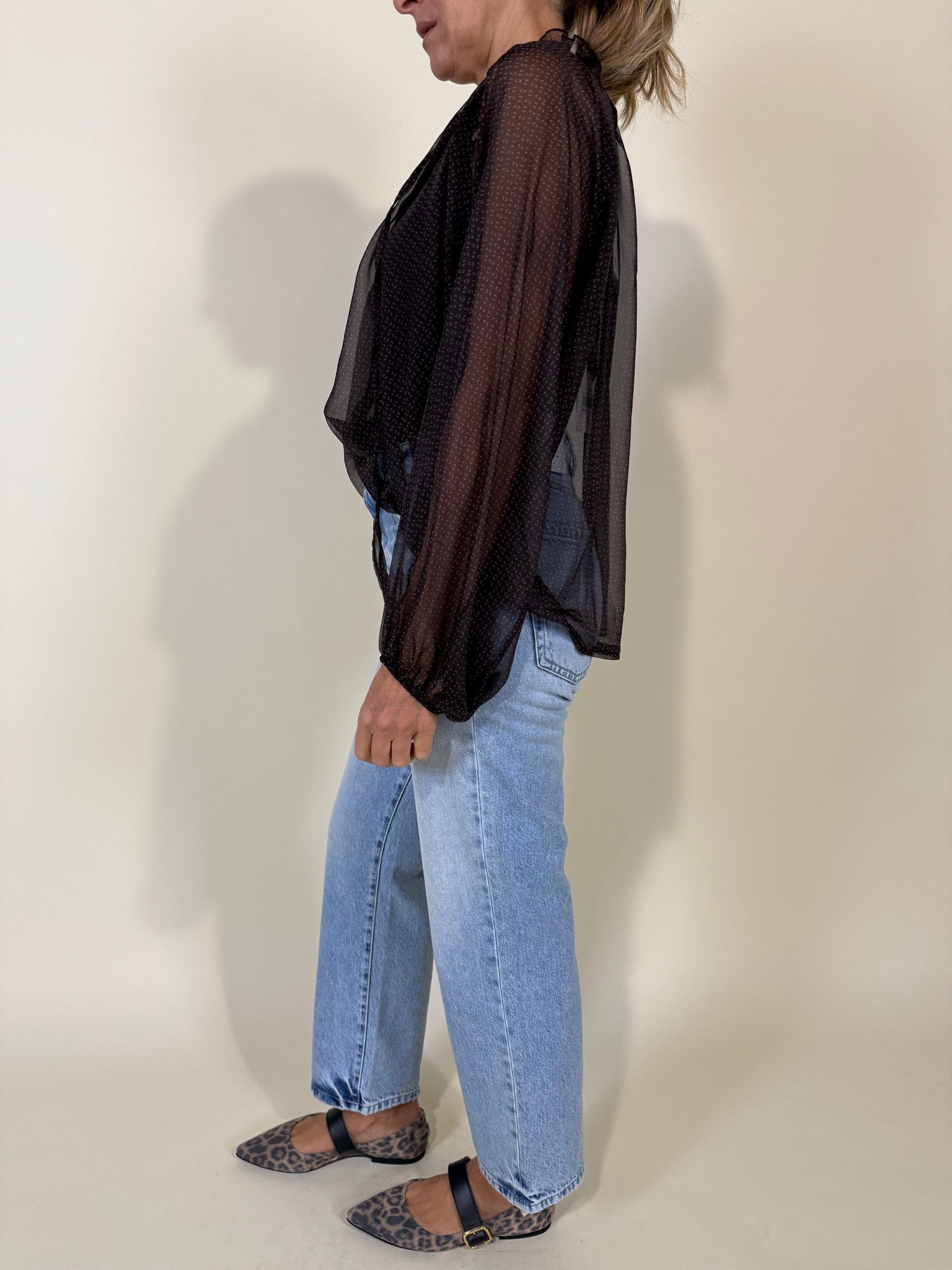 Camicia morbida oversize velata disponibile nella fantasia micro sui toni del violetto calda. Modello manica lunga con elastico sul polso e colletto arricciato con laccetti.