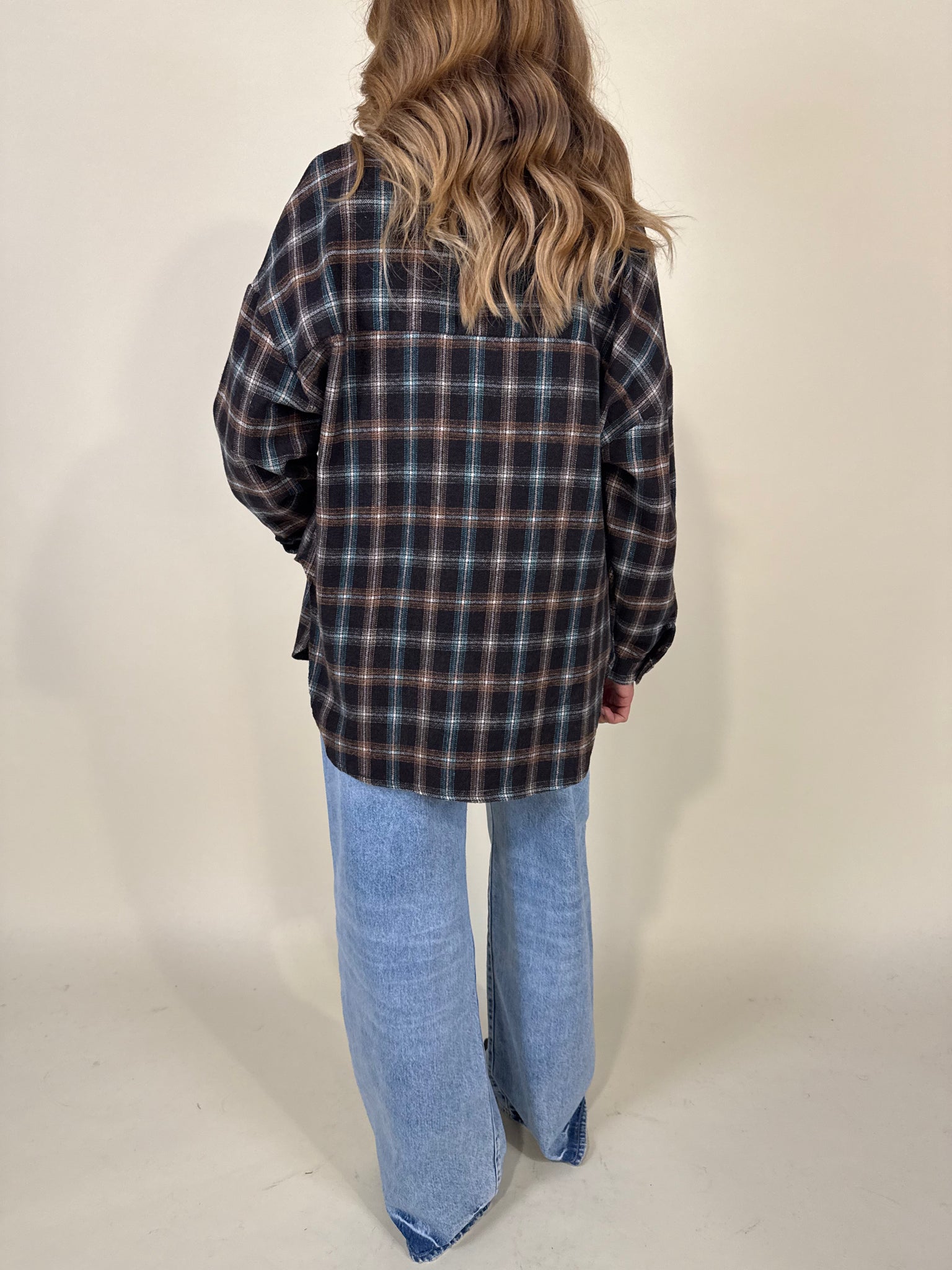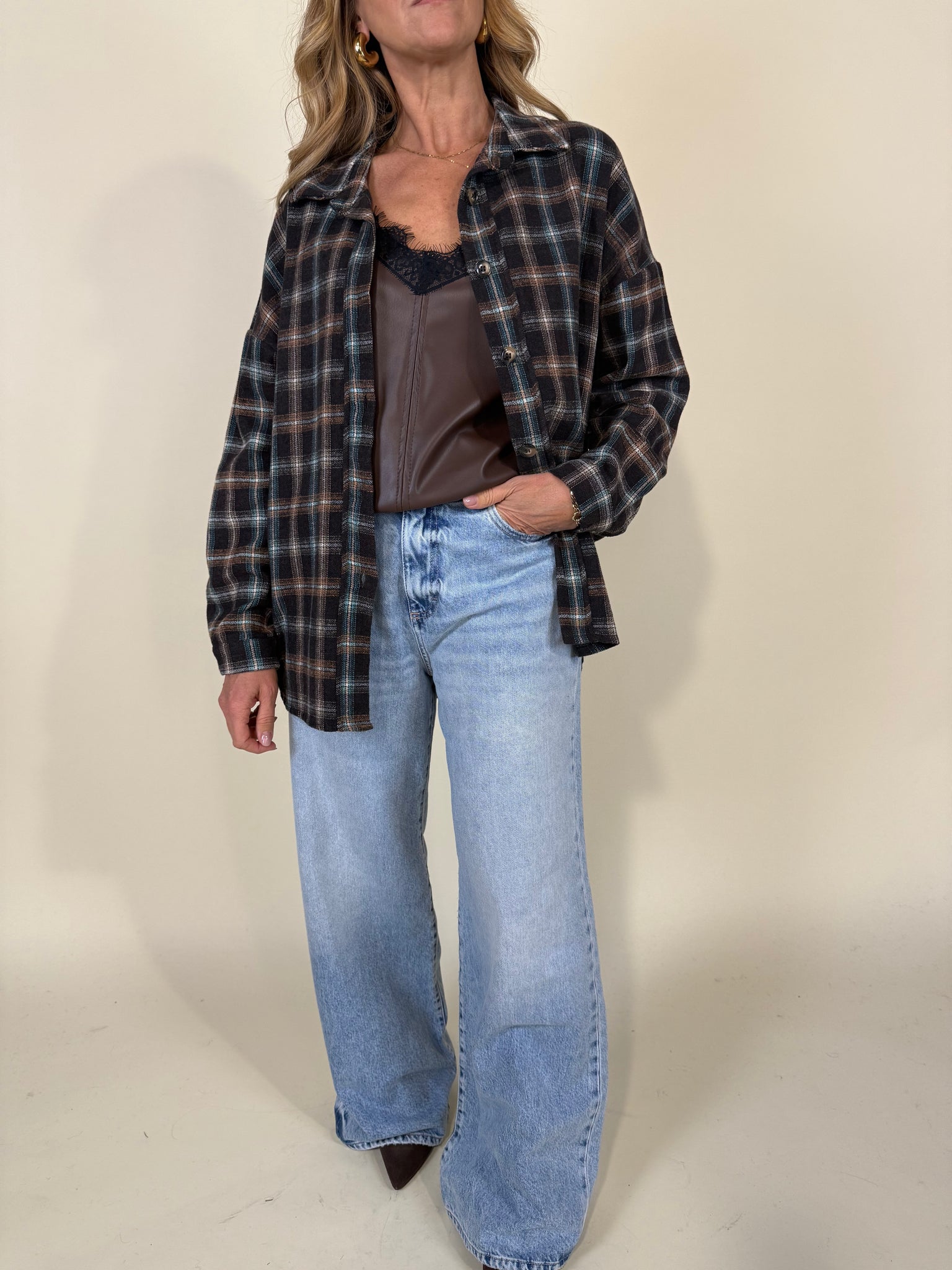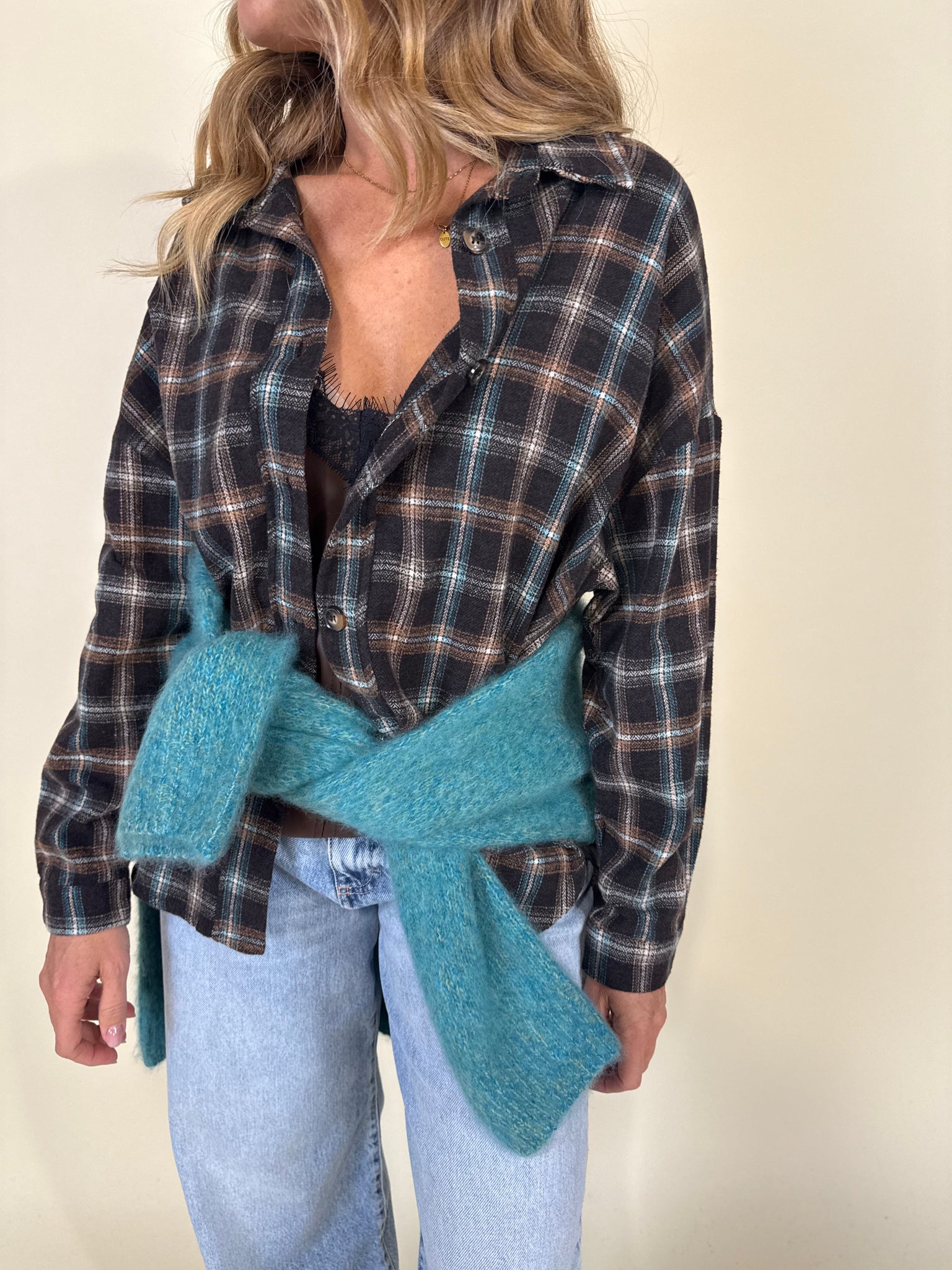 Camicia modello check oversize sui toni del moro, calle e celeste a contrasto. Tessuto al tatto simil flanella.