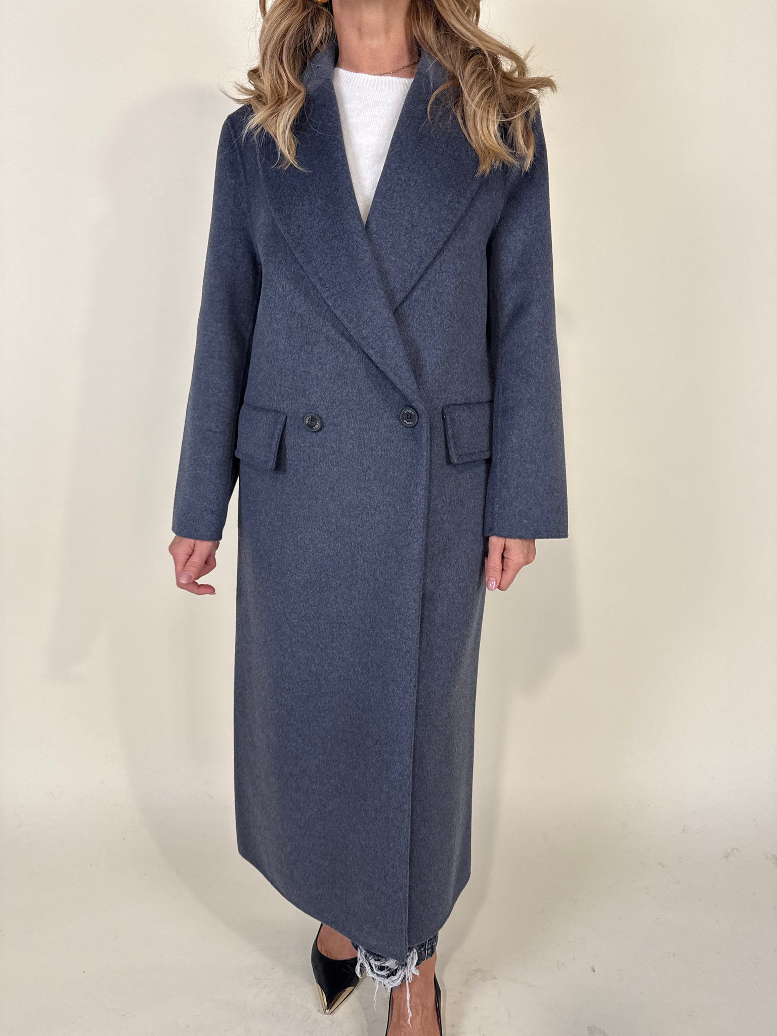 Cappotto lungo disponibile nella variante colore grigia. Modello regolare con rever ampio a lancia. Chiusura doppiopetto con doppi bottoni tono su tono. Capo cucito in tessuto double. Taschine applicate a ricamo.