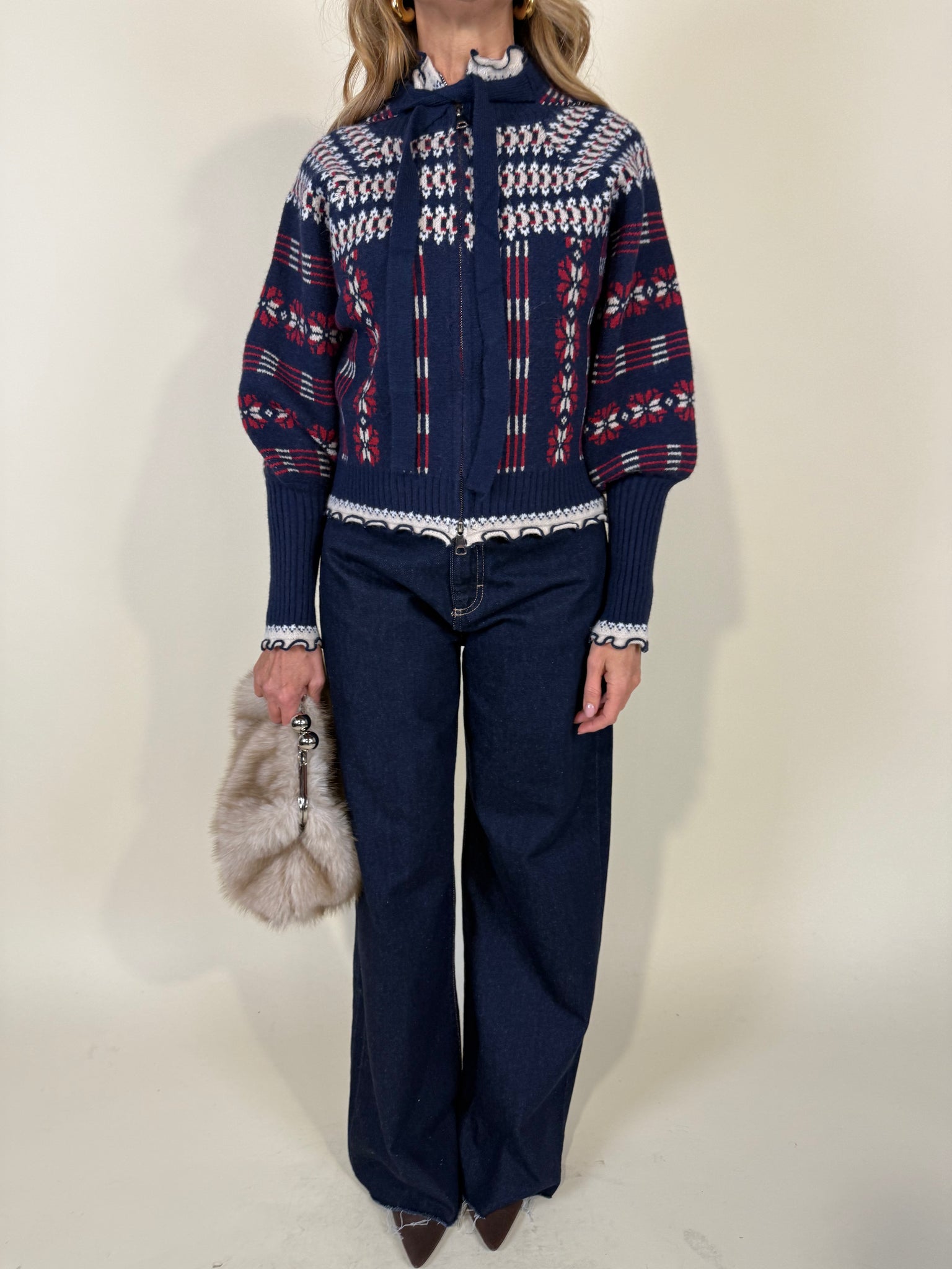 Cardigan disponibile nella variante blu notte con dettaglio fantasia sui toni del panna e del bordeaux. Dettaglio colletto con chiusura a laccetto tono su tono. Chiusura con zip centrale in metallo.