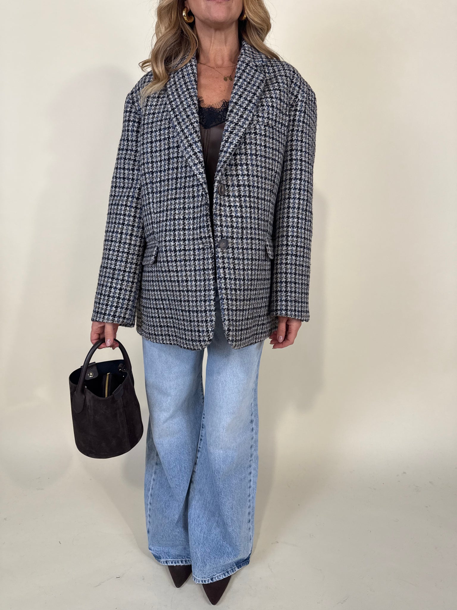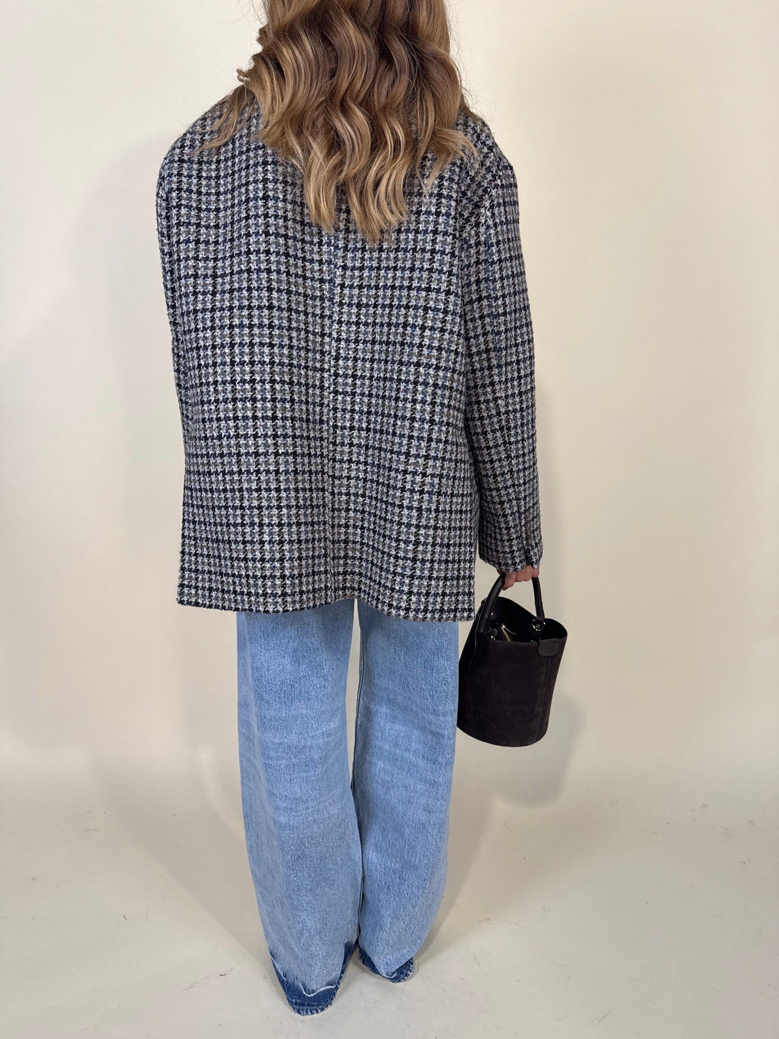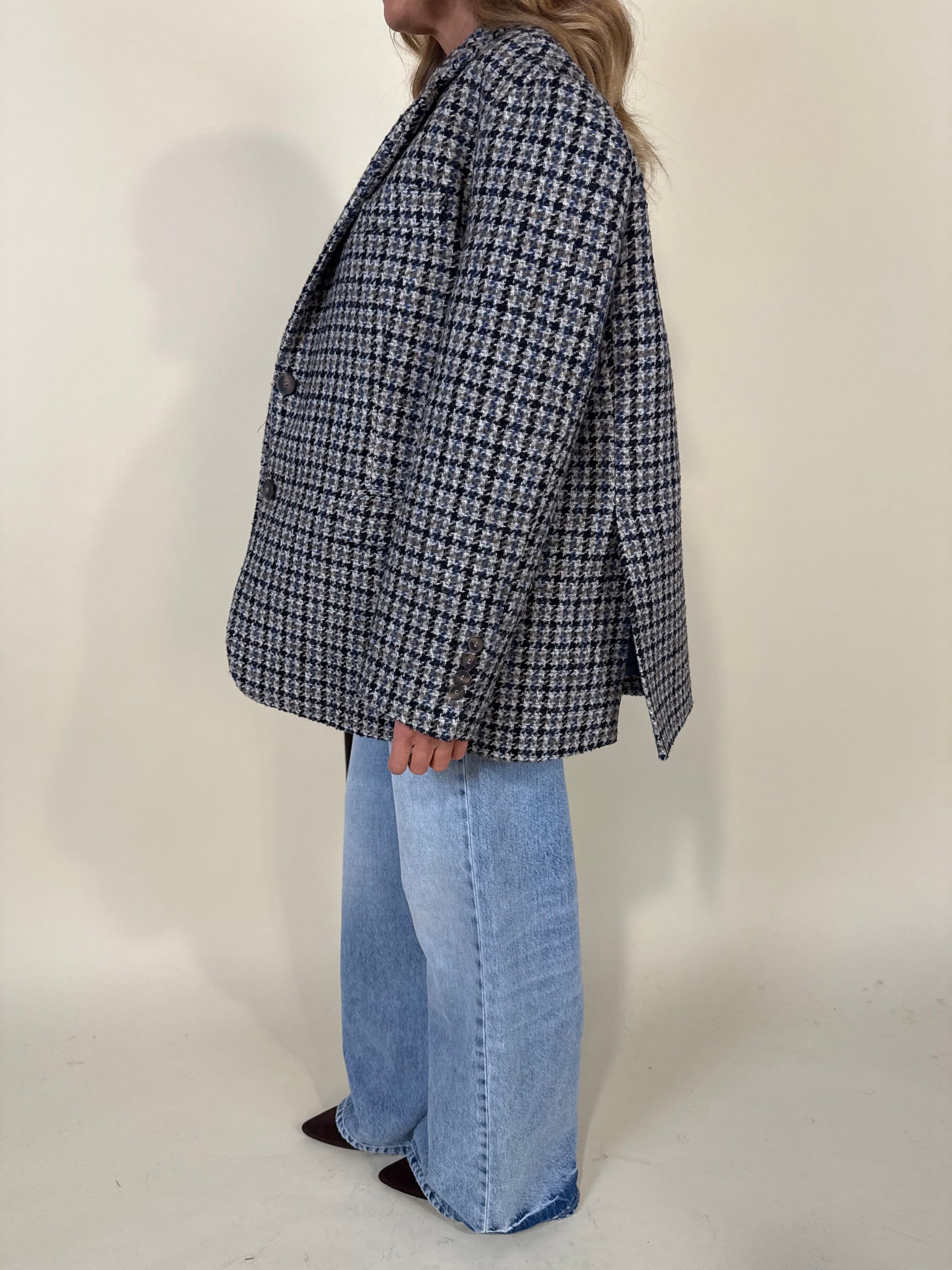 Giacca modello oversize in misto lana in trama pied de poule sui toni del moro e del panna. Modello chiusura monopetto a doppio bottone con rever e taschine taglio classico applicate frontali. Fodera interna.