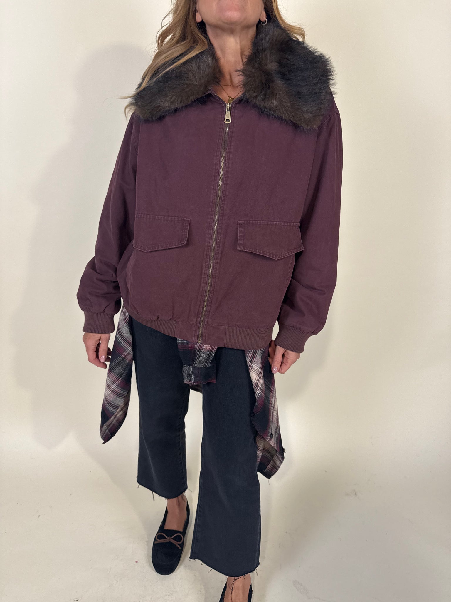 Giubbotto imbottito modello bomber in tessuto spalmato nella variante colore vino unica. Modello con collo in ecopelliccia in visone. Modello con zip centrale dorata. Modello con tasche applicate frontali.