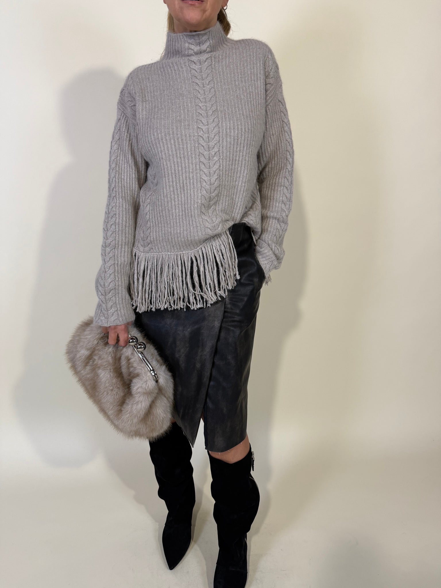Gonna modello longuette nella variante ecopelle sfumata effetto invecchiato. Dettaglio pieghe sul fondo e chiusura con zip sul retro nascosta dalla cucitura. Fodera interna tono su tono.