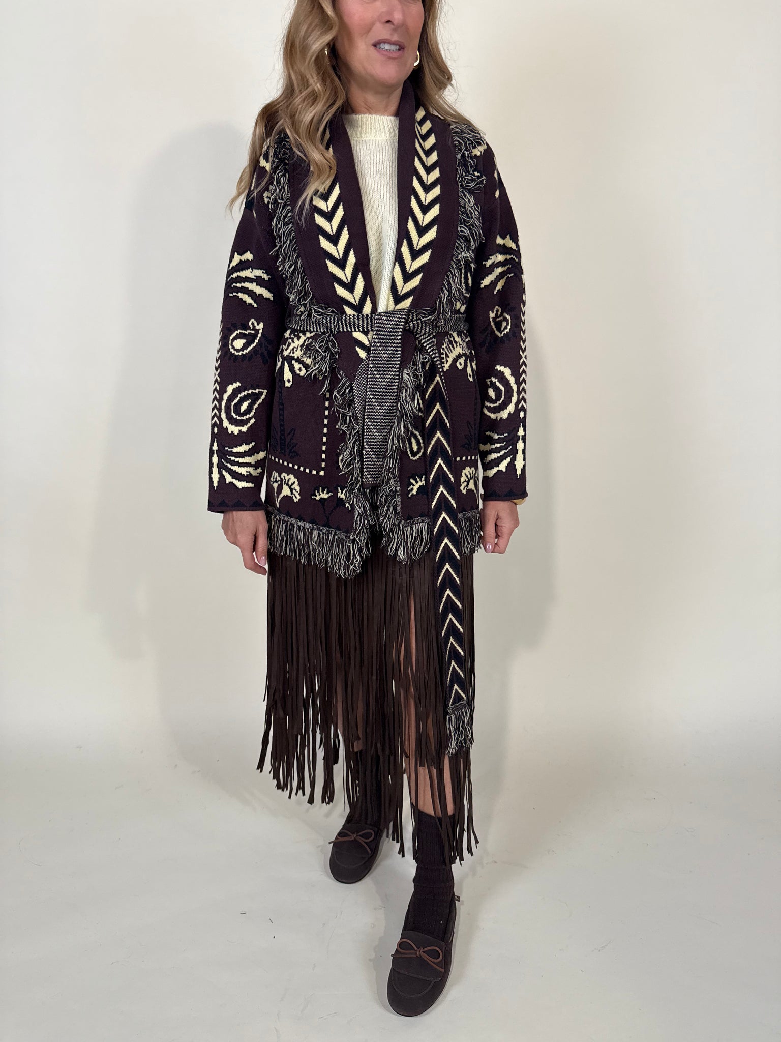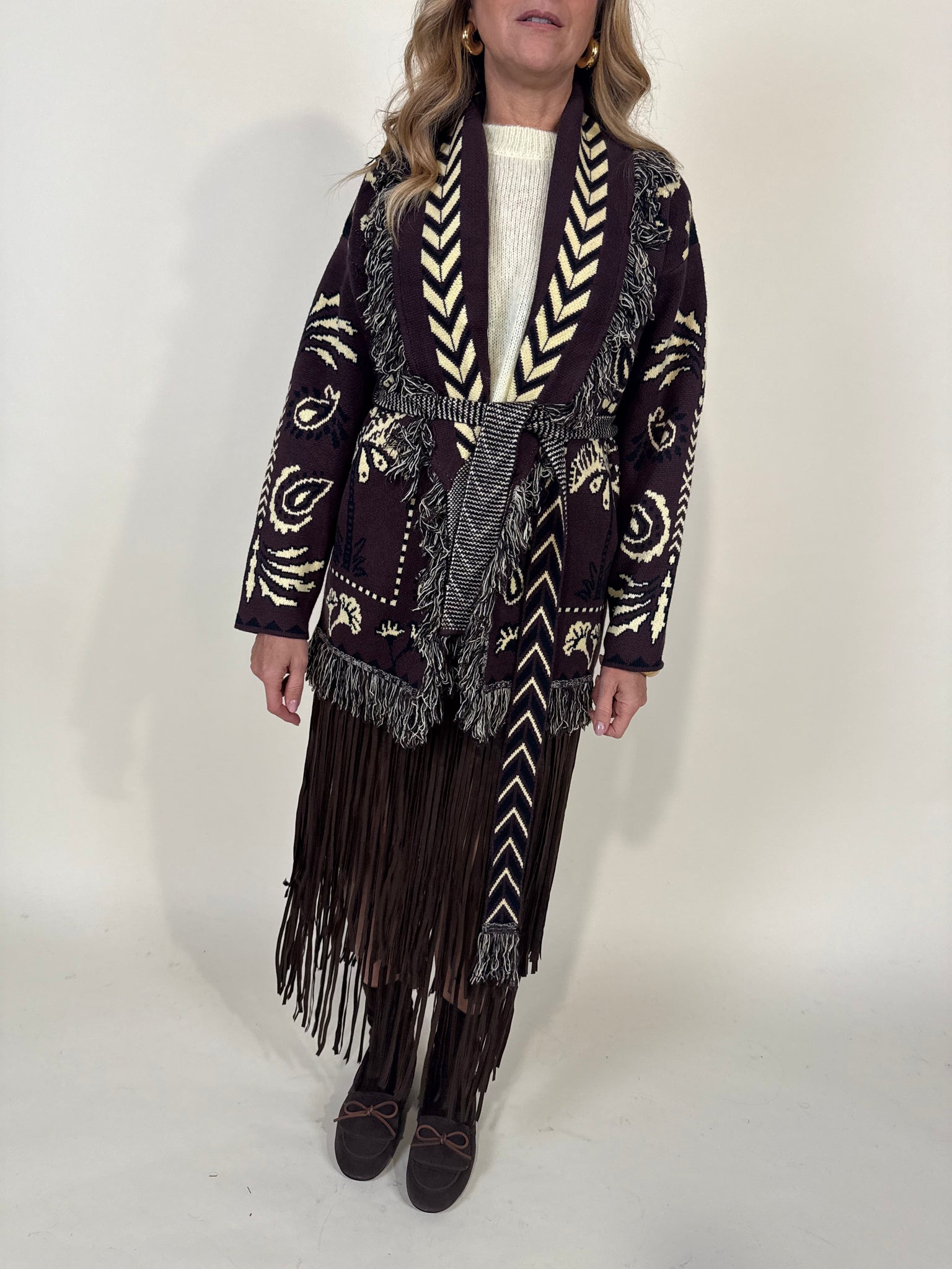 Gonna modello mini in tessuto suede con dettaglio maxi frange lunghe a doppia balza. Modello con chiusura a zip sul retro a cucitura tono su tono.