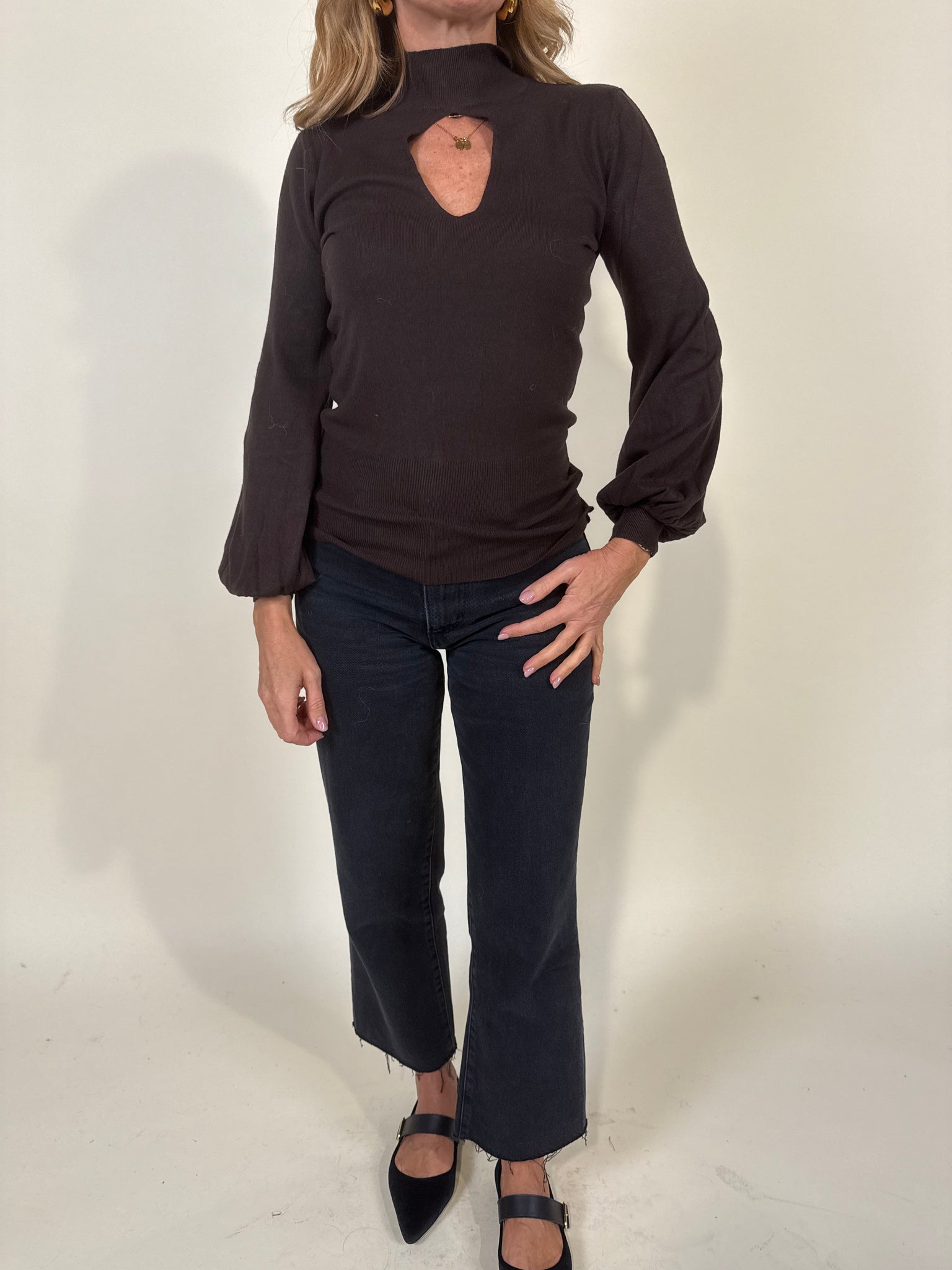 Maglia manica lunga con dettaglio goccia frontale disponibile nelle varianti colore moro e nero. Modello lupetto.