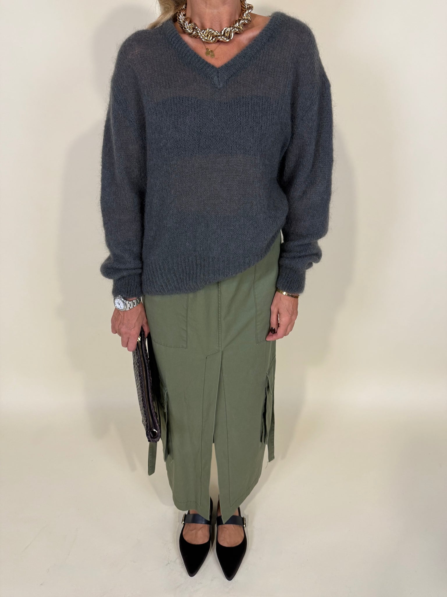 Maglione morbido disponibile nella variante colore oliva e blu notte. Dettaglio scollo a V e filato sottile.