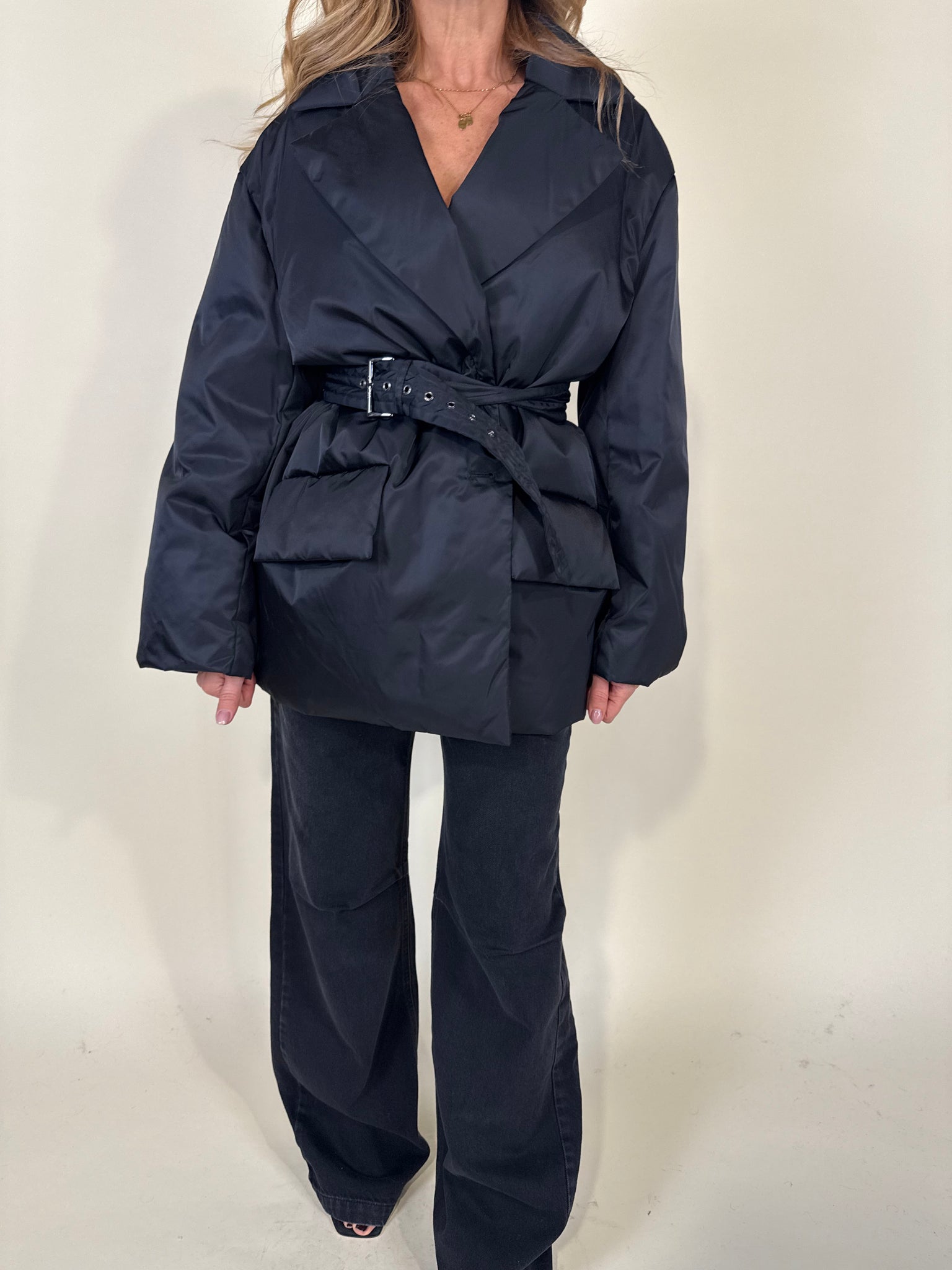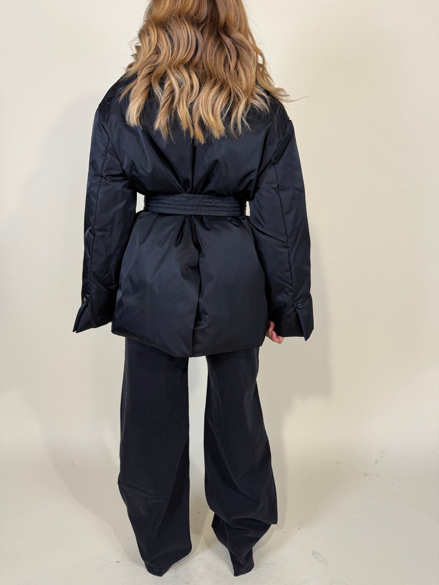 Piumino caldissimo in vera piuma disponibile nella variante colore unica nera. Modello chiusura a monopetto con rever simil giacca. Modello con tasche applicate frontali. Cintura annessa regolabile tono su tono. Foderato.