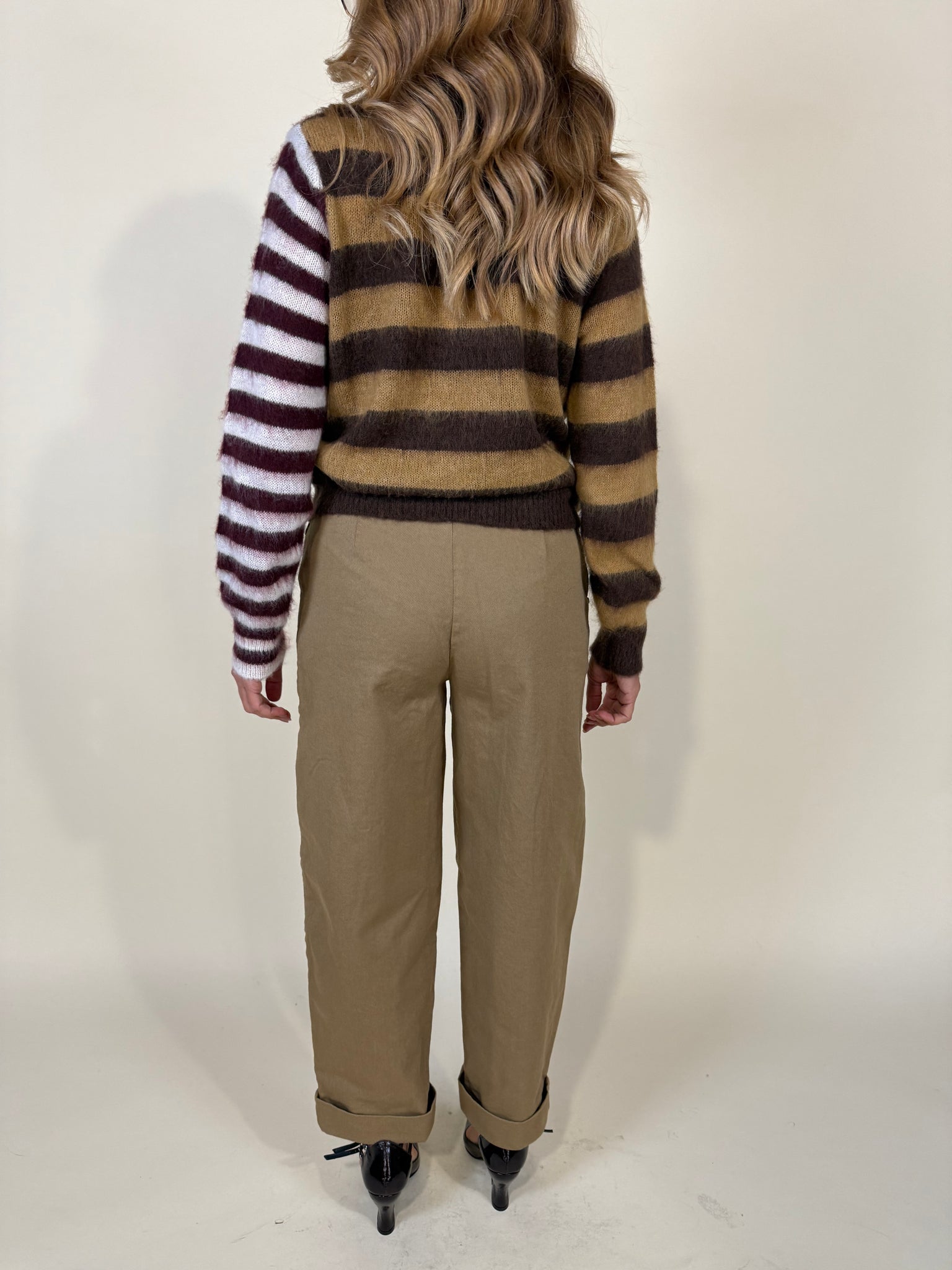Maglioncino in filato sottile in mista lana disponibile nella variante in stampa a fantasia rigata doppia sui colori del moro e camel e del panna e vino a contrasto. Modello girocollo.