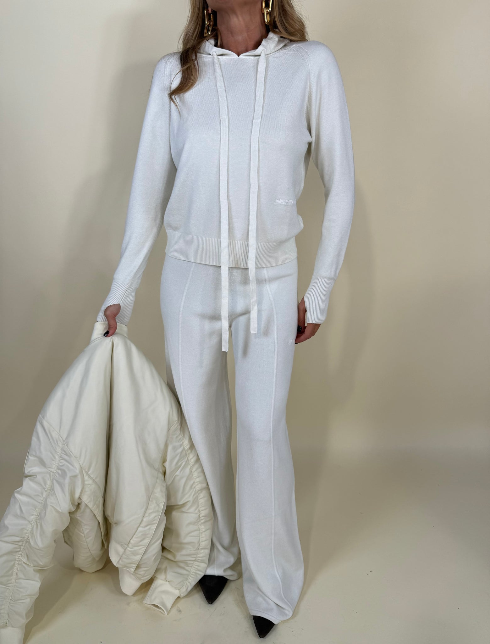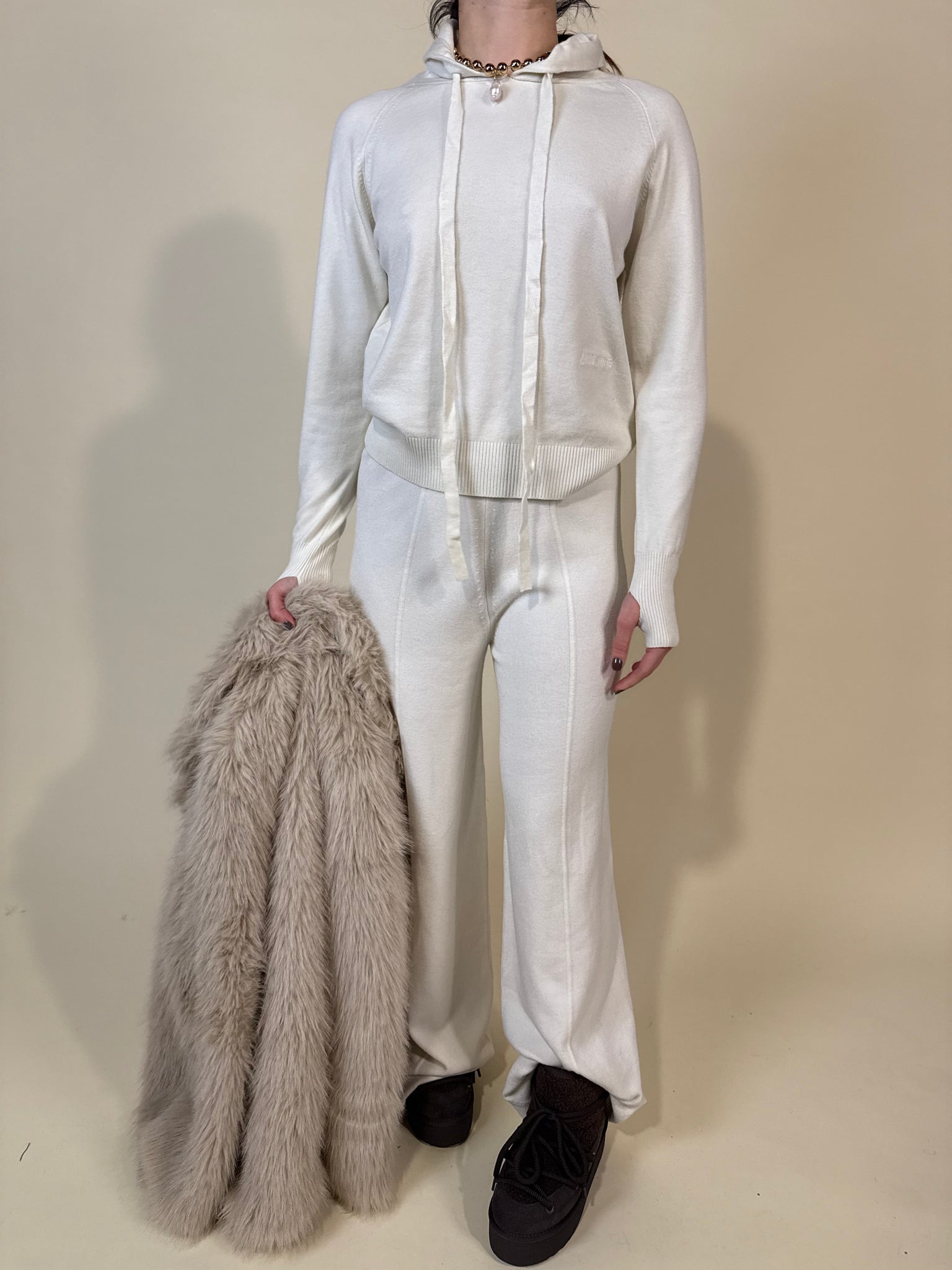 Felpa in maglia disponibile nella variante colore burro. Dettaglio cappuccio con coulisse tono su tono. Fondo felpa a fascia a costina tono su tono.