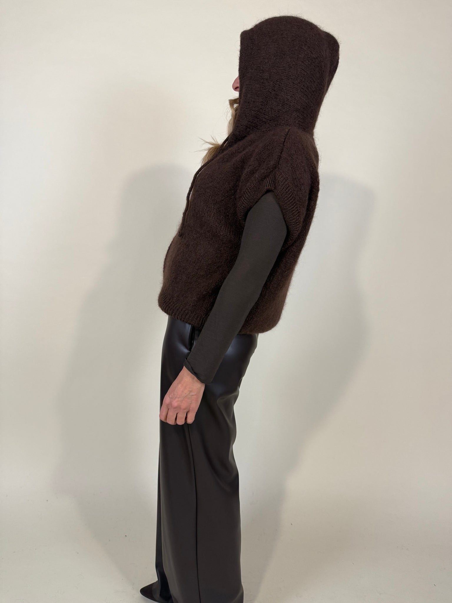 Gilet con cappuccio disponibile nel colore moro. Gilet con chiusura cerniera e laccetti regolabili. Tessuto in 10% lana 40% mohair 28% acrilico 22% poliammide.