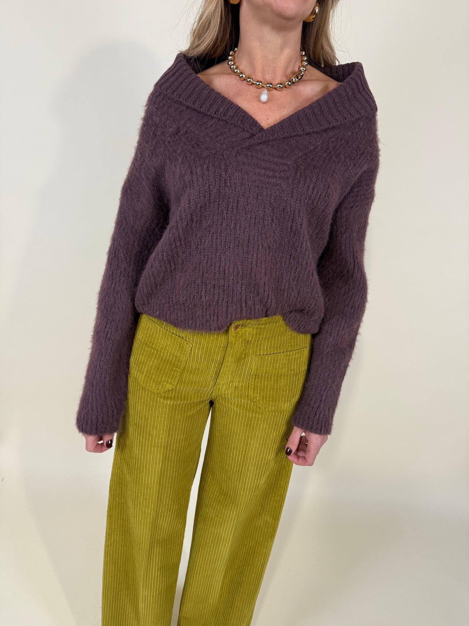 Maglione morbido sartoriale nella variante colore unica burgundy polverosa. Dettaglio collo a V morbido a maxi coste. Dettaglio filato a mini costine.