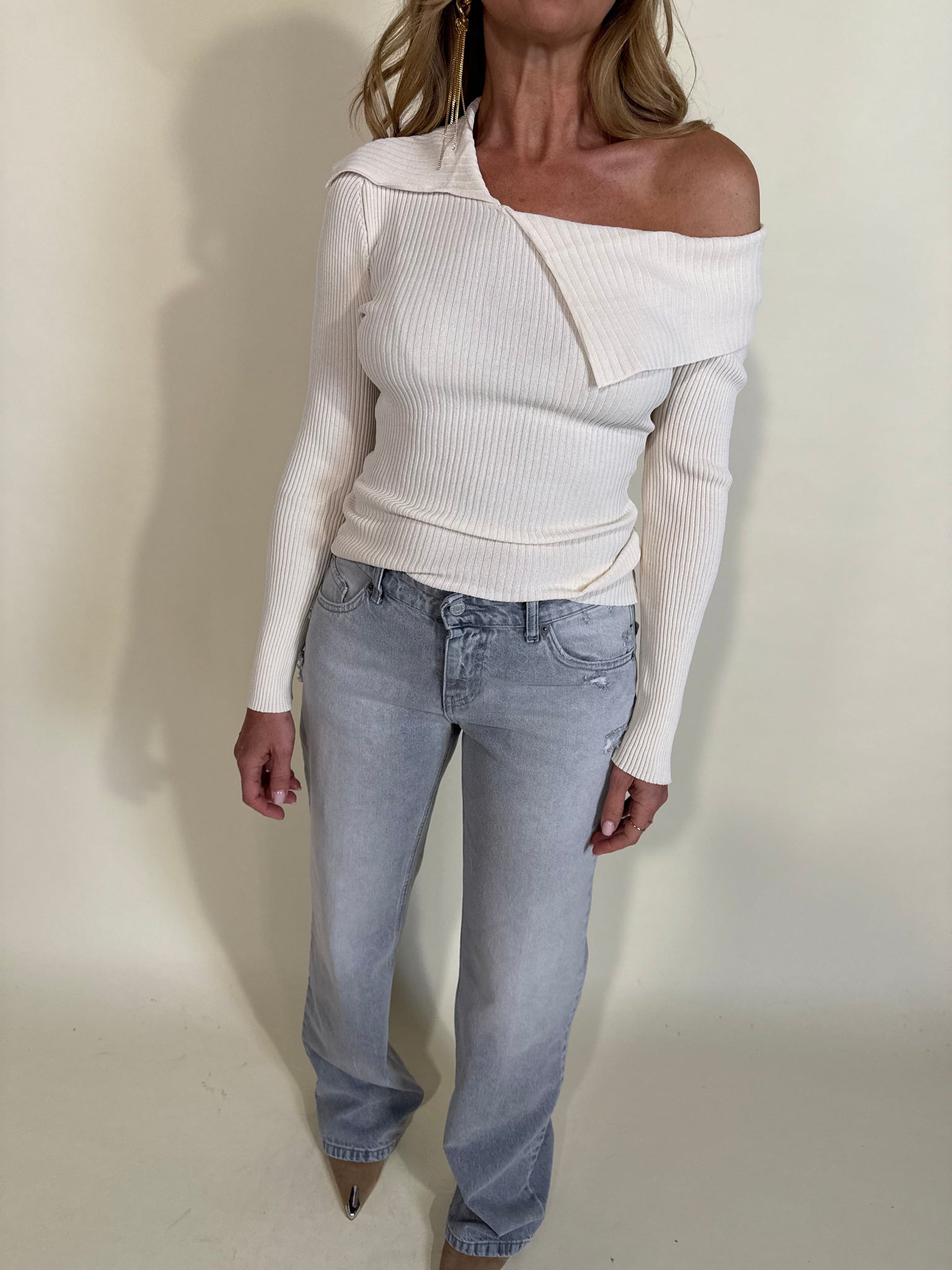 Maglia modello microcostina disponibile nella variante colore unica crema. Modello manica lunga con dettaglio collo morbido a polo. Tessuto elasticizzato.