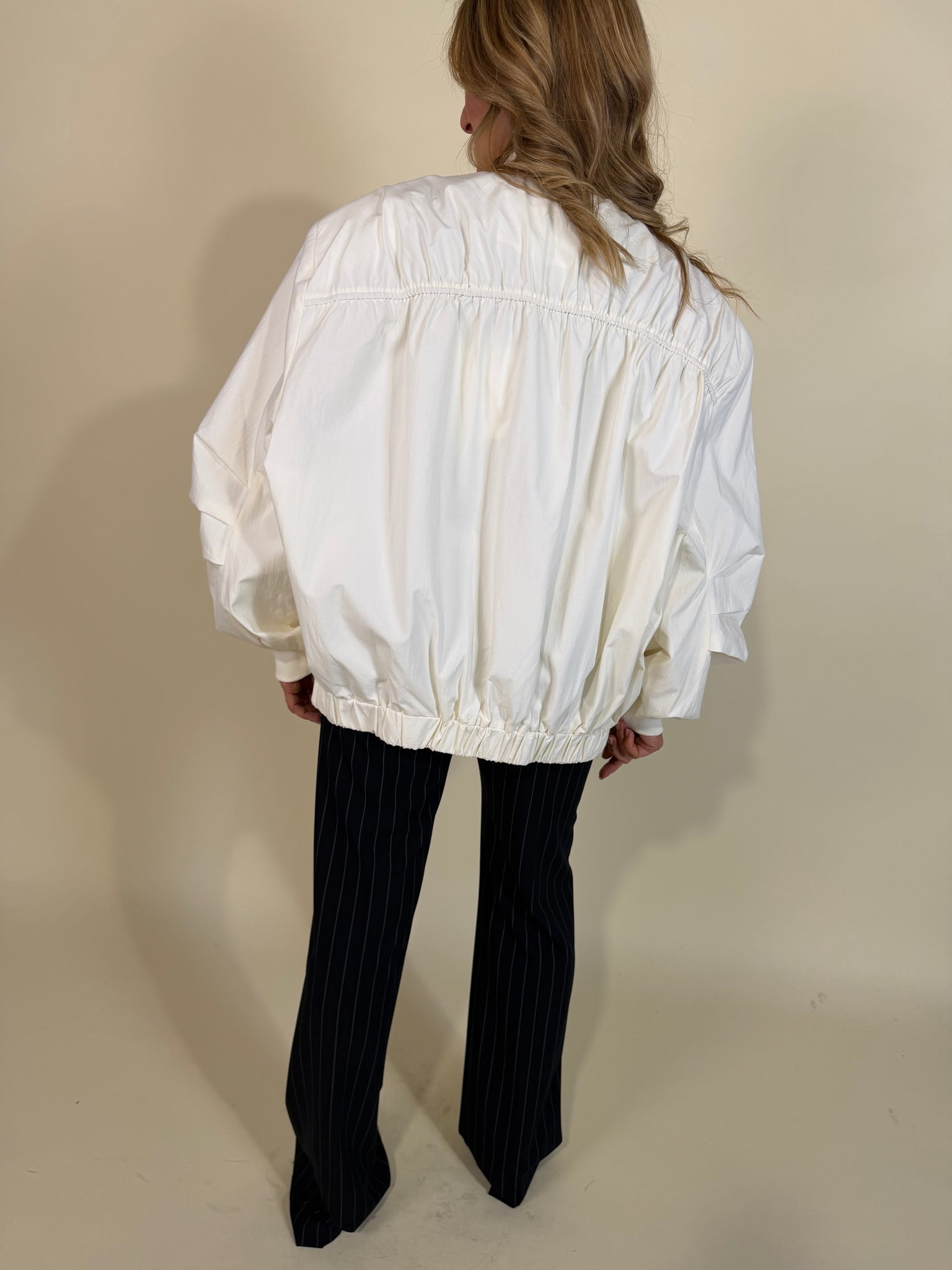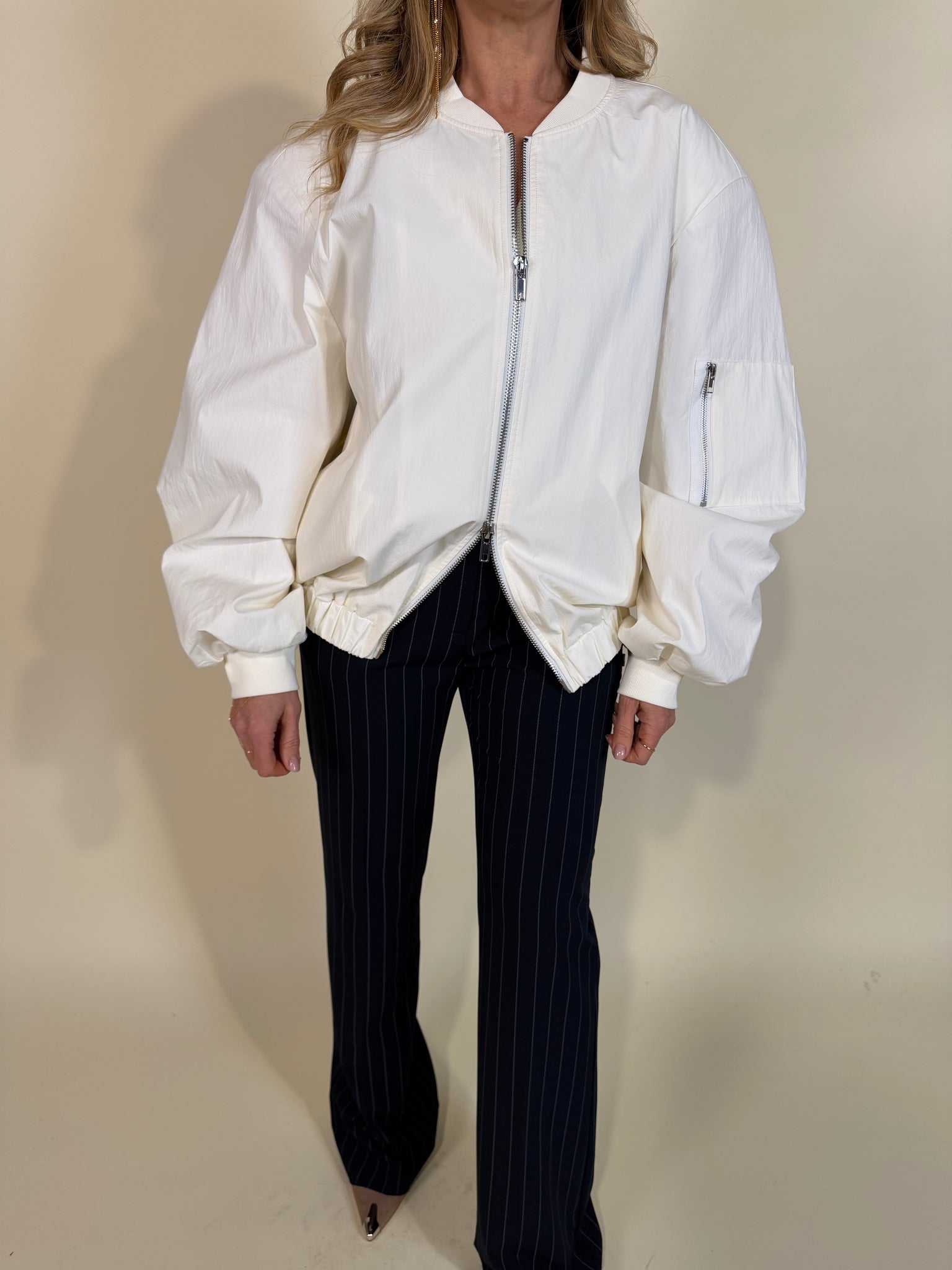 Bomber modello oversize in tessuto misto cotone disponibile nella variante colore unica bianco latte. Modello con chiusura a zip in metallo centrale. Dettaglio tasca a zip sulla manica. Fondo bomber con elastico e arricciatura. Fodera interna tono su tono.