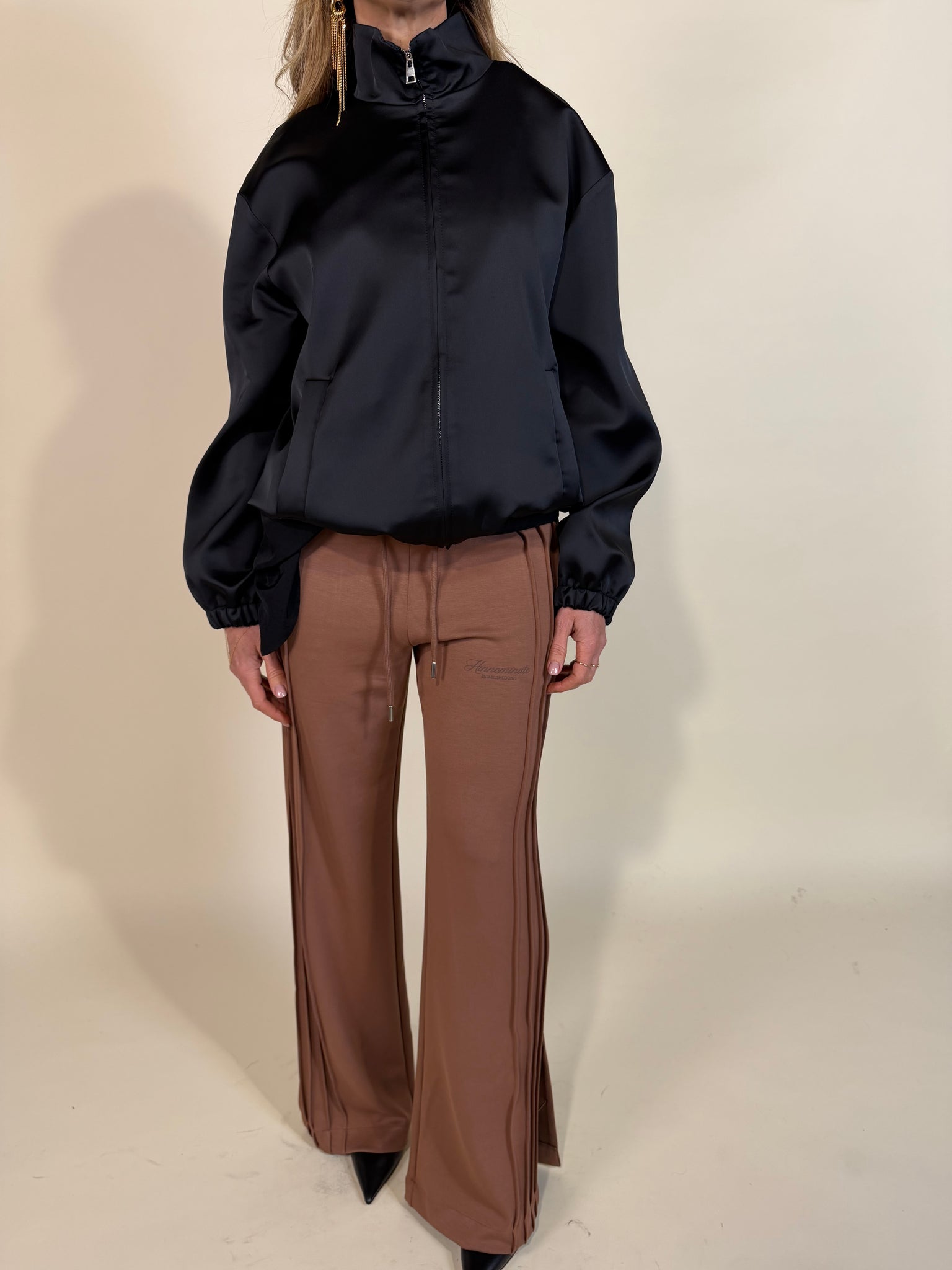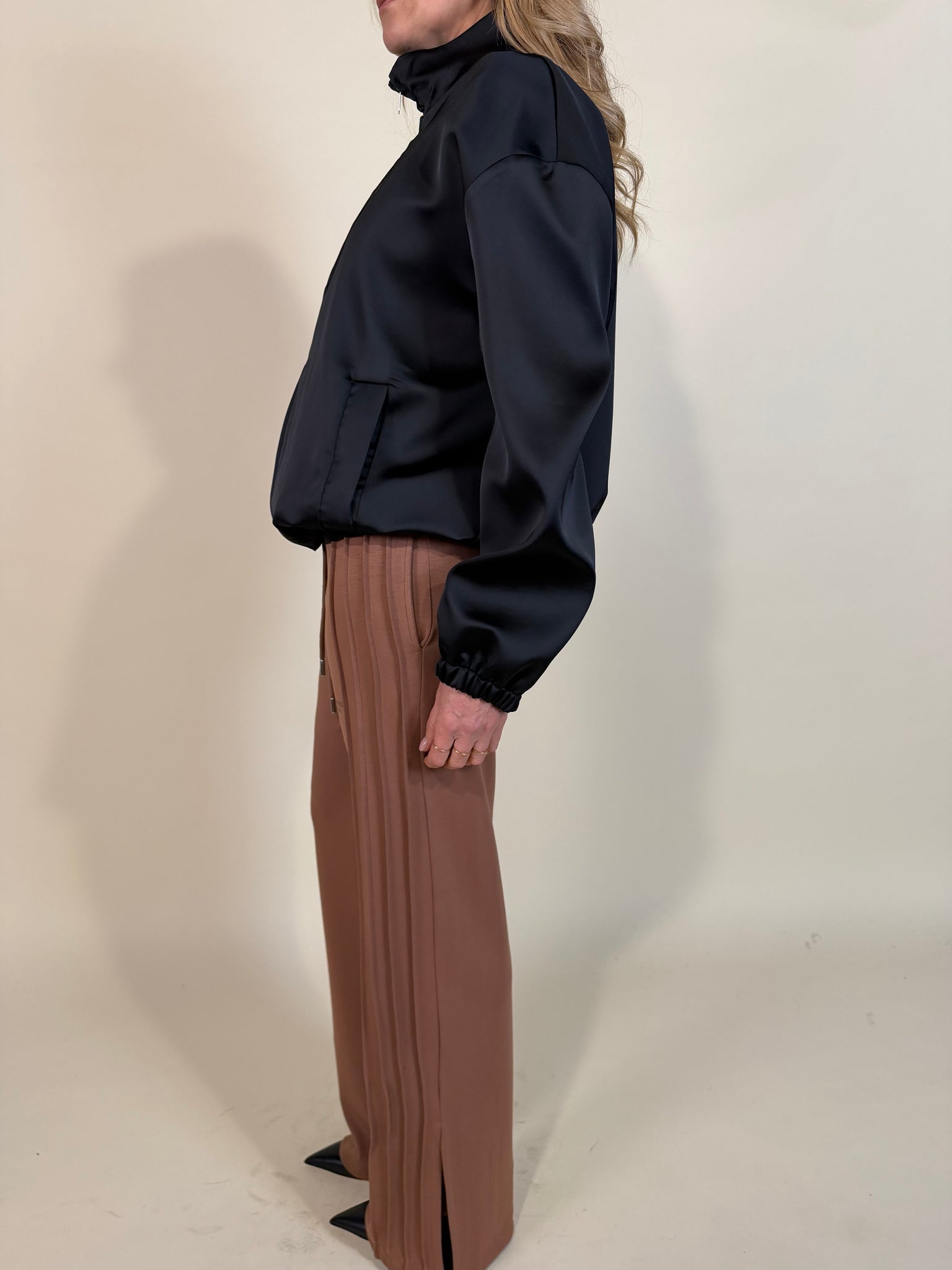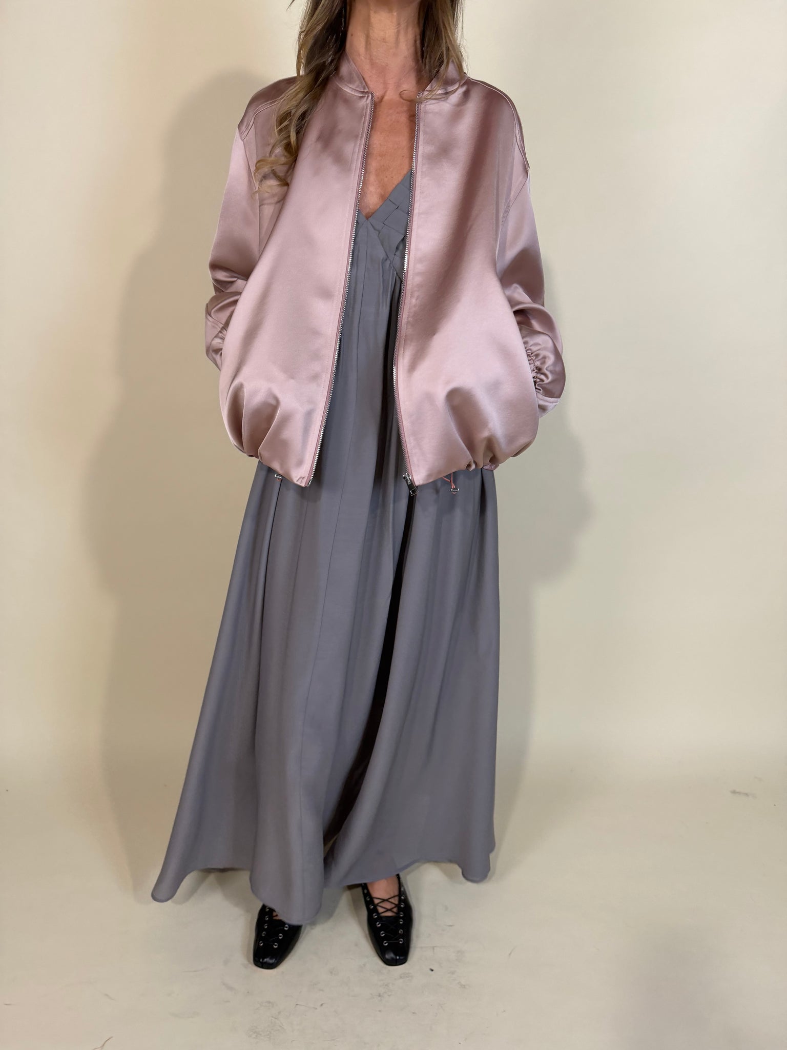 Bomber morbido scivolato in tessuto satinato disponibile nella variante colore rosa antica e nera. Modello con spalla scesa e chiusura con zip centrale in metallo. Modello con polsino e fondo bomber ad arricciatura con coulisse tono su tono. Dettaglio tasche applicate frontali. Modello foderato.