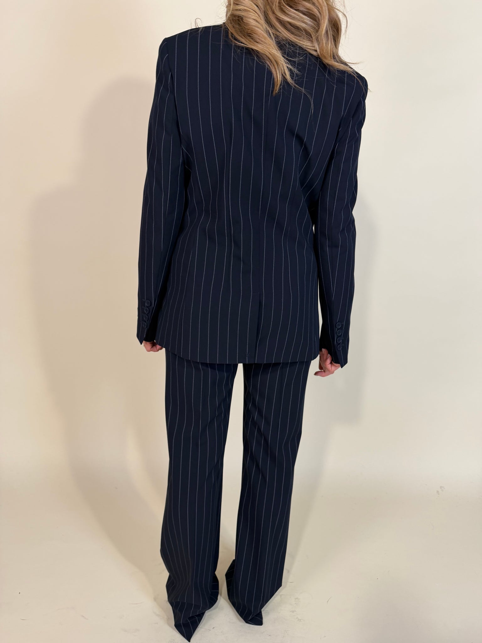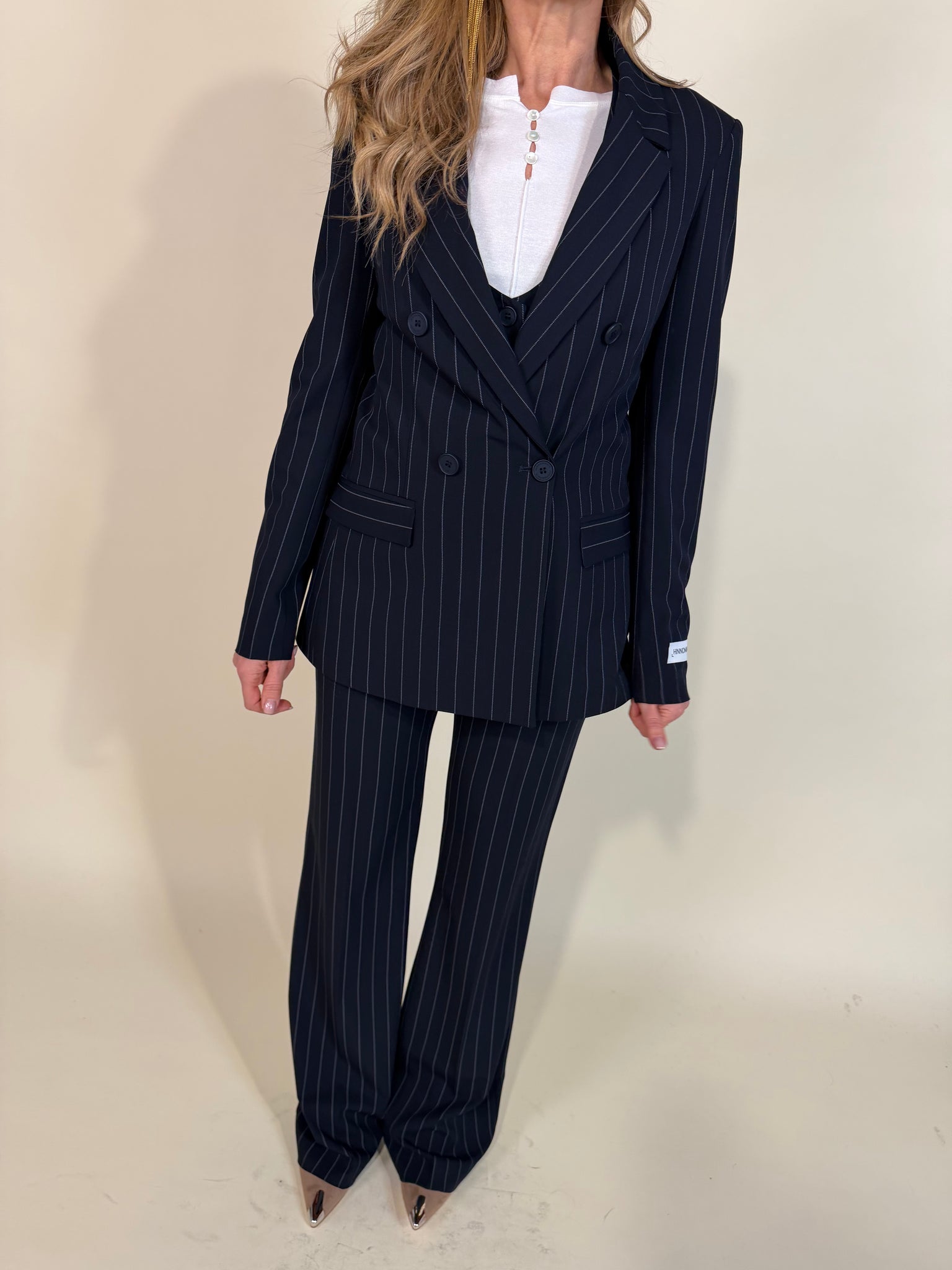 Giacca sartoriale modello oversize con spalla regolare disponibile nella variante colore unica blu notte con micro gessatura. Modello con chiusura a doppiopetto con dettaglio taschino taglio classico. Manica con polso con patch logo e bottoni. Fodera interna.